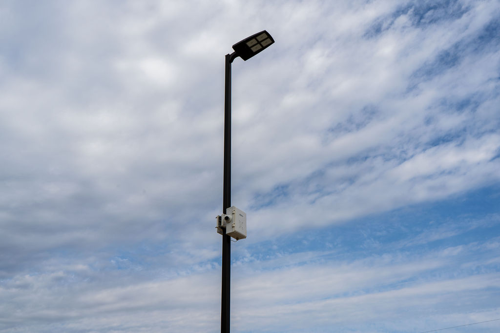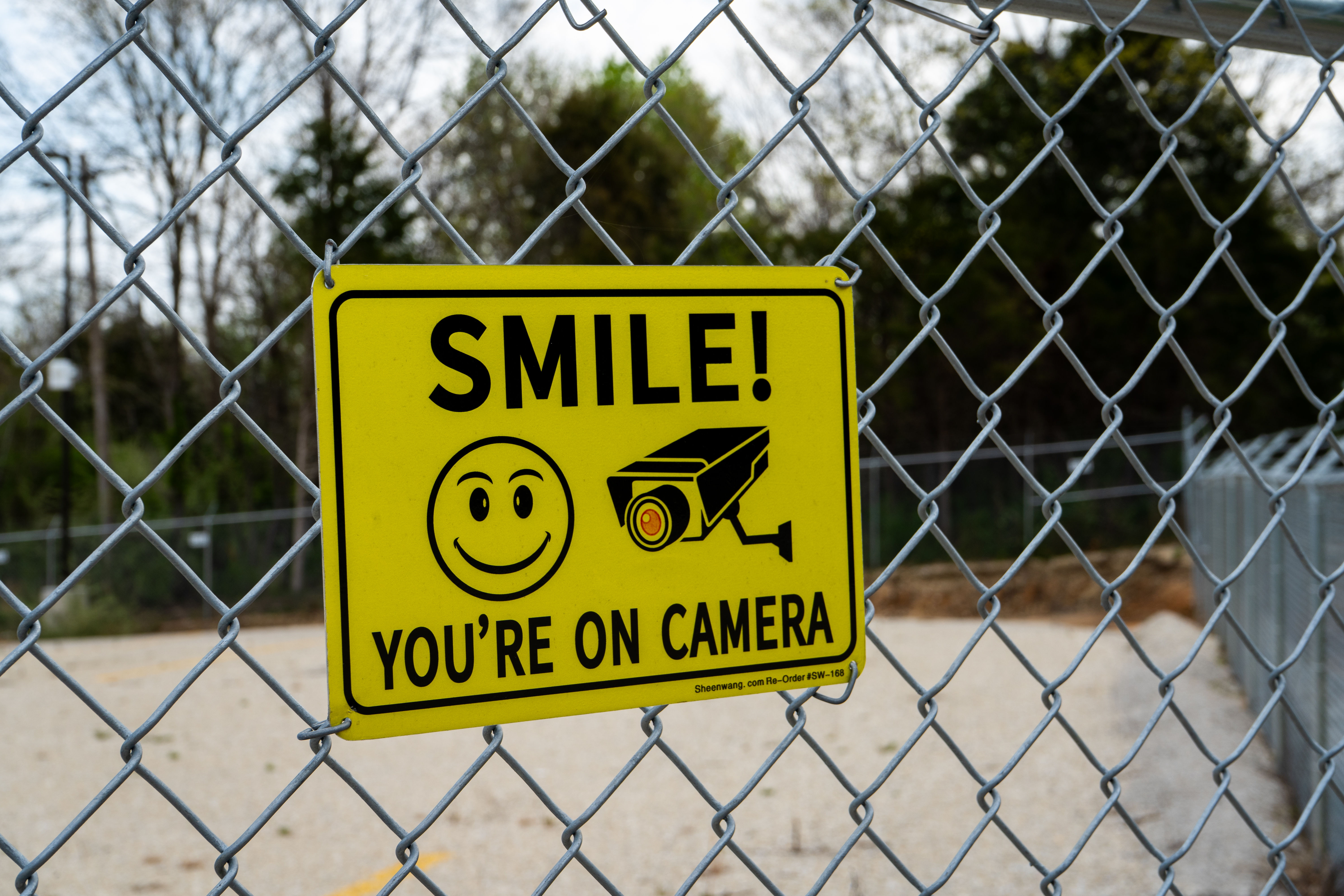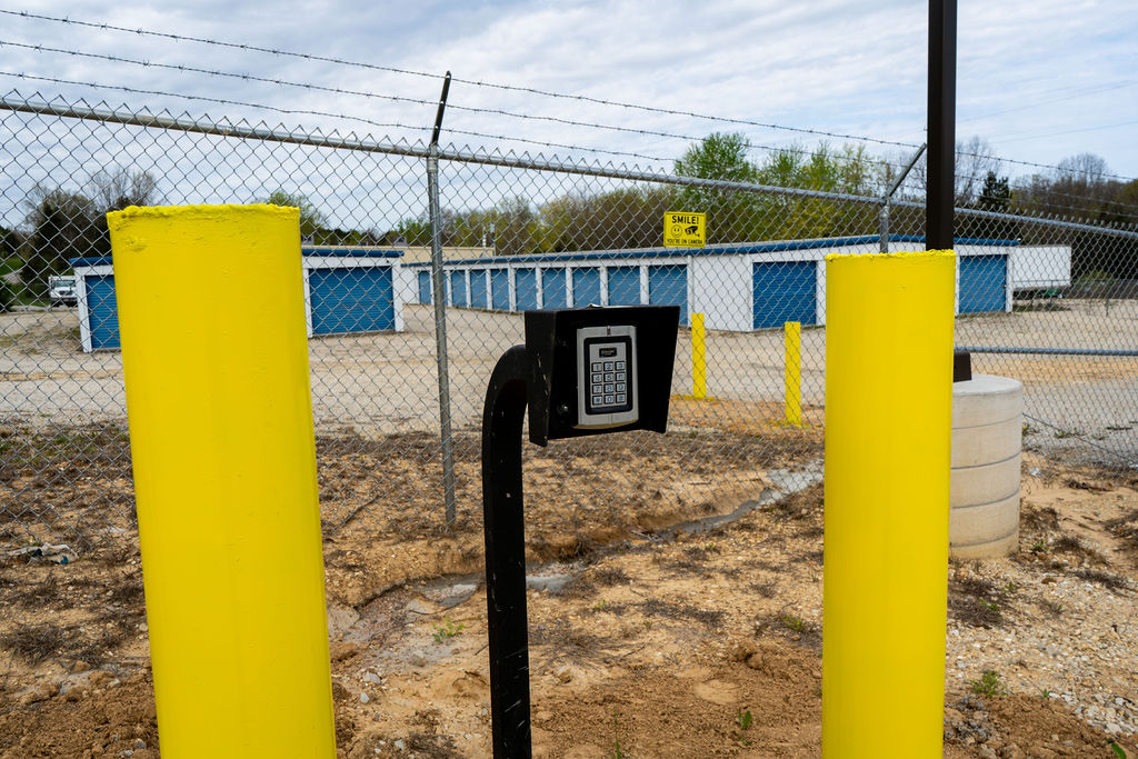 Fenced contractor storage lot with security features for rent.