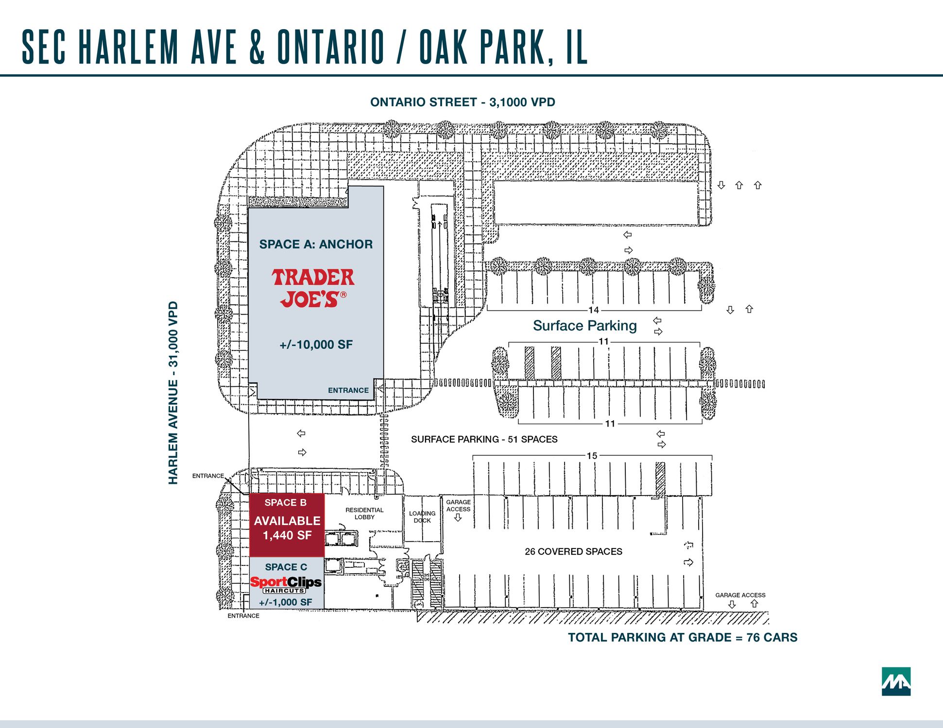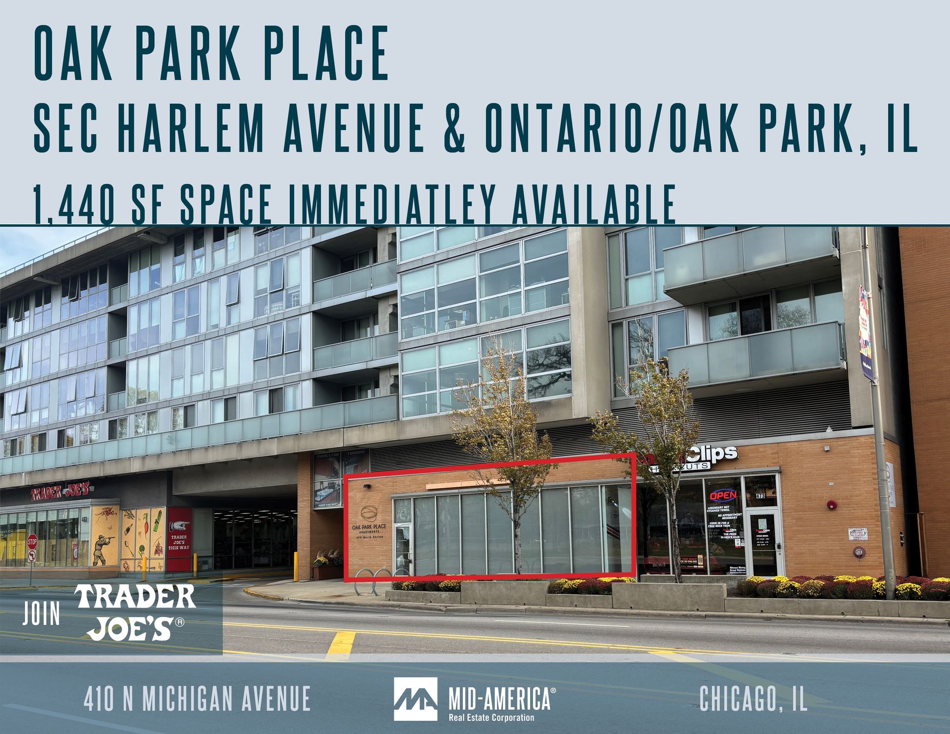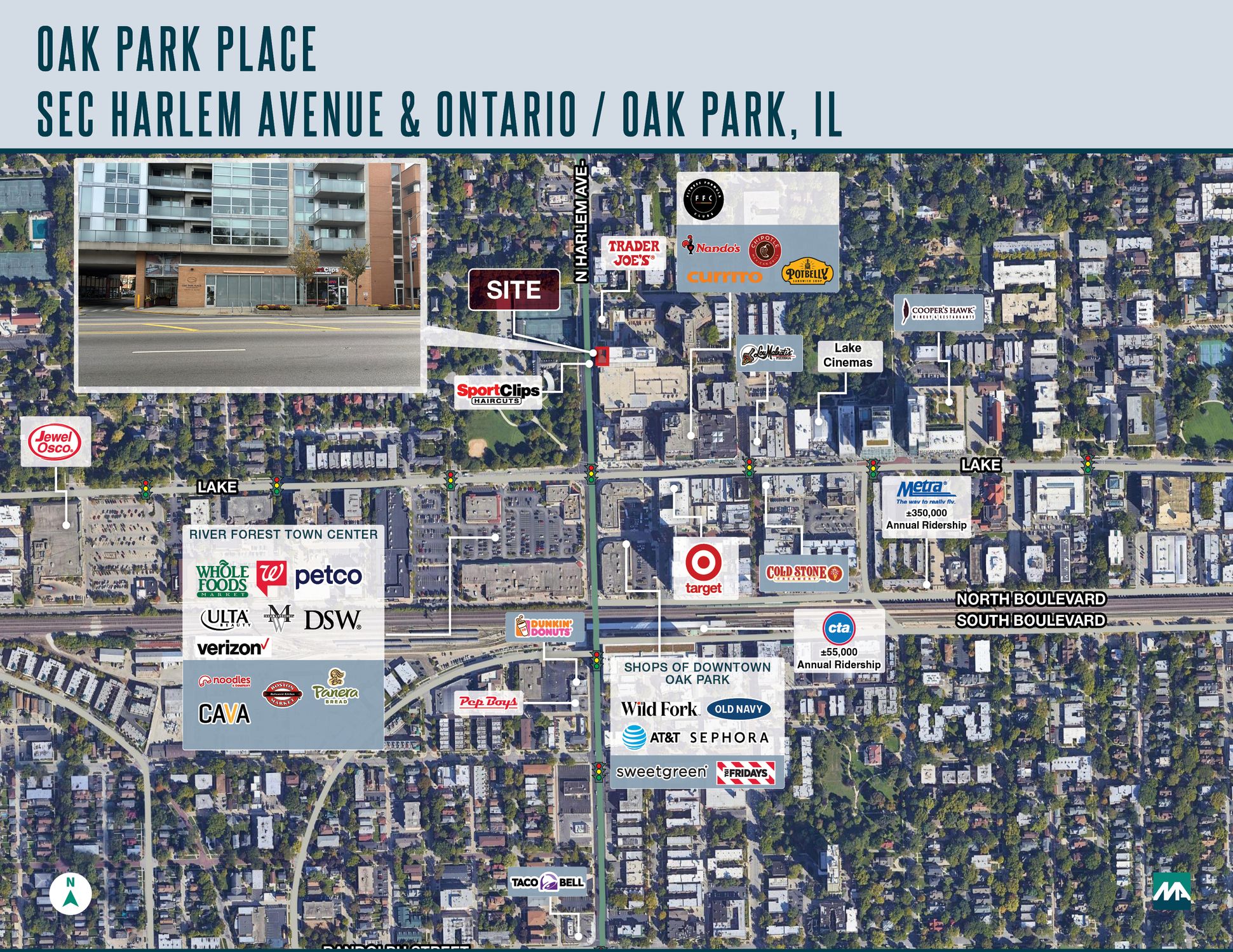 Located at the southeast corner of Harlem Avenue and Ontario, this retail space offers approximately 1,440 square feet. The space features approximately 25 feet of frontage facing Harlem Avenue. A 700-car public parking garage is situated to the south. Shared retail parking is available for approximately 76 cars, including 26 covered spaces.