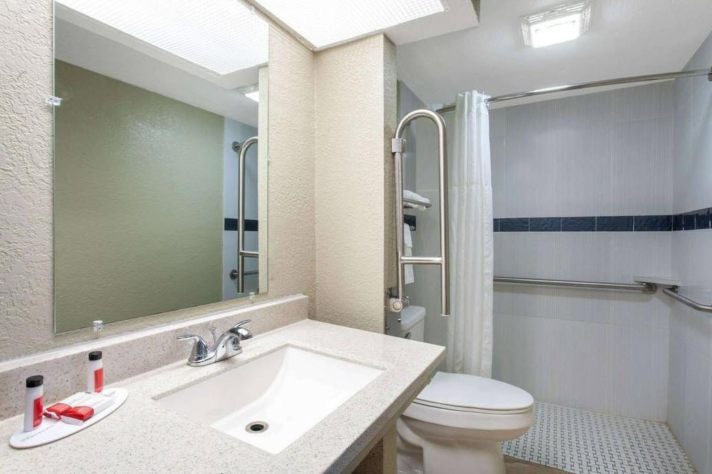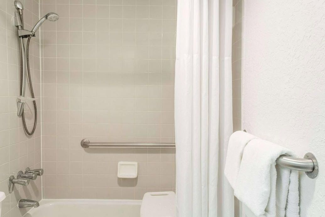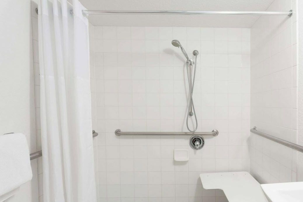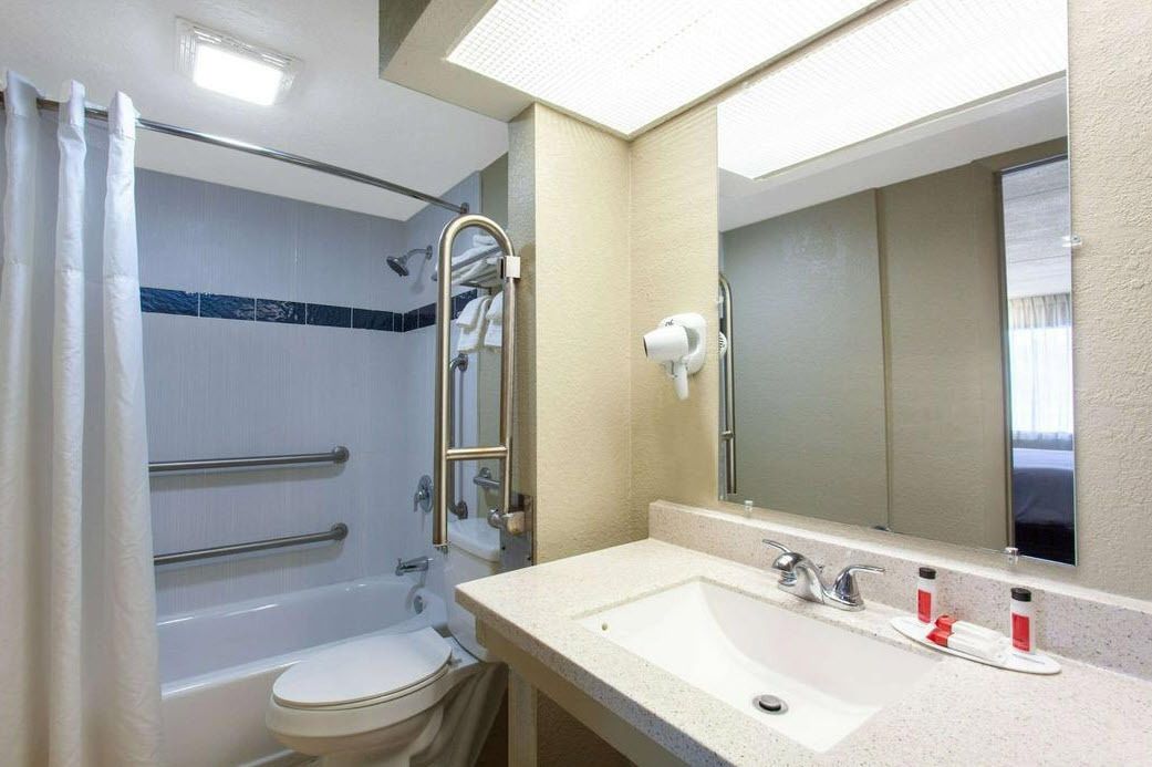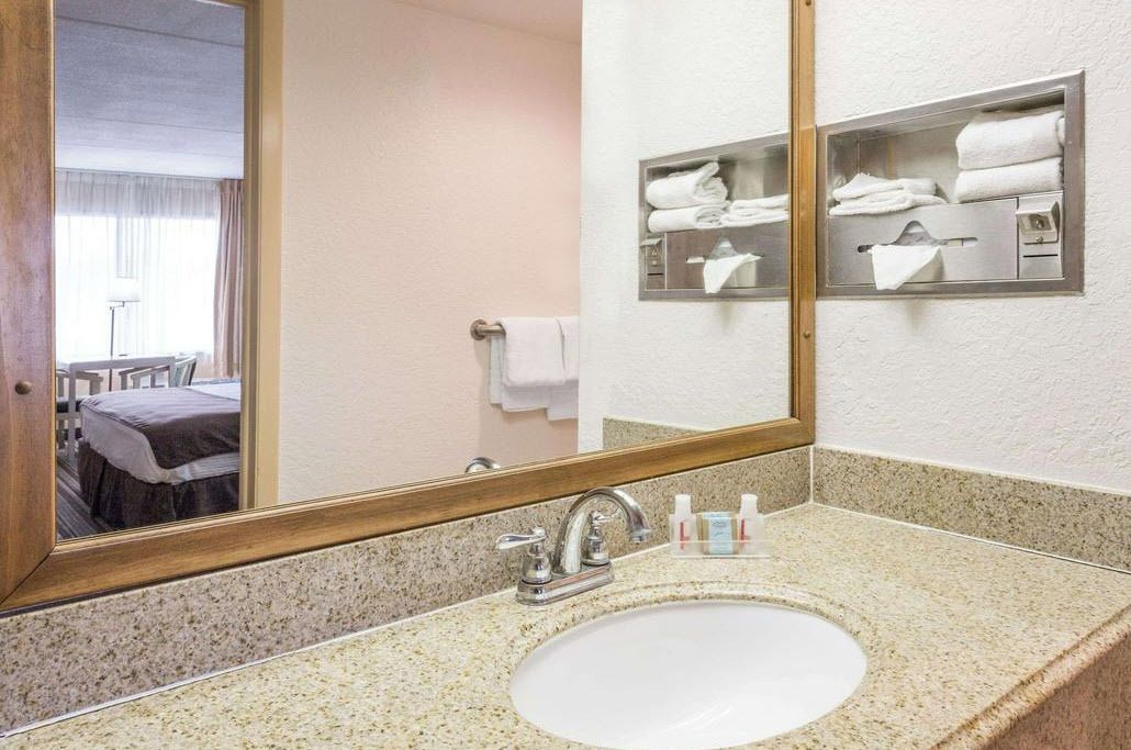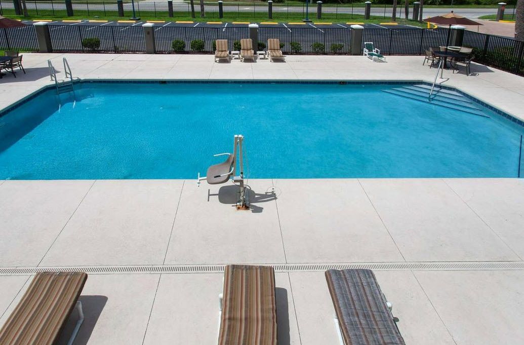 Two-story hotel with suites, pool, and ample parking.