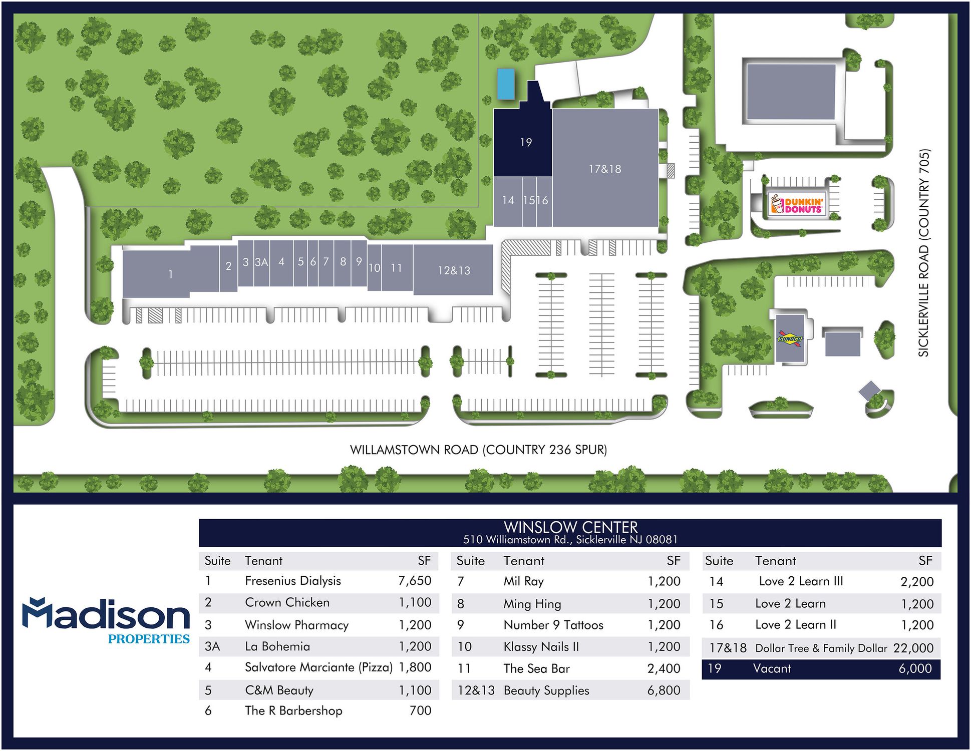 This retail space, featuring an open floorplan and one restroom, is available for lease. The property is located on the corner of Williamstown Road and Sicklerville Road. Showings are available by appointment. The property size is 60000 square feet.