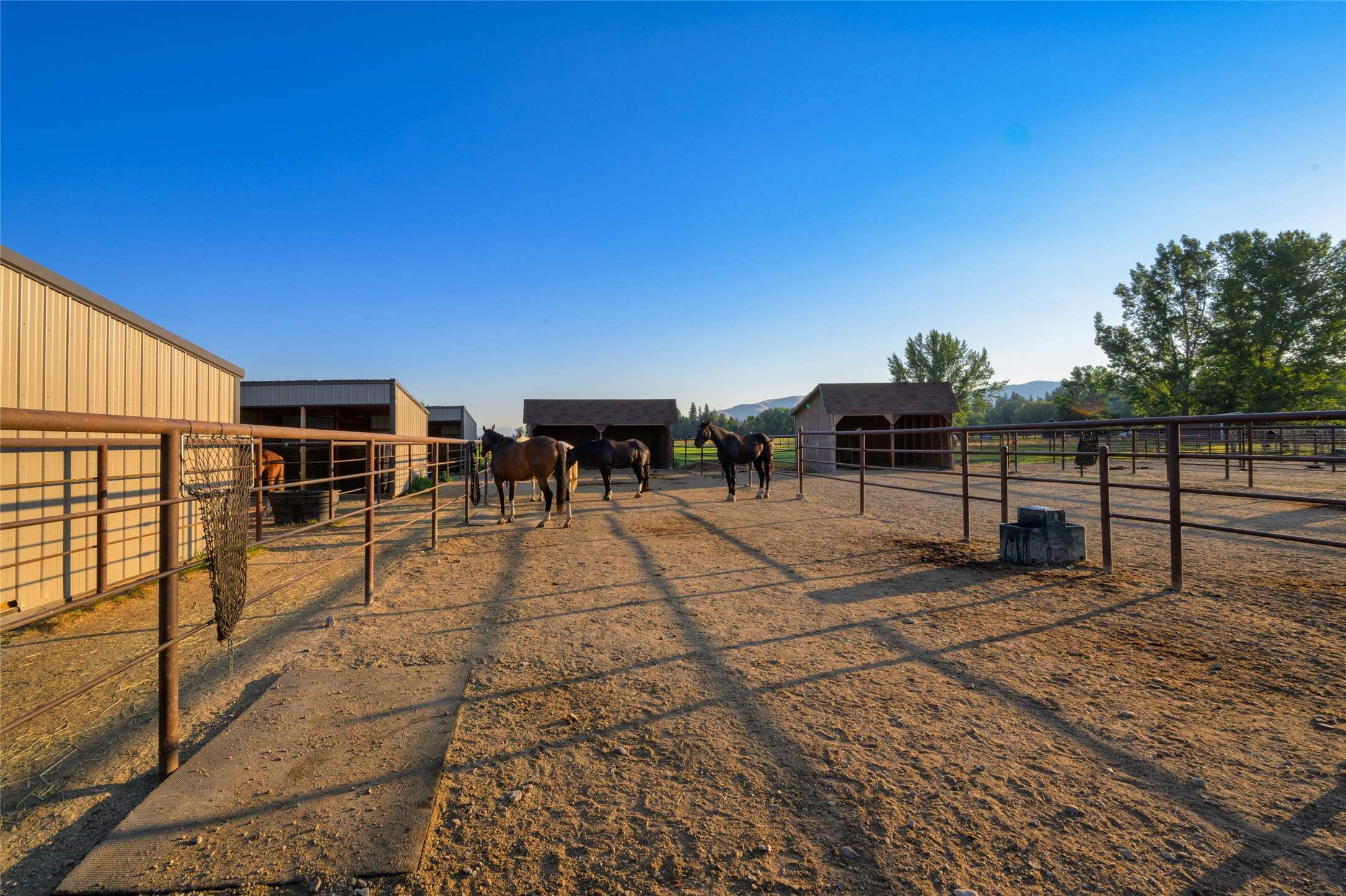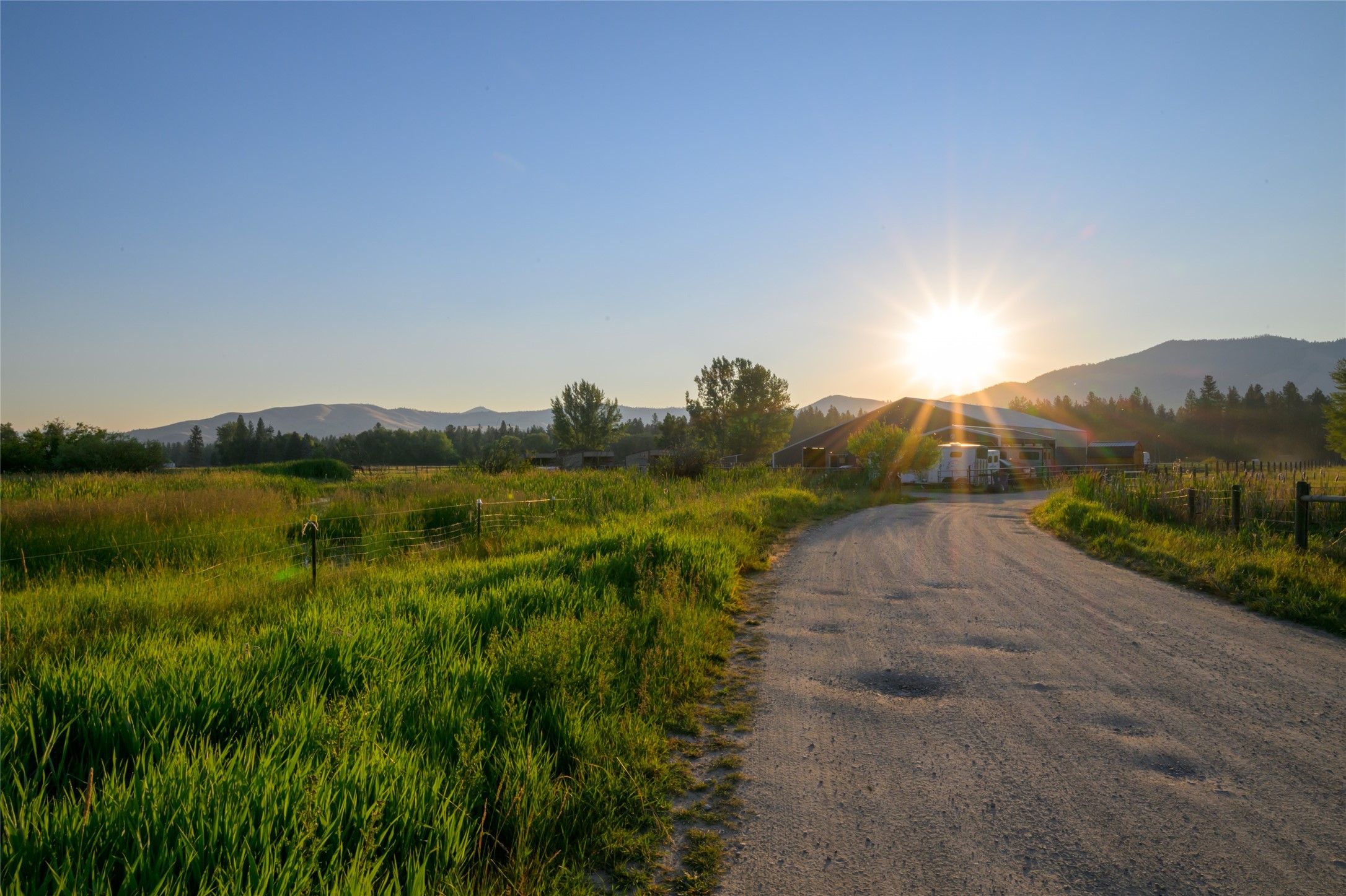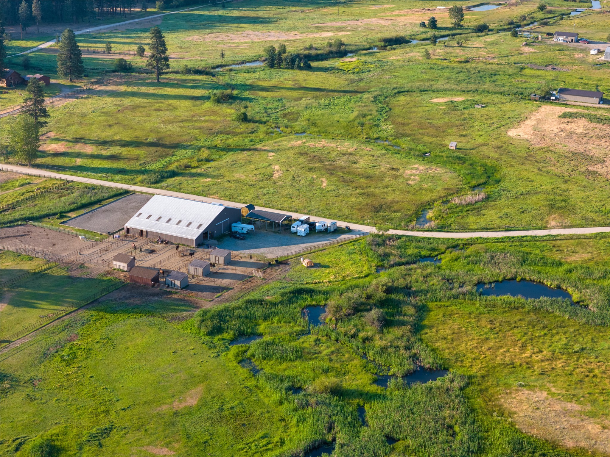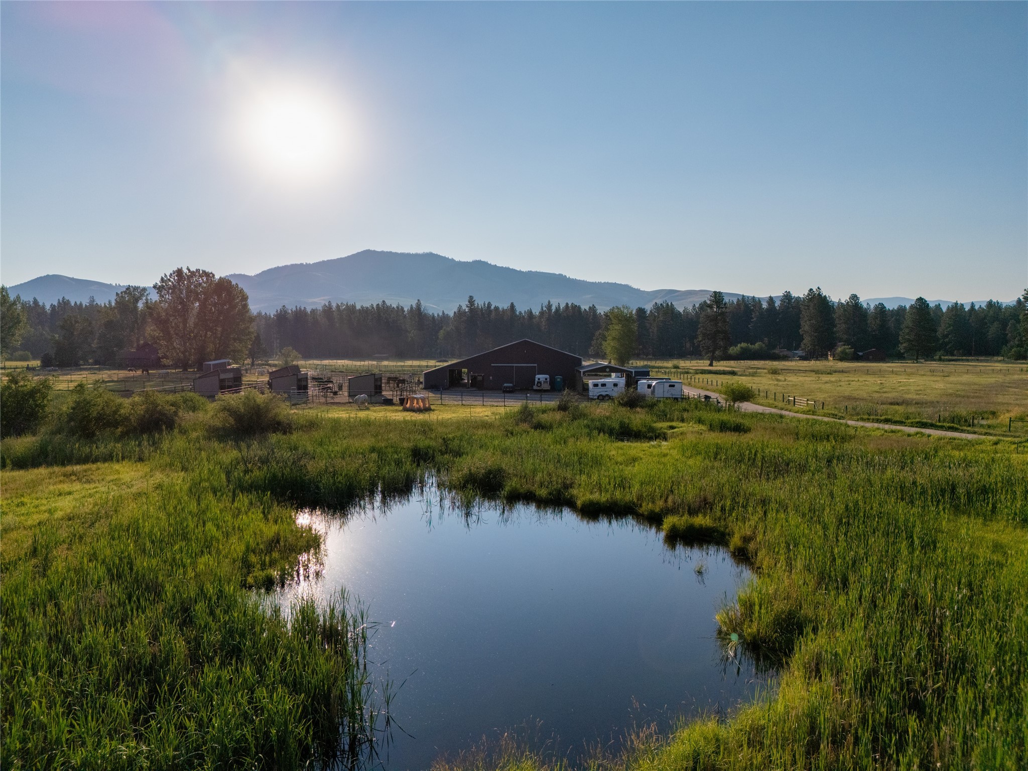 This 10.01-acre equestrian property, known as Cattail Stables, offers Bitterroot Mountain views and is easily accessible from Highway 93. The property includes pasture, runs, and two arenas. The barn features a concrete aisle and space for up to 5 stalls, along with a 65x80 indoor arena equipped with shatter-proof mirrors on both ends and solid walls. The arena's footing is designed to minimize dust and support horses' movements. Currently, the indoor stalls are configured as a feed room, a tack room with 11 lockers and hot water, and a heated lounge, in addition to two stalls with runs. There is also a 70x145 outdoor dressage court/arena with sand/rubber footing to maximize stability for dressage and jumping. Additional features include automatic waterers, a turnout pasture with a large shelter, and five six-foot-tall pens with individual shelters, each large enough for two or more horses, constructed with steel continuous fence. A large hay shed is located next to the barn. The property is suitable for use as an individual horse training facility.