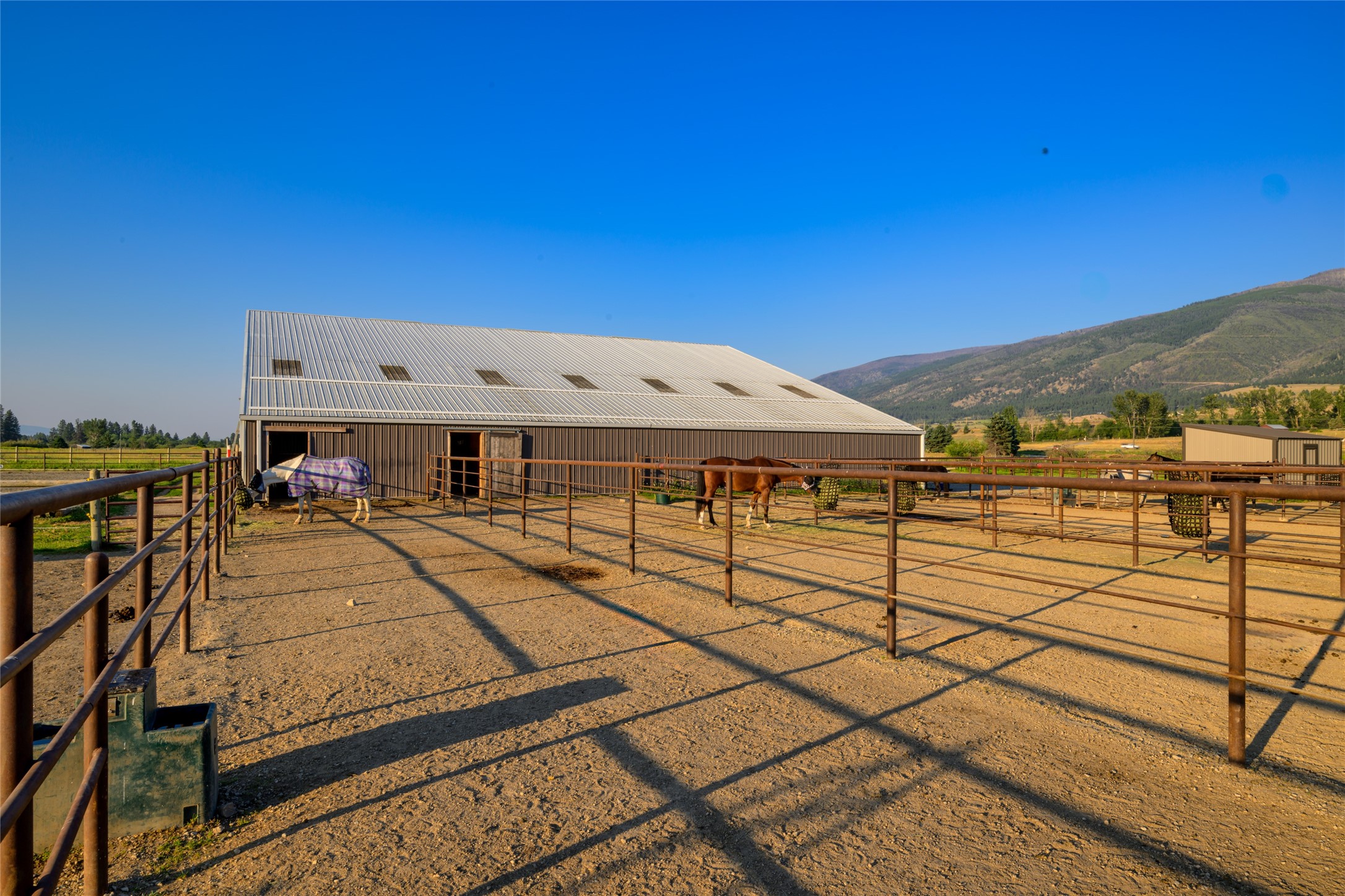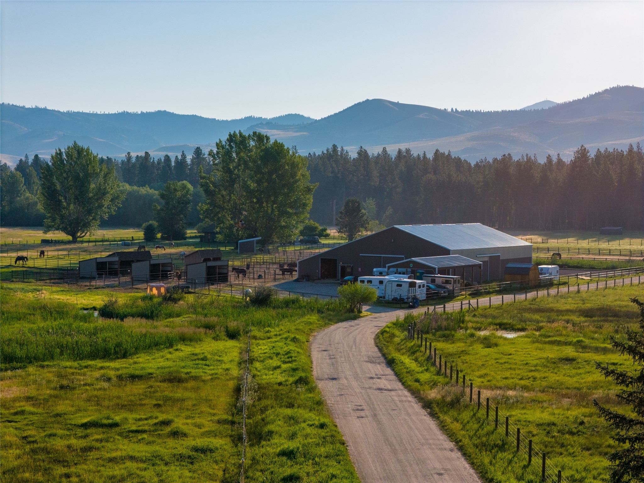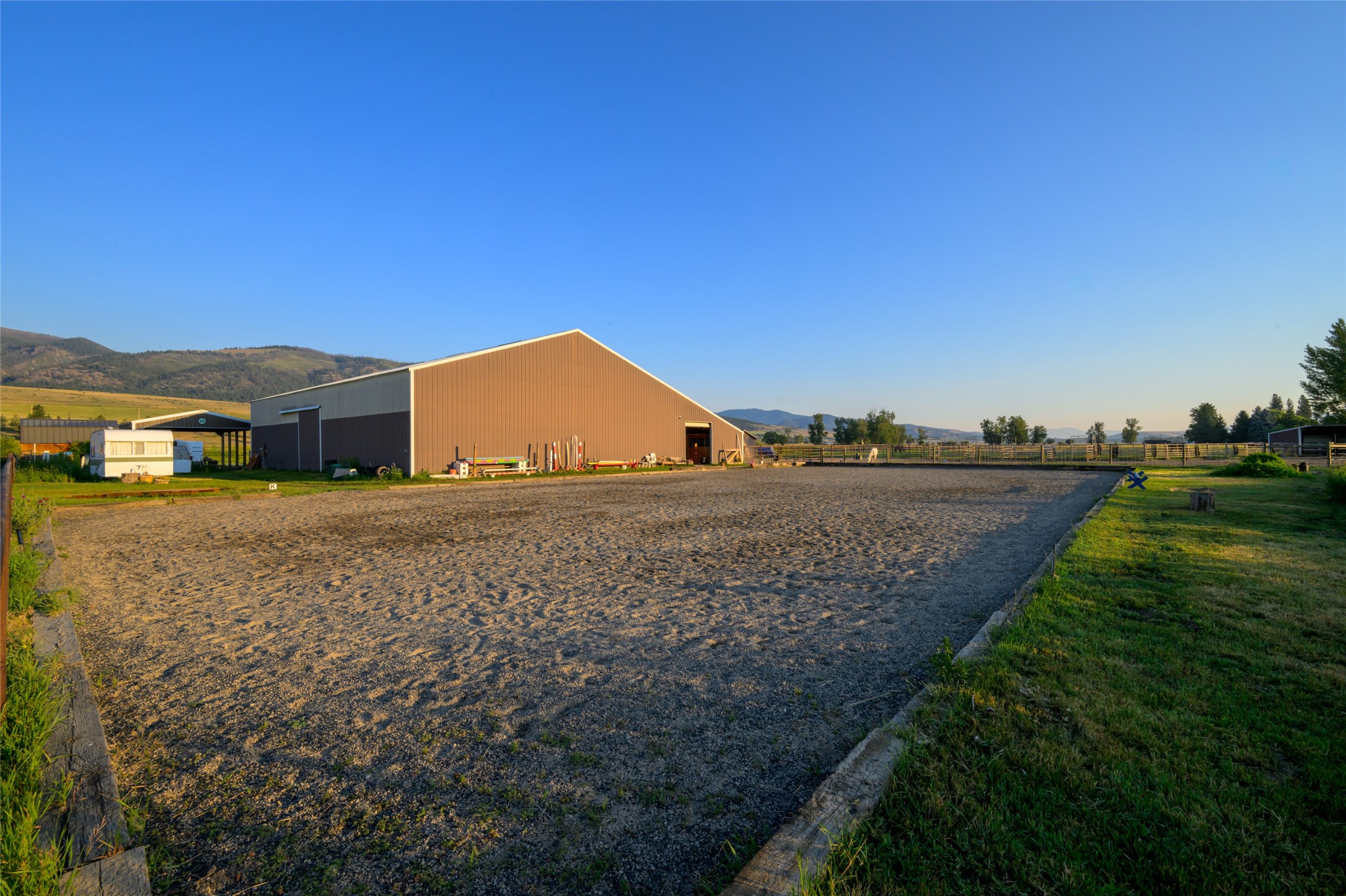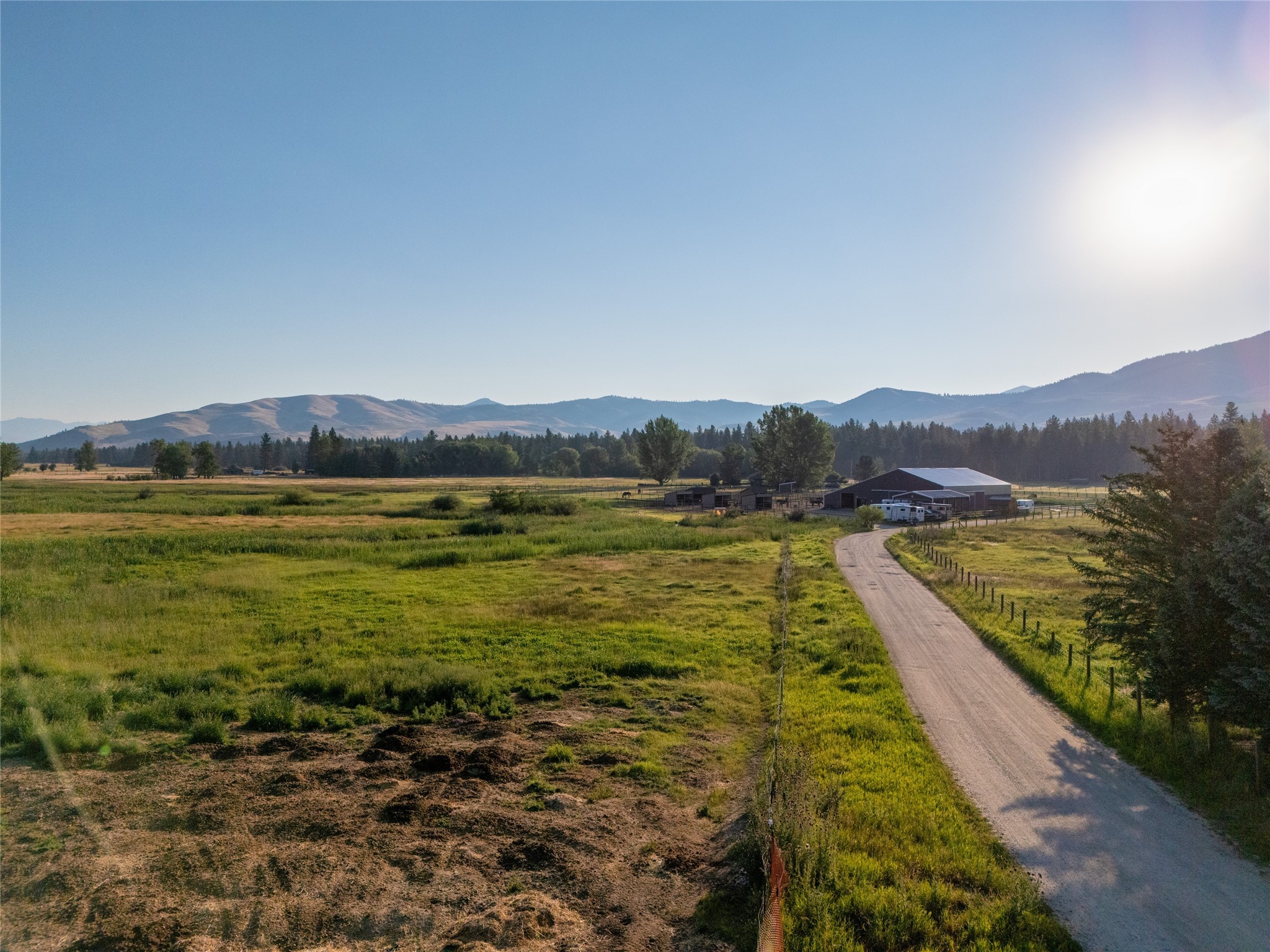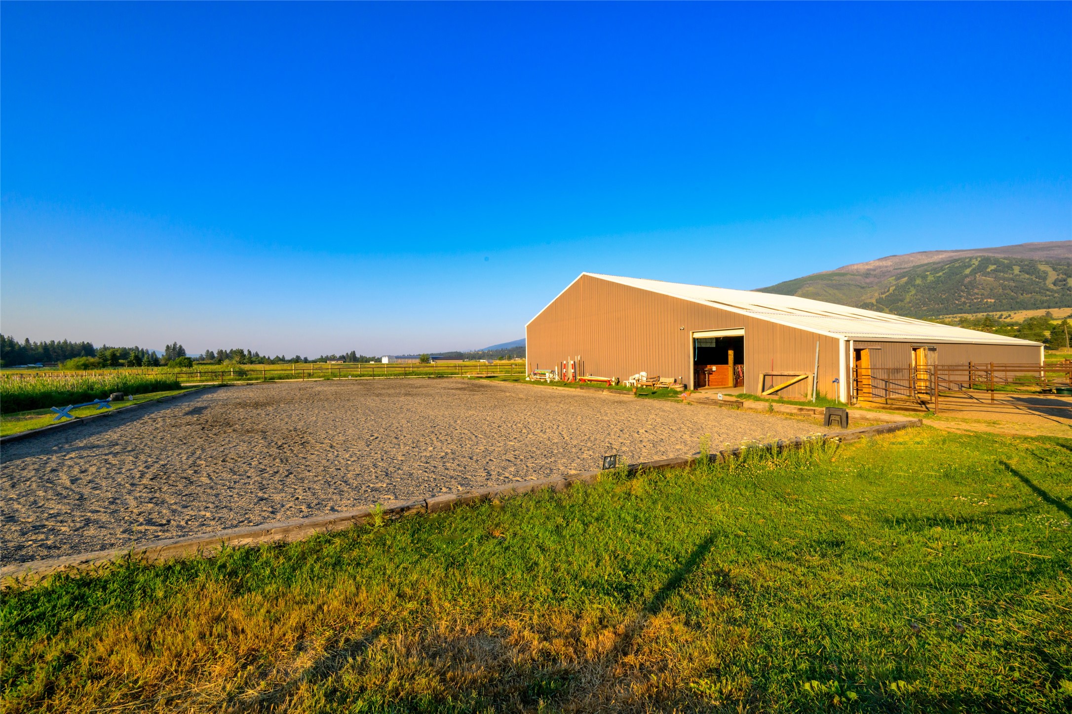 This property features: 10.01‑acre equestrian property with Bitterroot Mountain views and Highway 93 access.; Barn features a **65x80 indoor arena with shatter‑proof mirrors and specialized low‑dust footing.**; **70x145 outdoor dressage court/arena with sand/rubber footing** for stability.