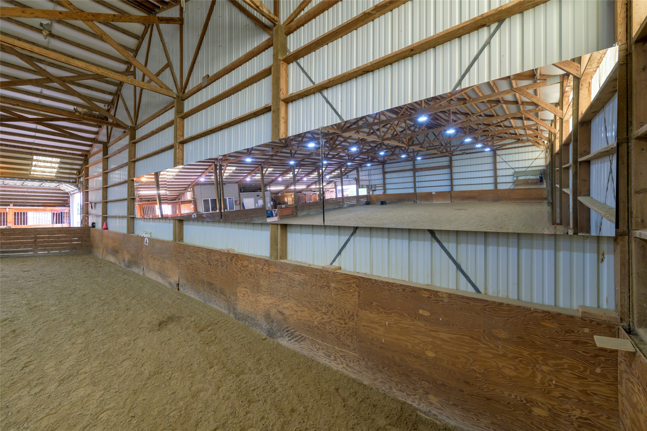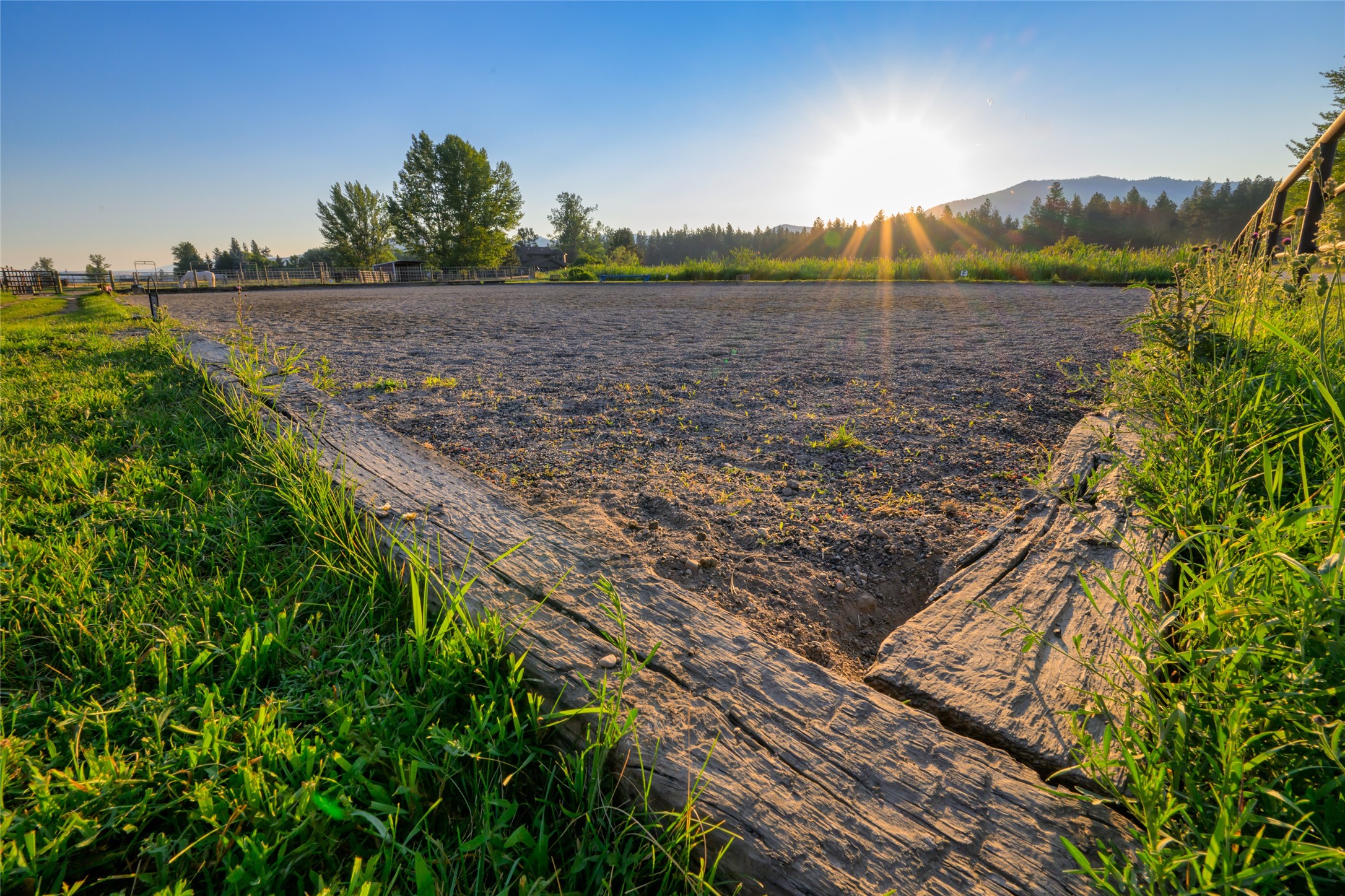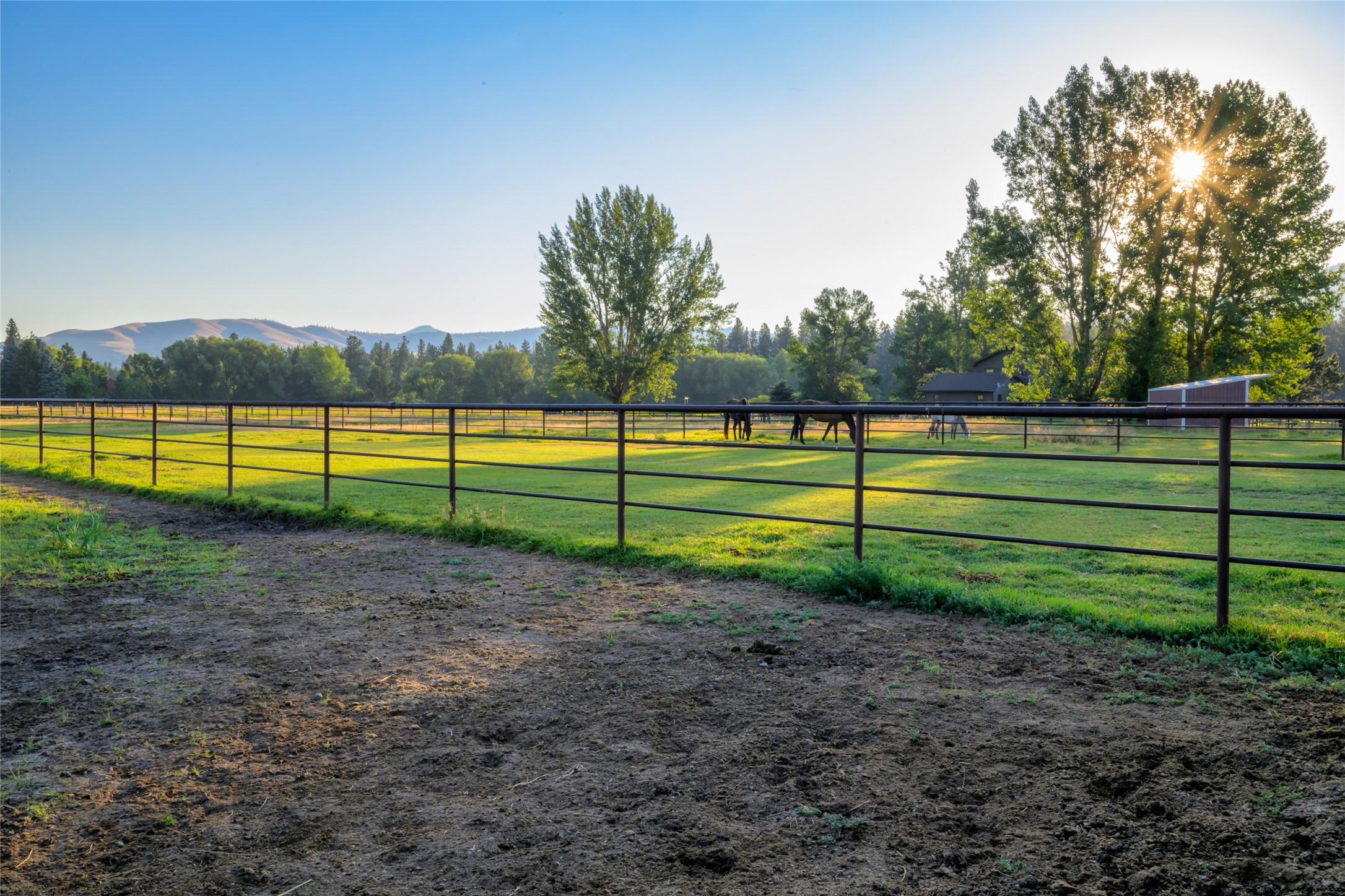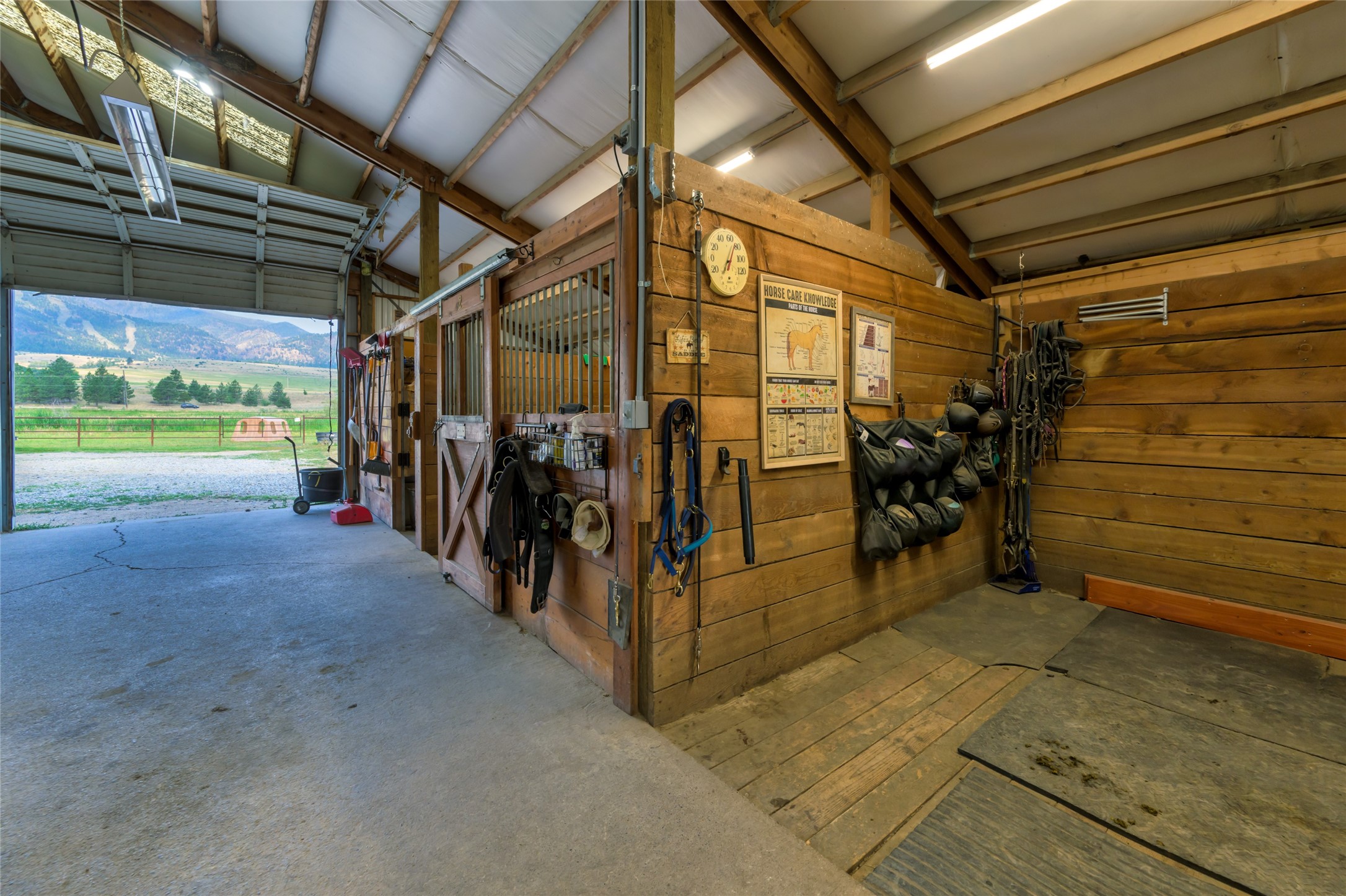 This property features: 10.01‑acre equestrian property with Bitterroot Mountain views and Highway 93 access.; Barn features a **65x80 indoor arena with shatter‑proof mirrors and specialized low‑dust footing.**; **70x145 outdoor dressage court/arena with sand/rubber footing** for stability.