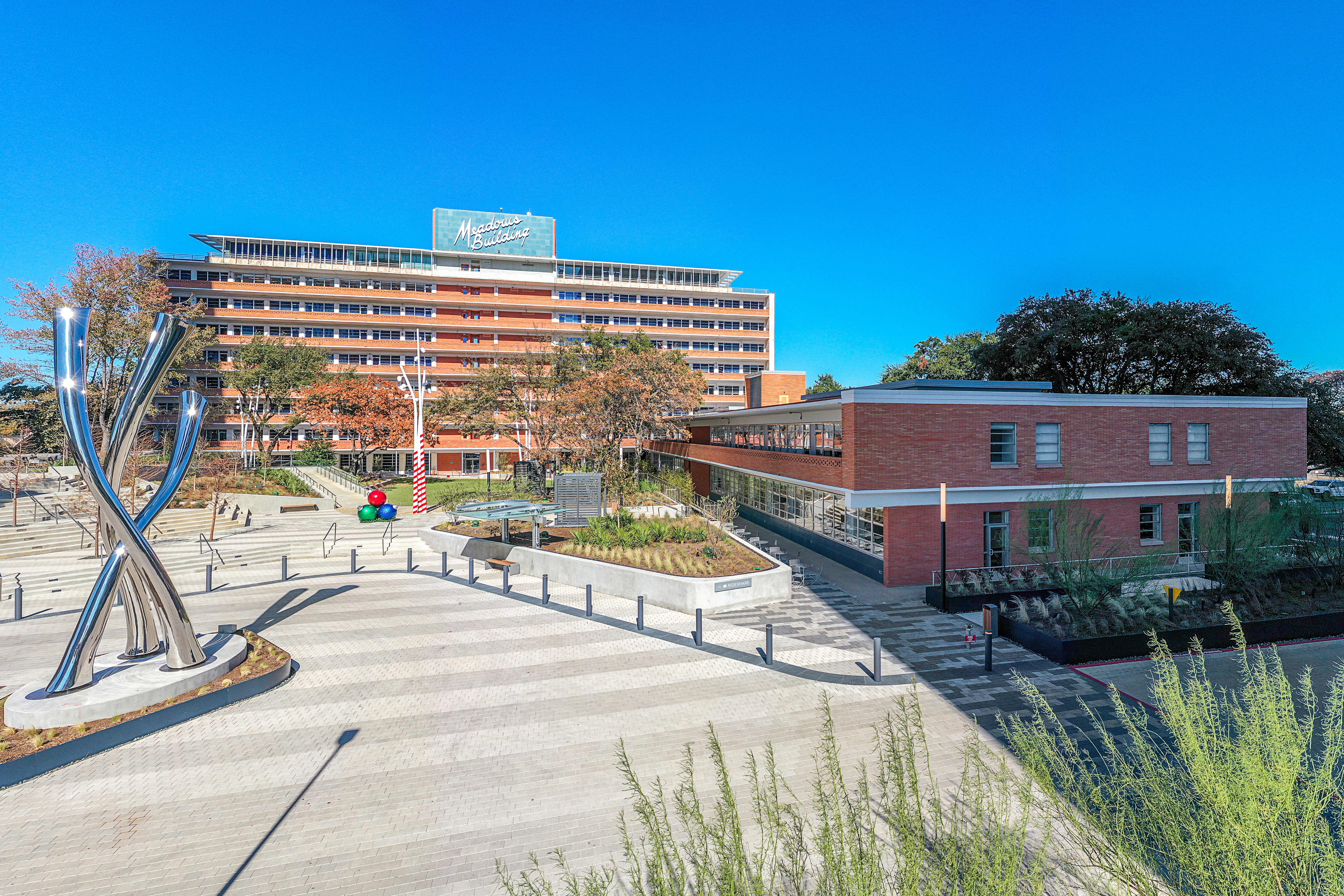 Modernized campus with amenities, eateries, and fitness center.