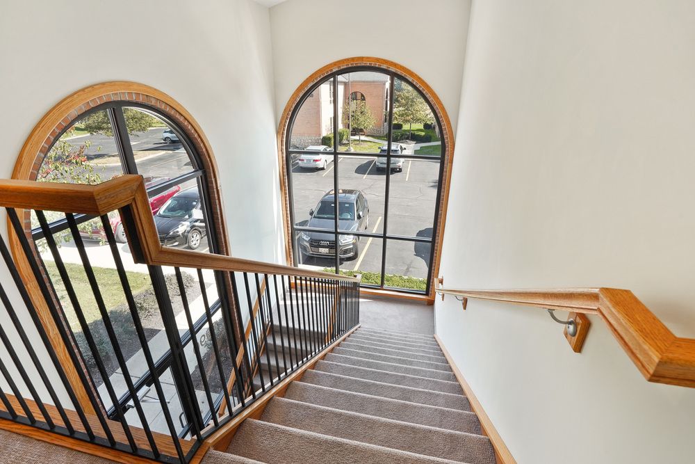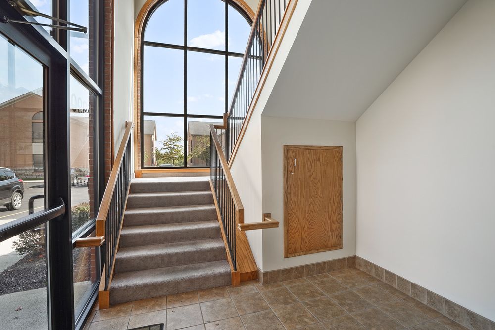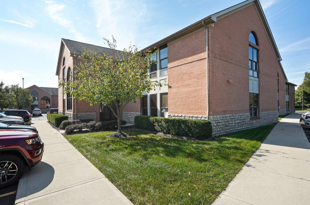 Office space in a two-story brick building with amenities.