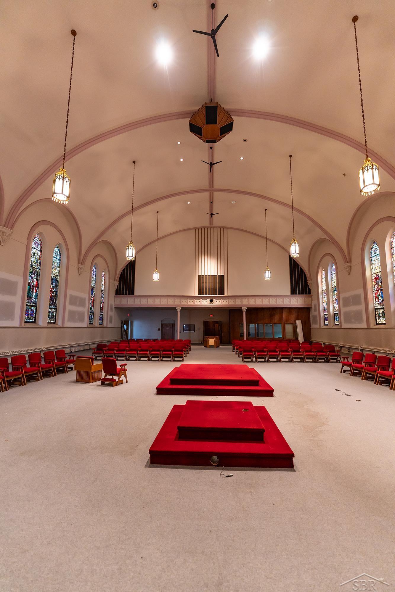 This property features: Approximately 15,000 sq ft of open interior space offering flexibility for various uses.; Historic landmark property built in 1907 with significant character.; **Classic architectural details including soaring ceilings and stained glass windows.**