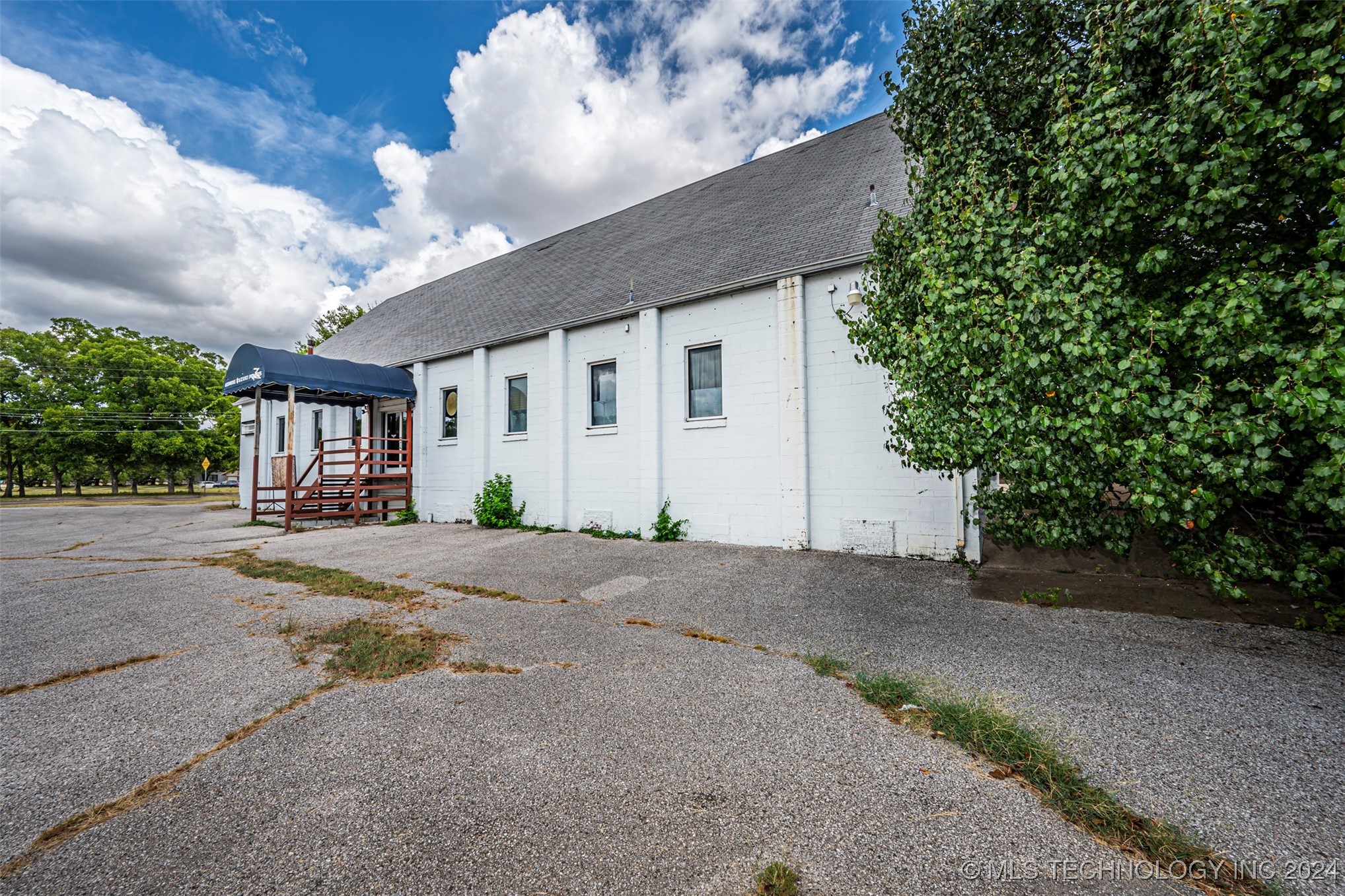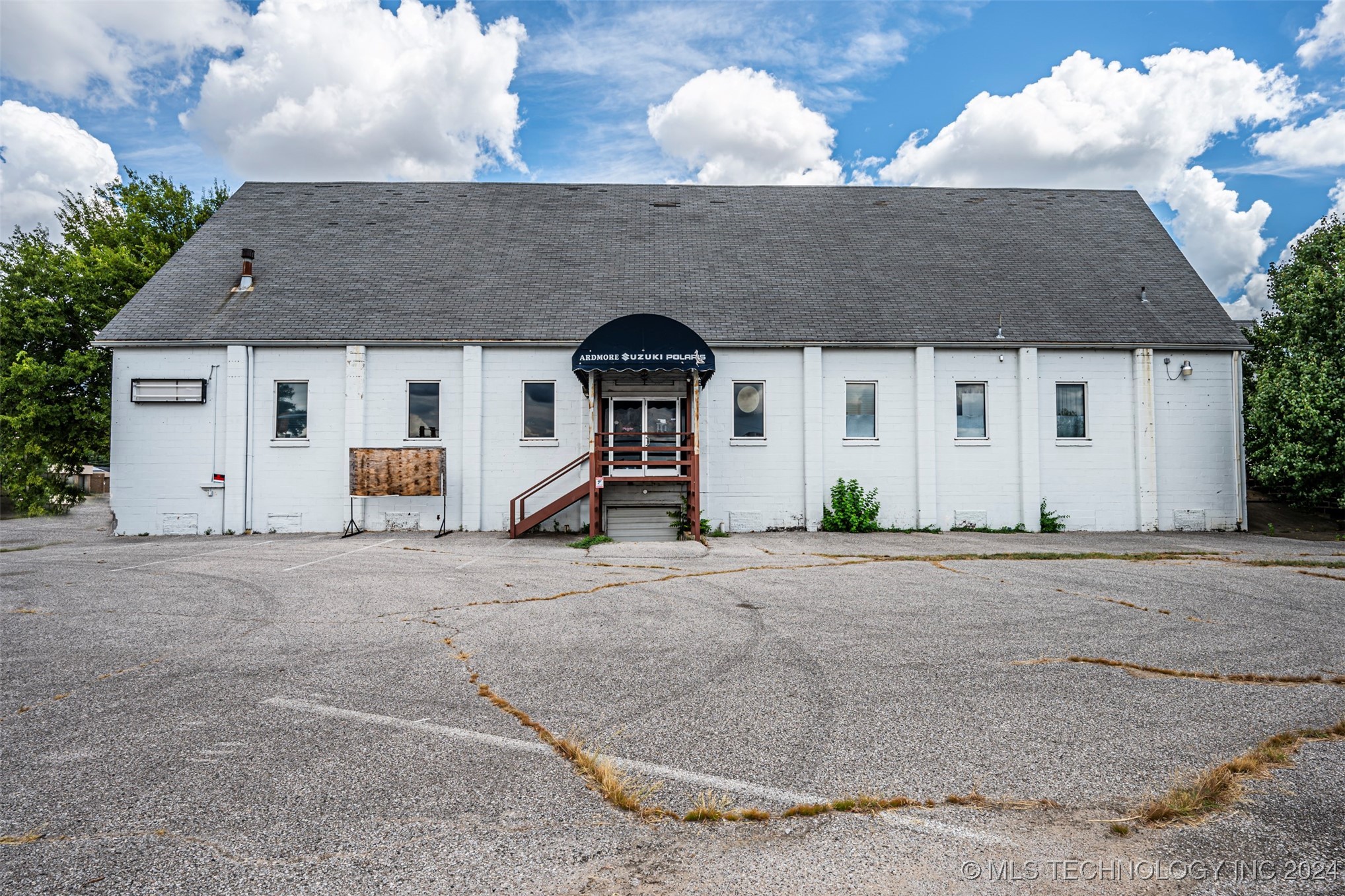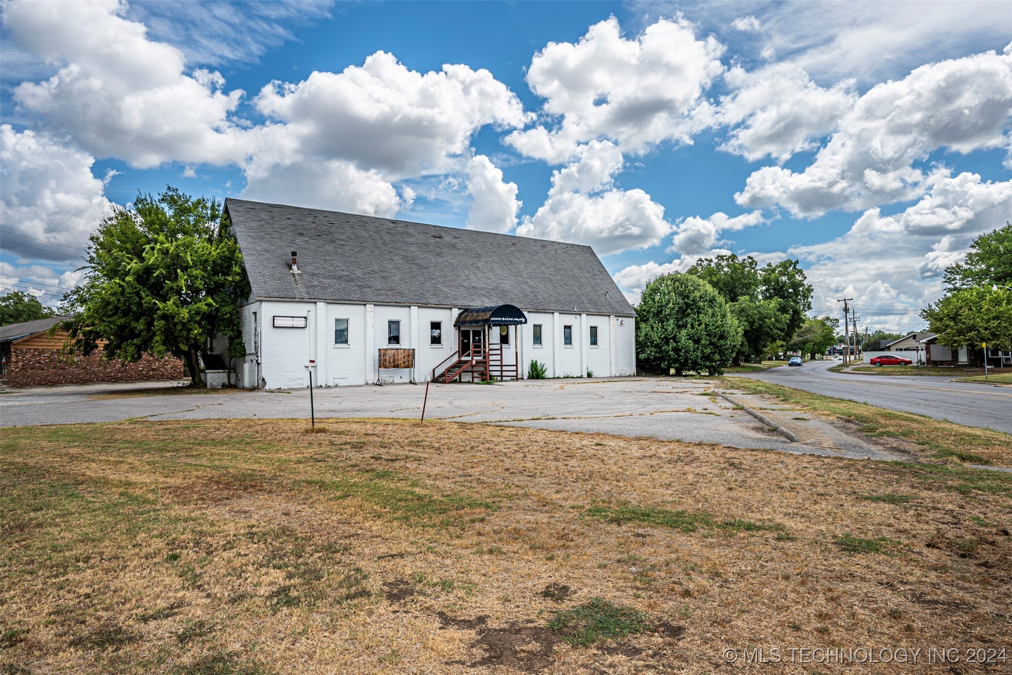 Two-level commercial building with large parking lot on 0.5+ acres.