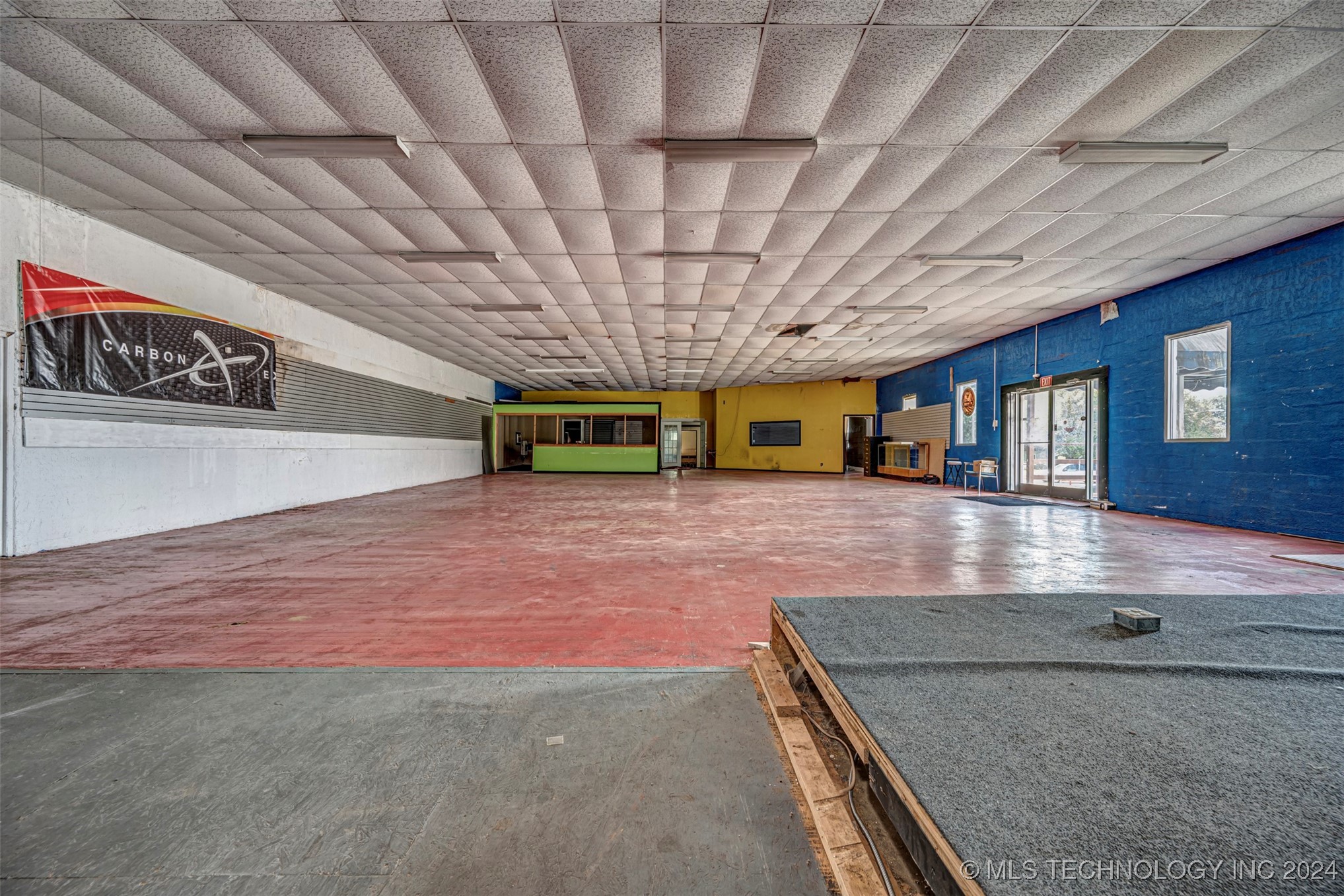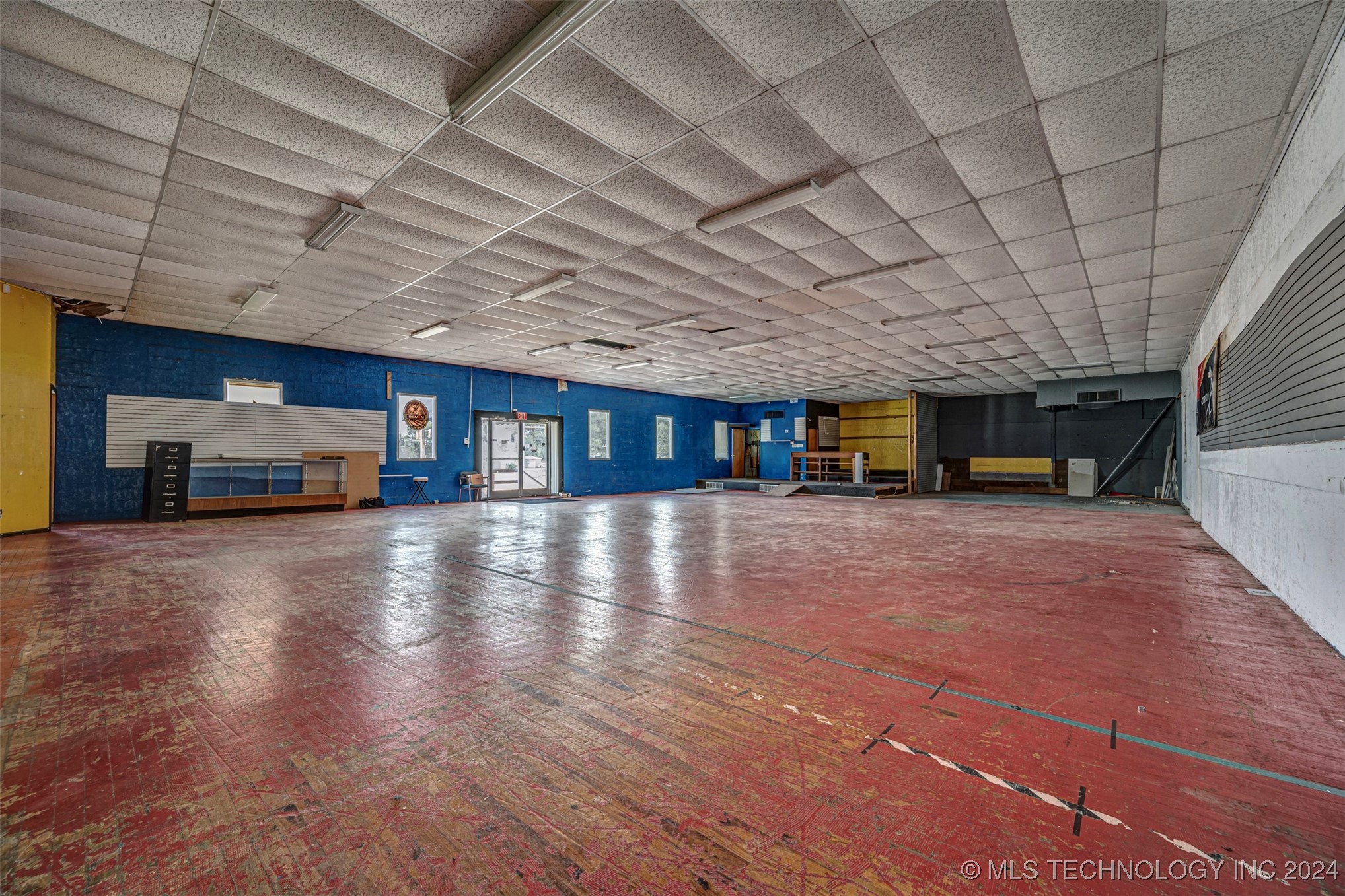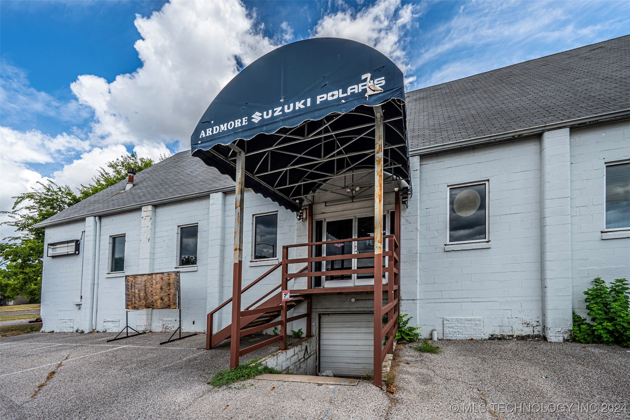 Two-level commercial building with large parking lot on 0.5+ acres.