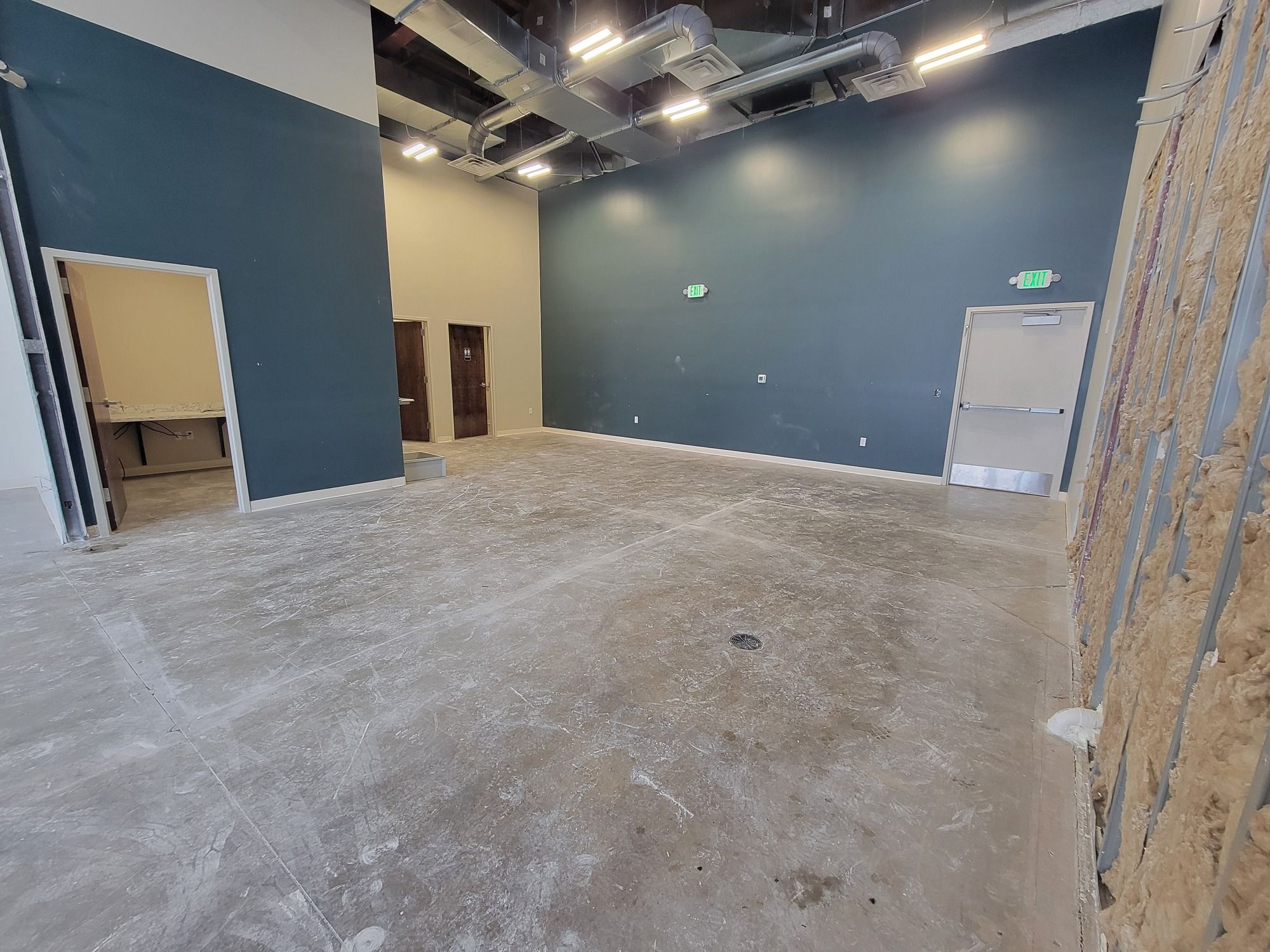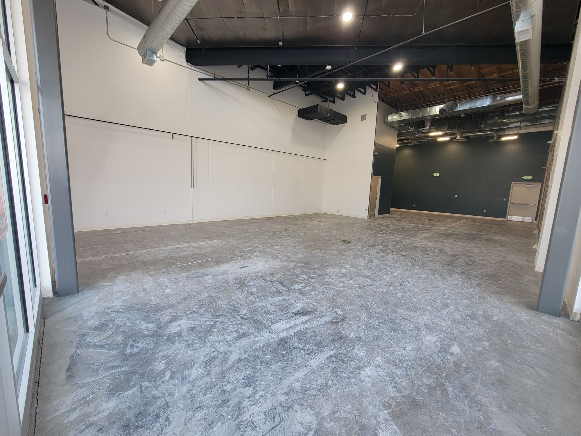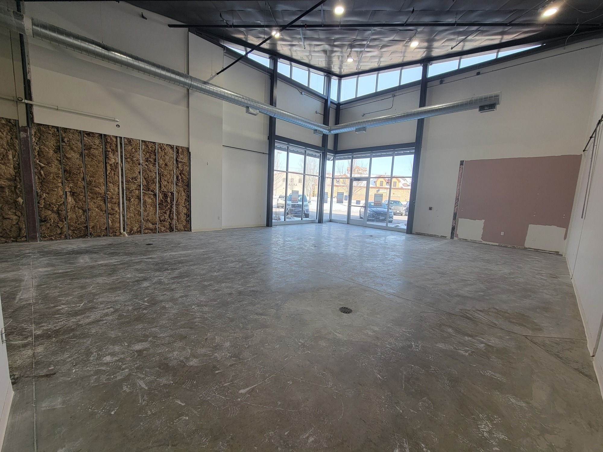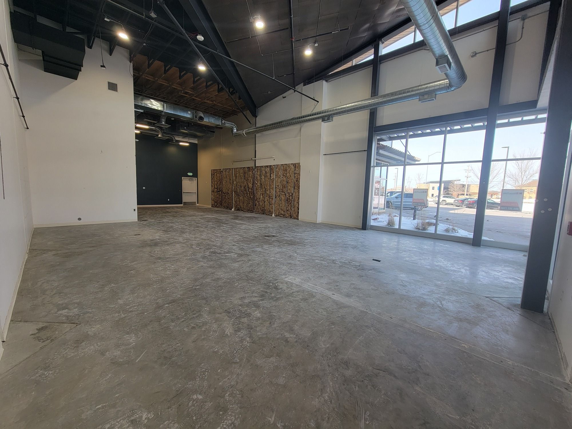 Retail suite with office, restroom, high ceilings, and signage.