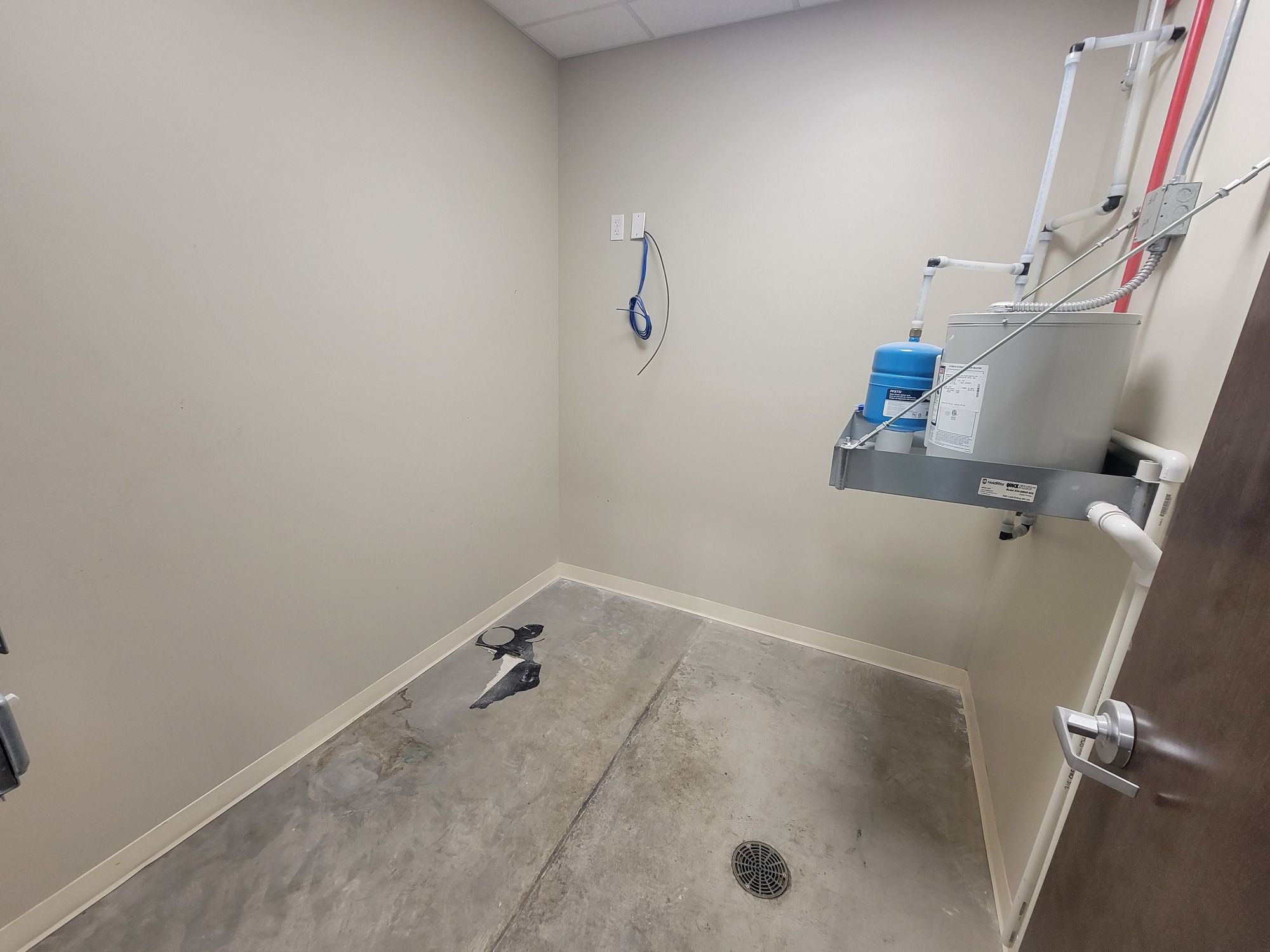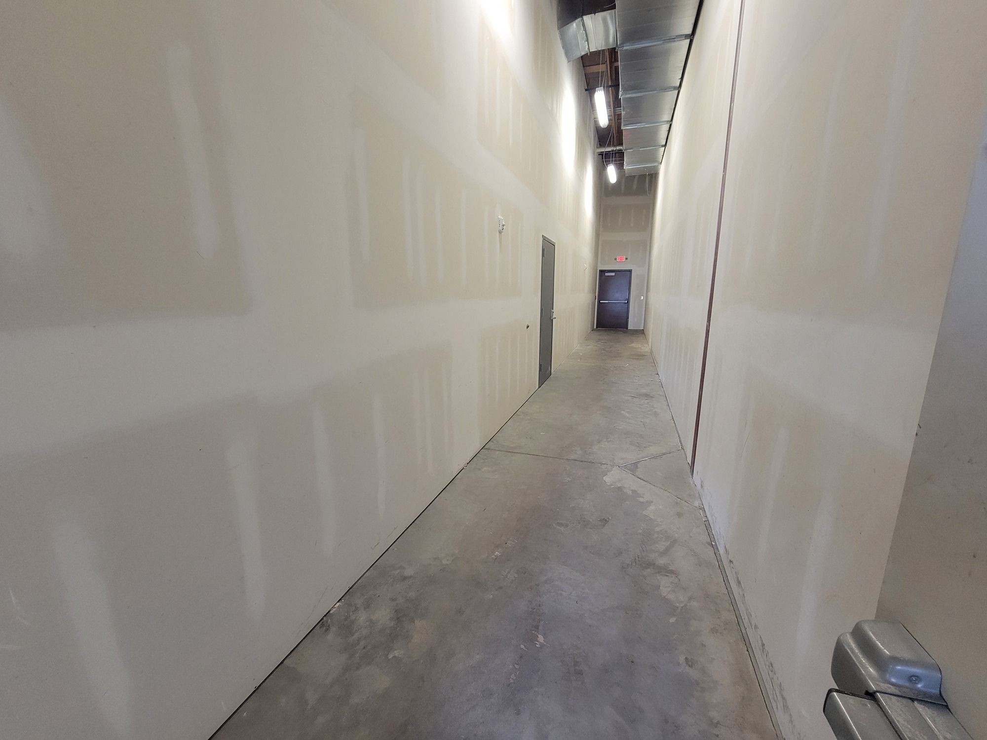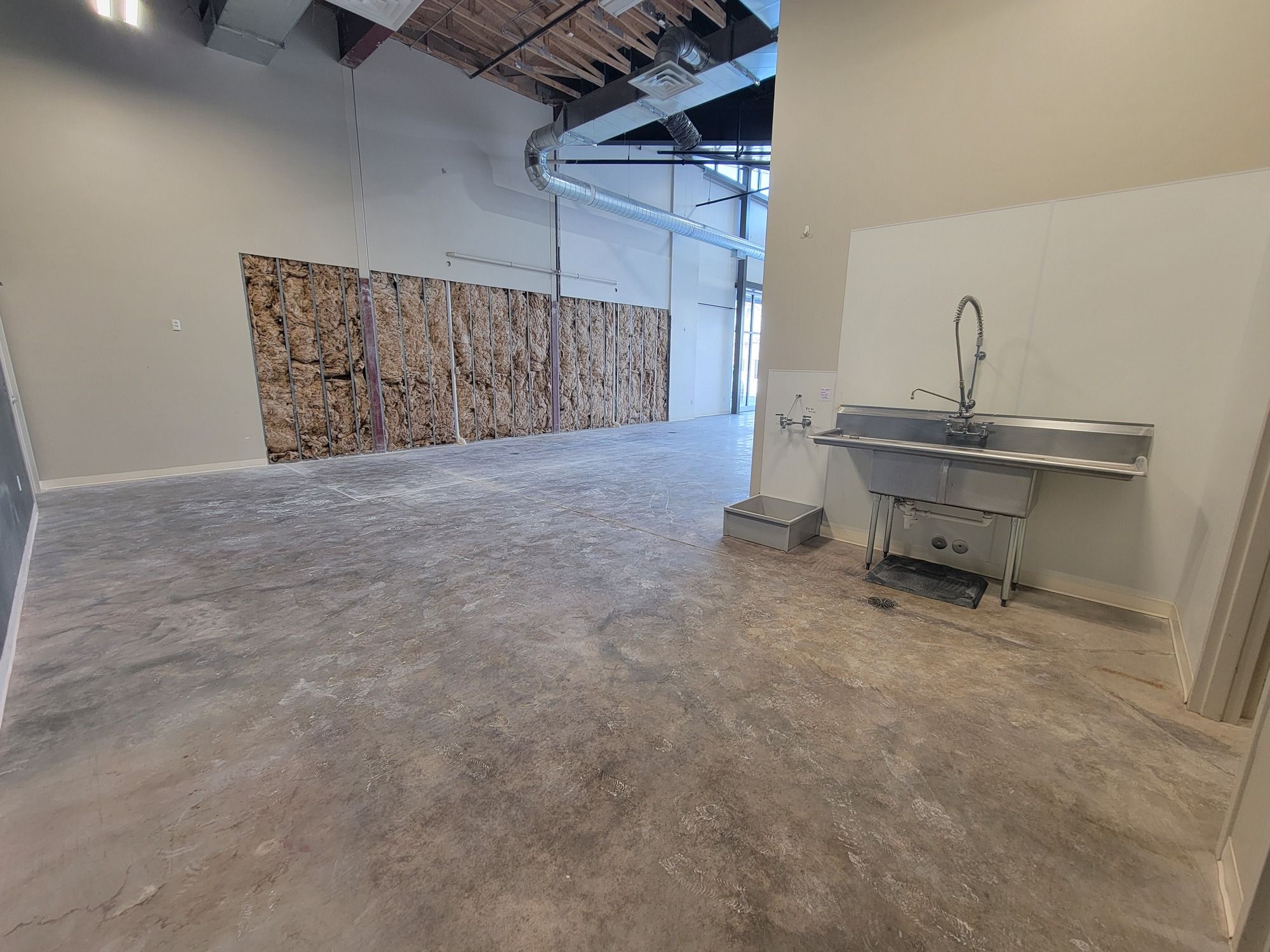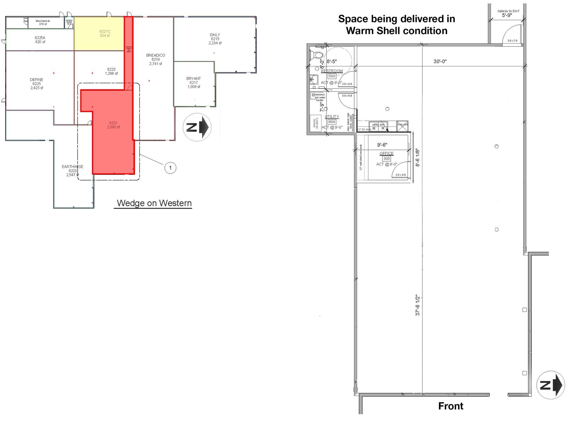 Retail suite with office, restroom, high ceilings, and signage.