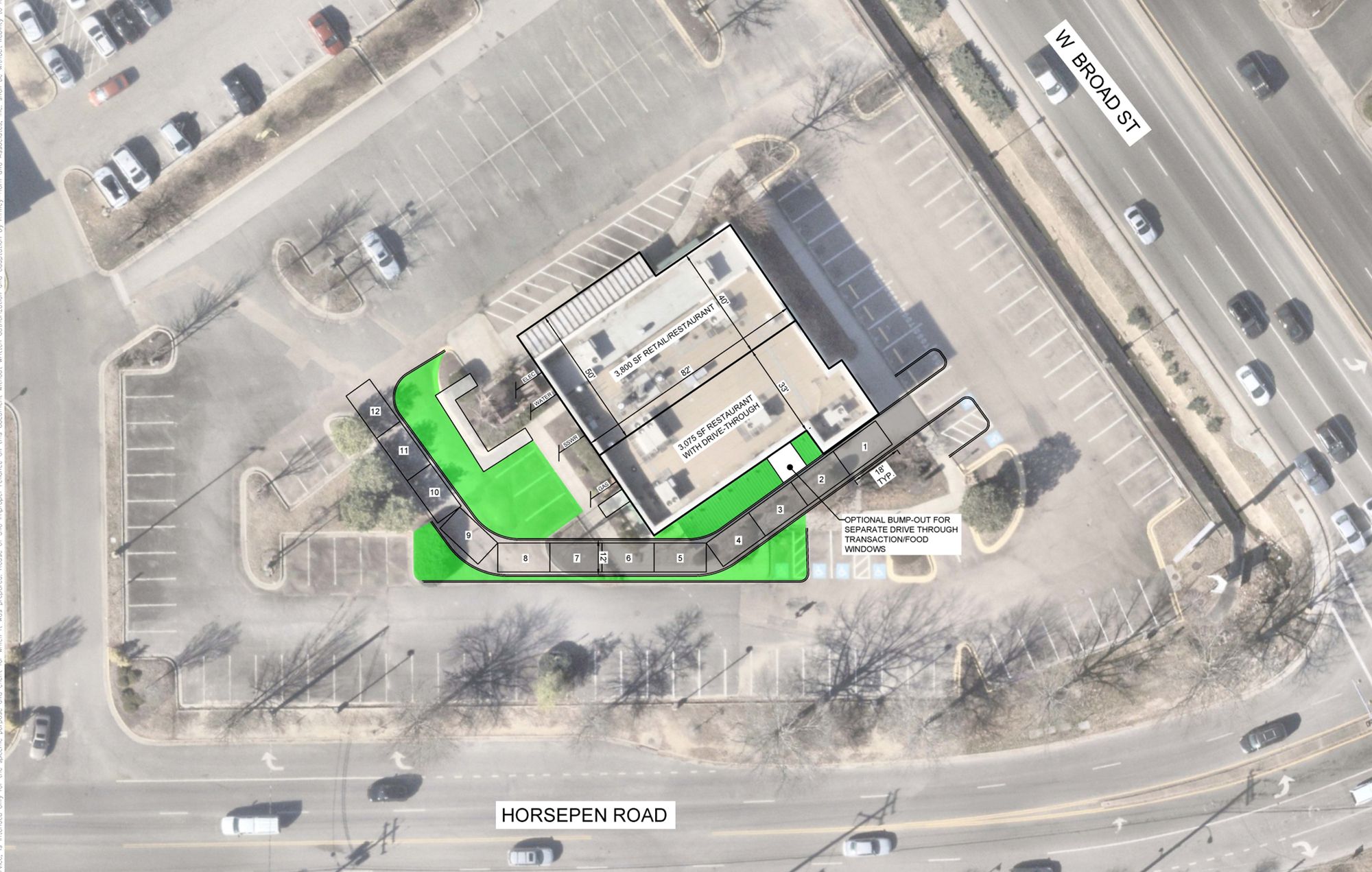 Restaurant space available with drive-through and patio.