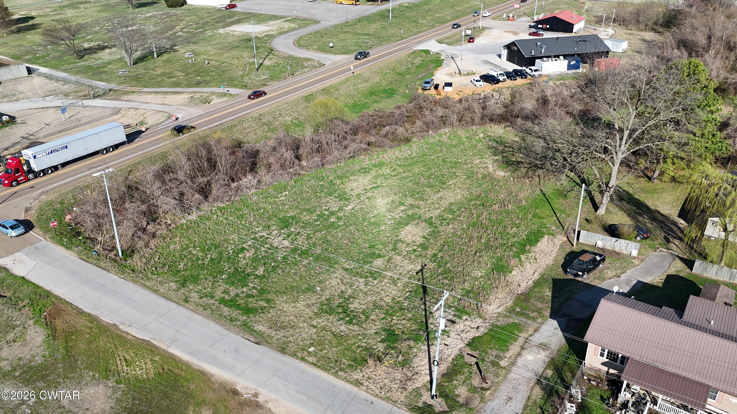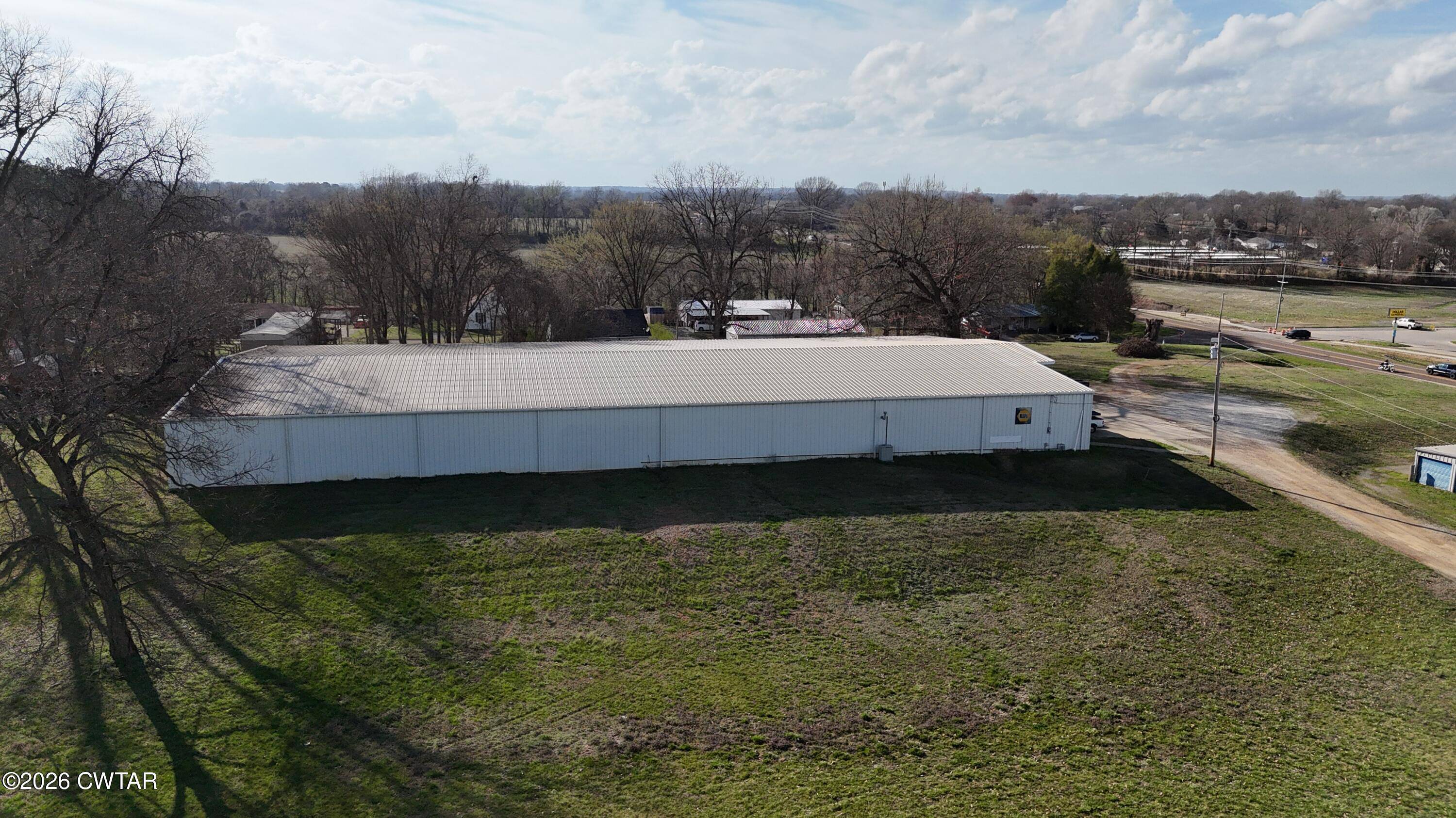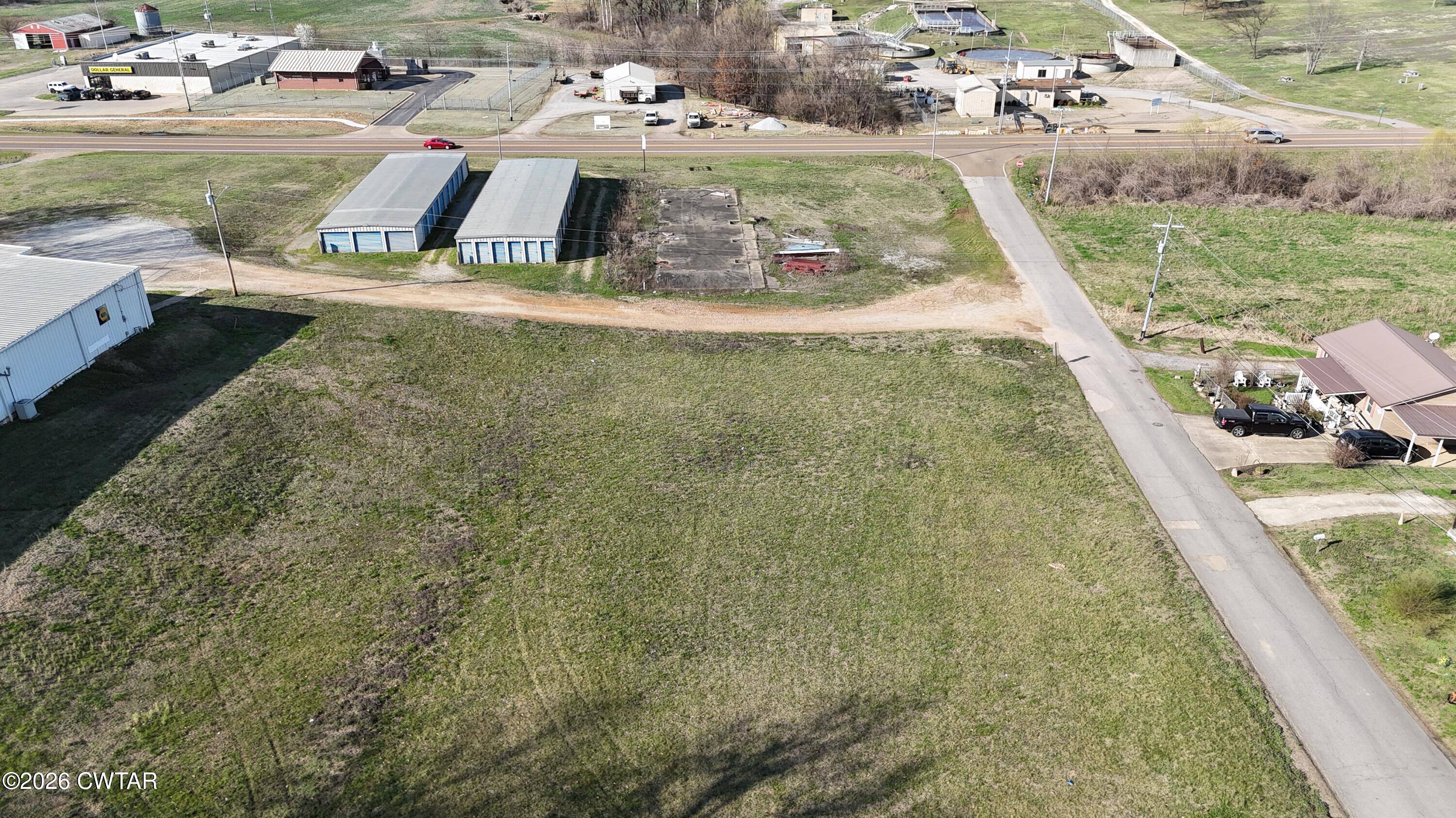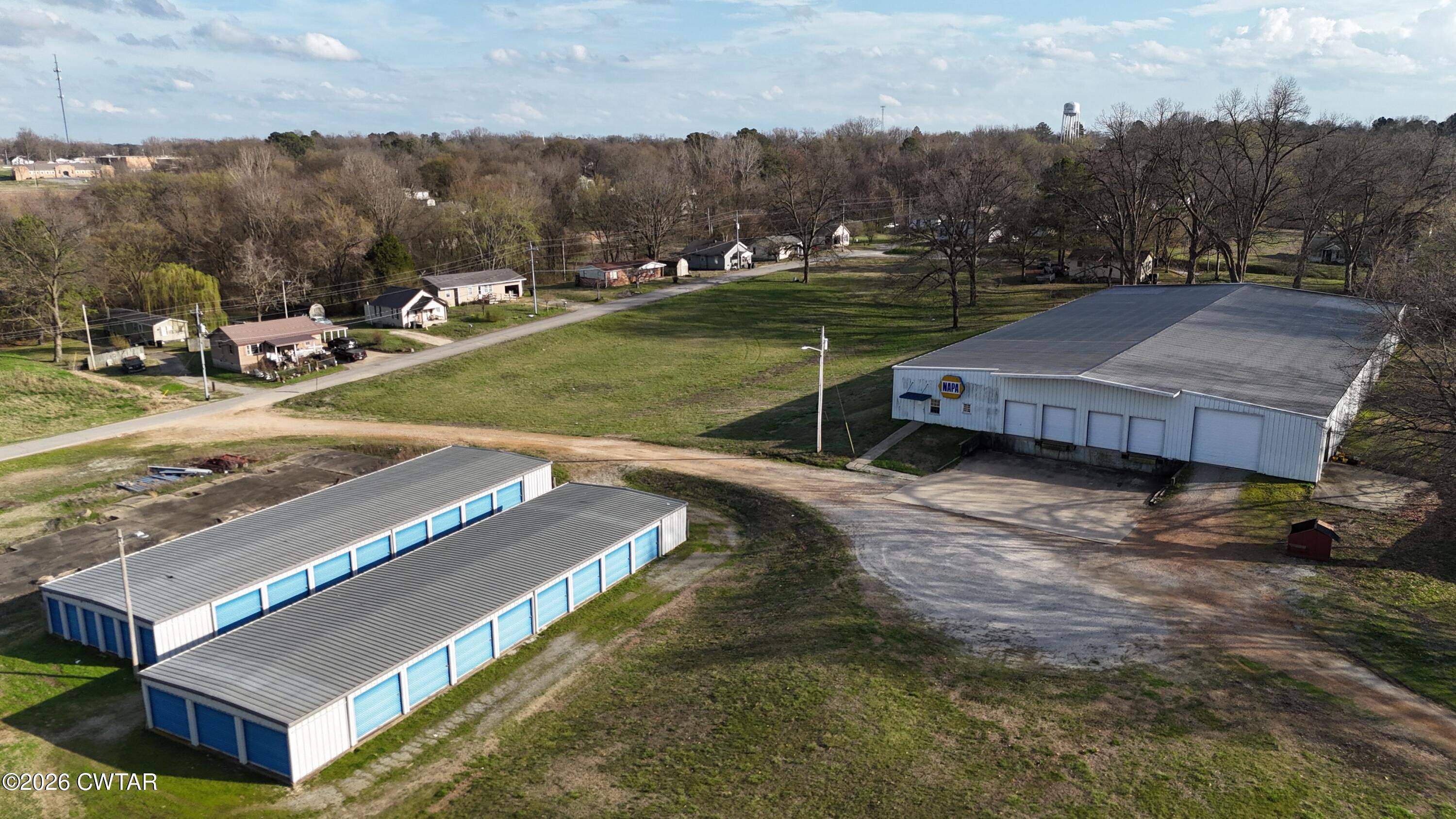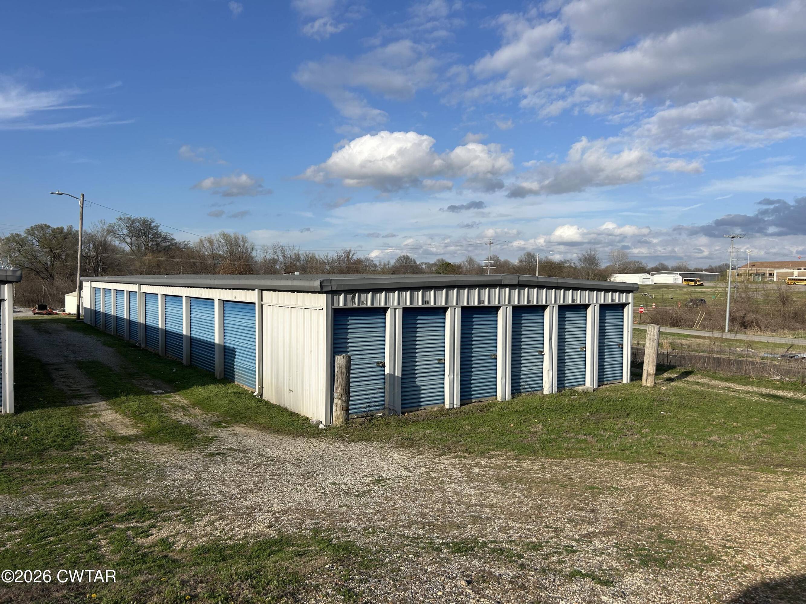 Commercial property featuring a building and mini storage units.