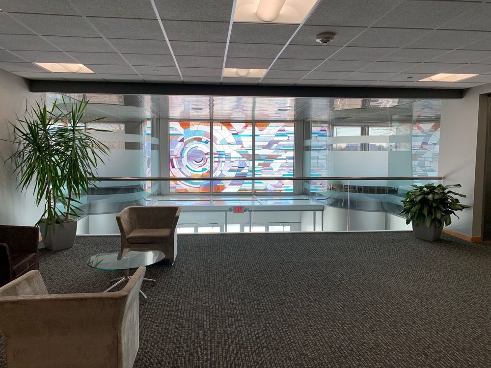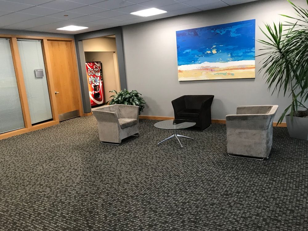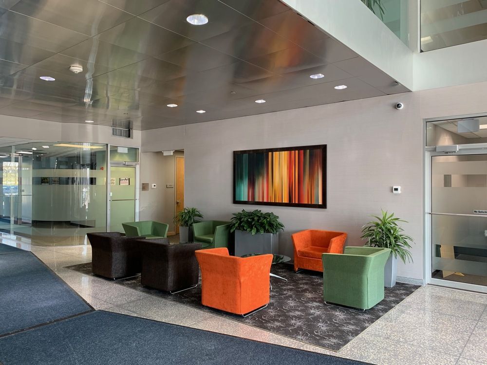 Four-story office building with newly renovated lobby and abundant parking.