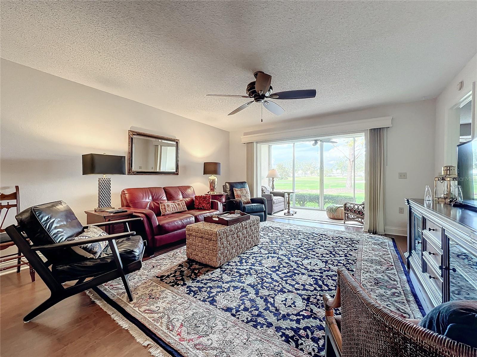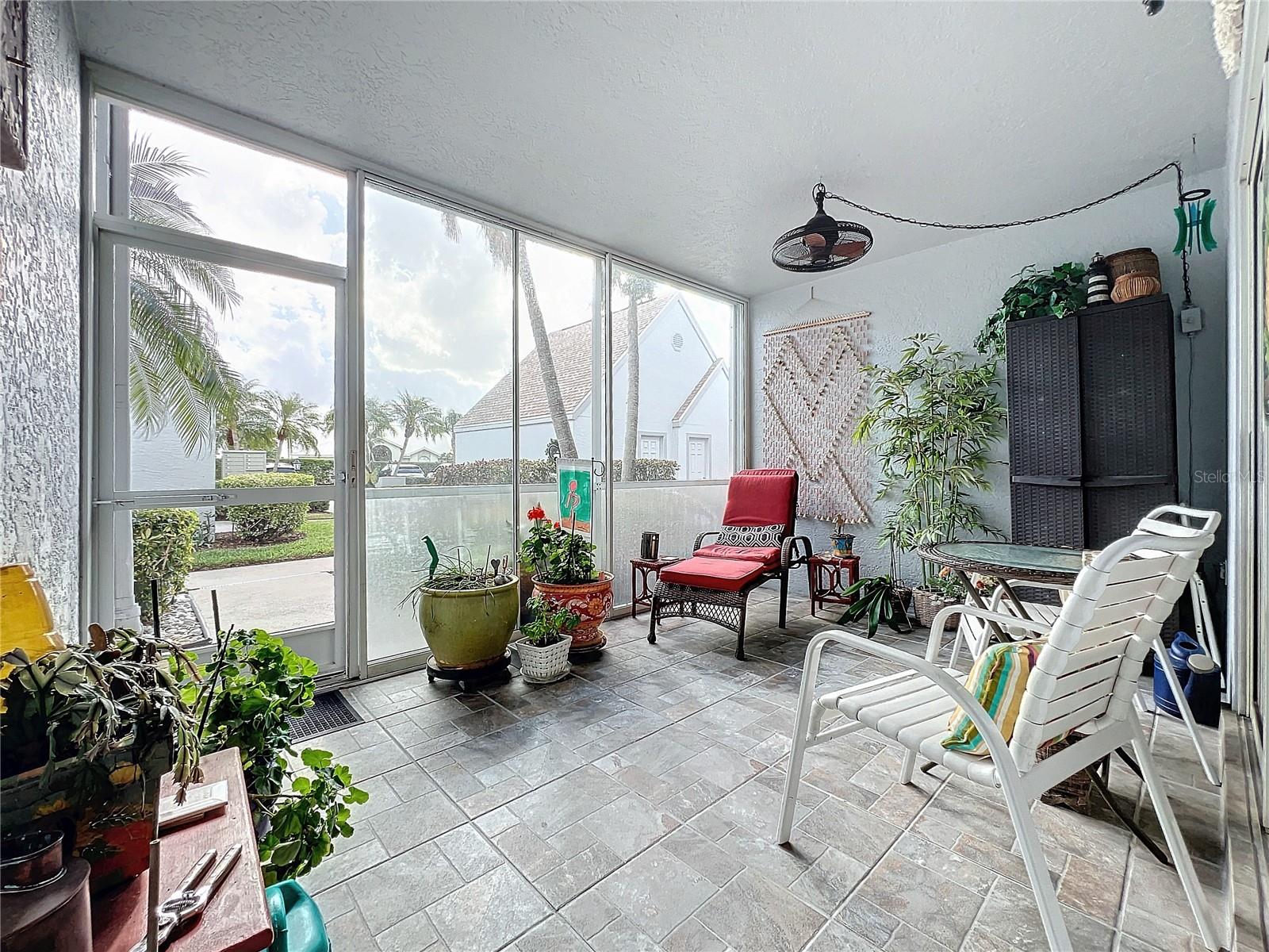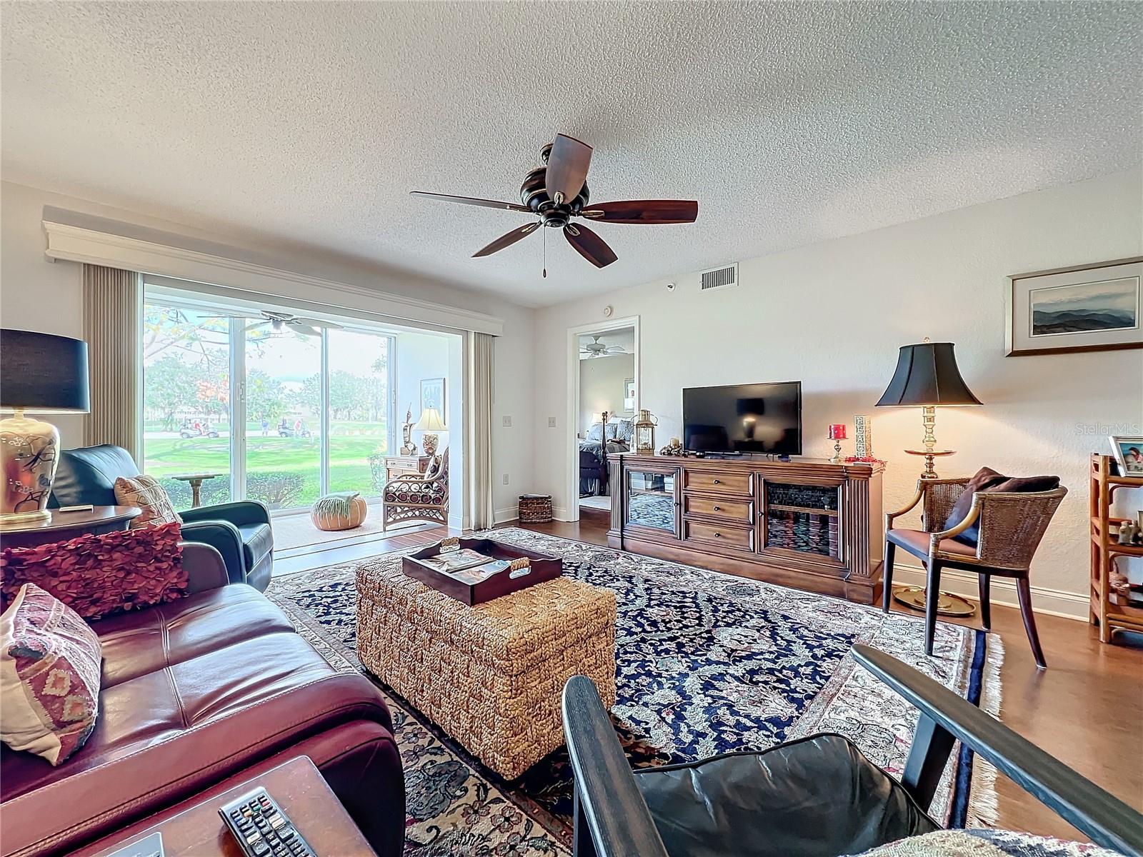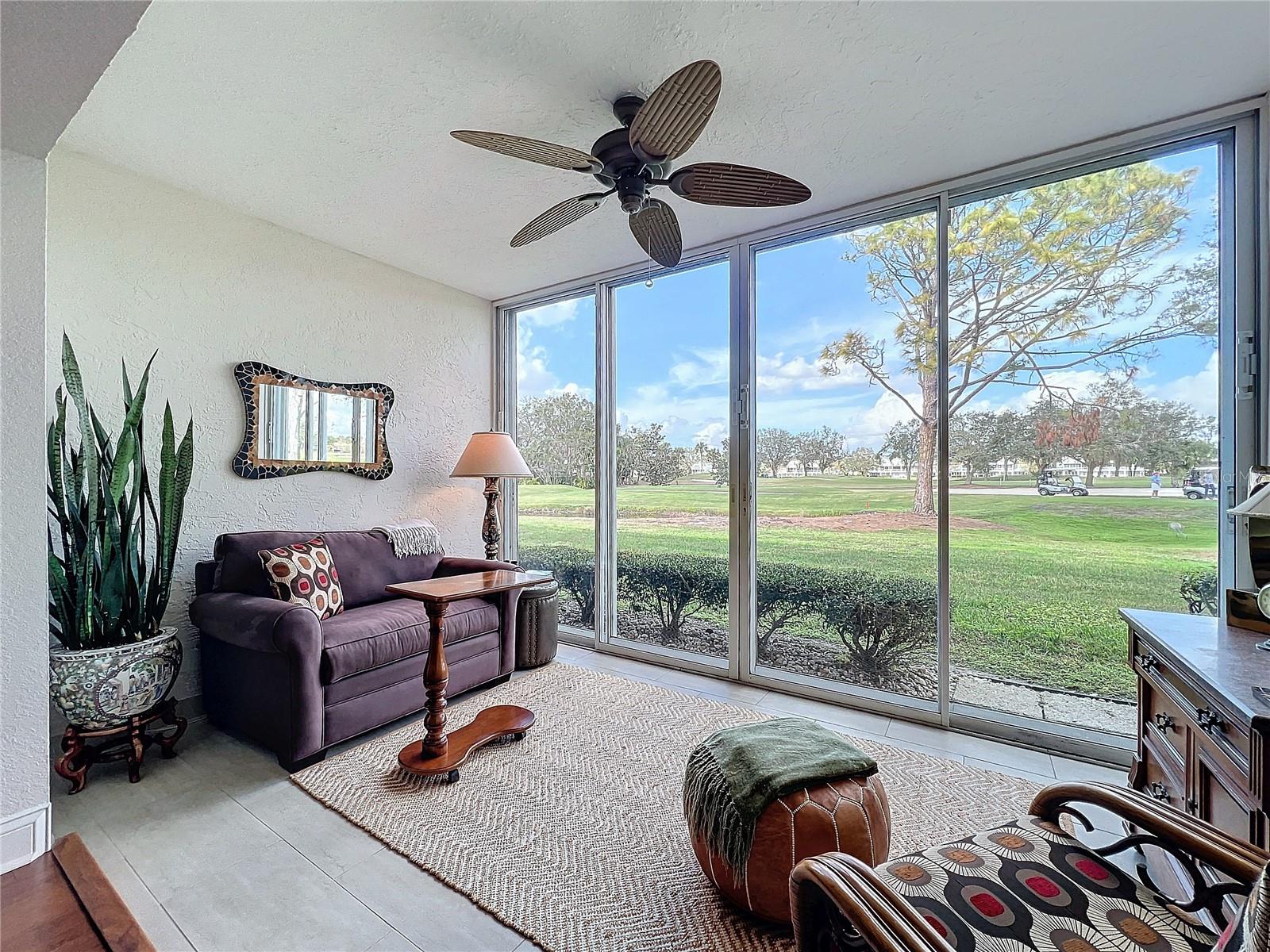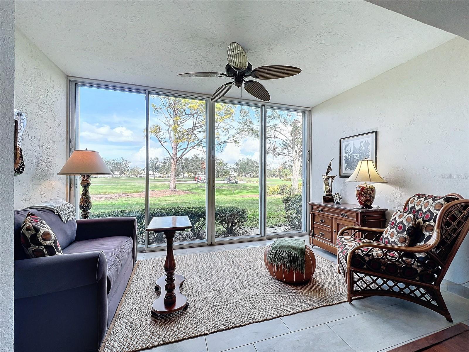 This updated, partially furnished first-floor condo is located in the Tara Golf and Country Club. The property includes a deeded Class 'A' equity golf membership. Situated on the sixth fairway, the condo features a large, open main living area and two enclosed, screened lanais, adding 258 square feet of living space. The condo includes 2 bedrooms, a den, 2 bathrooms, and a 1-car garage with attic storage and a pull-down ladder. Updates include luxury laminate floors in the main living areas, carpet in the second bedroom, wood cabinets, and Silestone counters in the kitchen. The HVAC system includes a UV light, electrostatic filter, and humidity control. The south-facing entry lanai is enclosed with glass sliders and screened. The back lanai offers views of the golf course, spanning the 4th, 5th, and 6th fairways. The Verandas, consisting of 60 condos, features a new roof installed in 2021, exterior paint from 2019, and repaved driveways planned for 2024. The community is not in a flood zone. Tara Golf and Country Club amenities include an 18-hole Championship Golf Course renovated in the summer of 2023, Har-Tru tennis and bocce courts, pickleball, a fitness center, hot tub, sauna, firepit, and screened patio. A new pickleball center with five courts is under construction and expected to be completed in 2025. Additional amenities include a clubhouse with dining options, a concession stand at the main pool, a driving range, a short game practice area, a putting green, and a pro shop. The Tara Master Association fee includes Comcast premium bundle for internet and cable TV, HBO and MAX, common area landscaping, and perimeter maintenance. The property offers easy access to I-75, airports, shopping at UTC mall, arts, theater, entertainment, dining, and beaches.