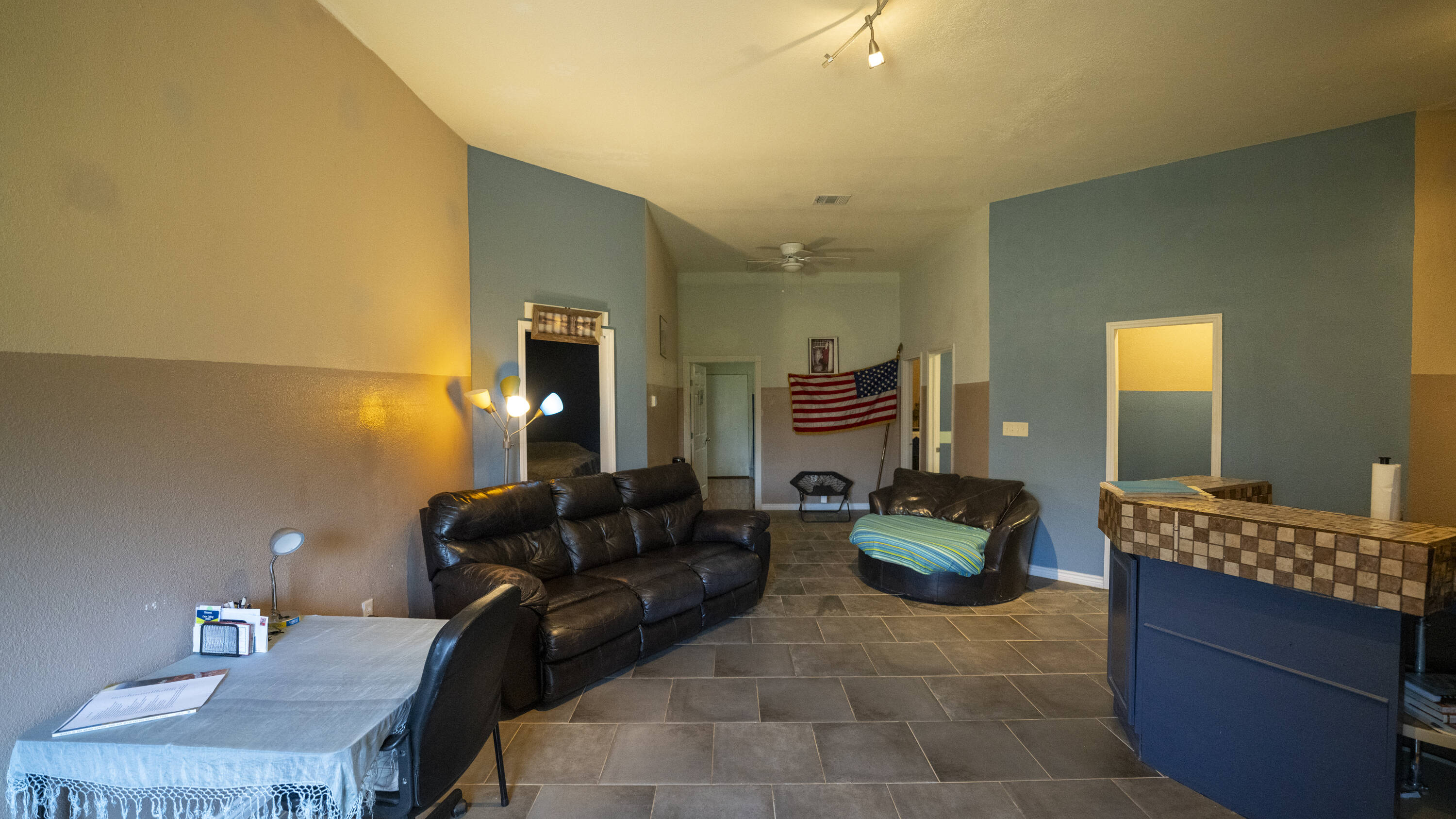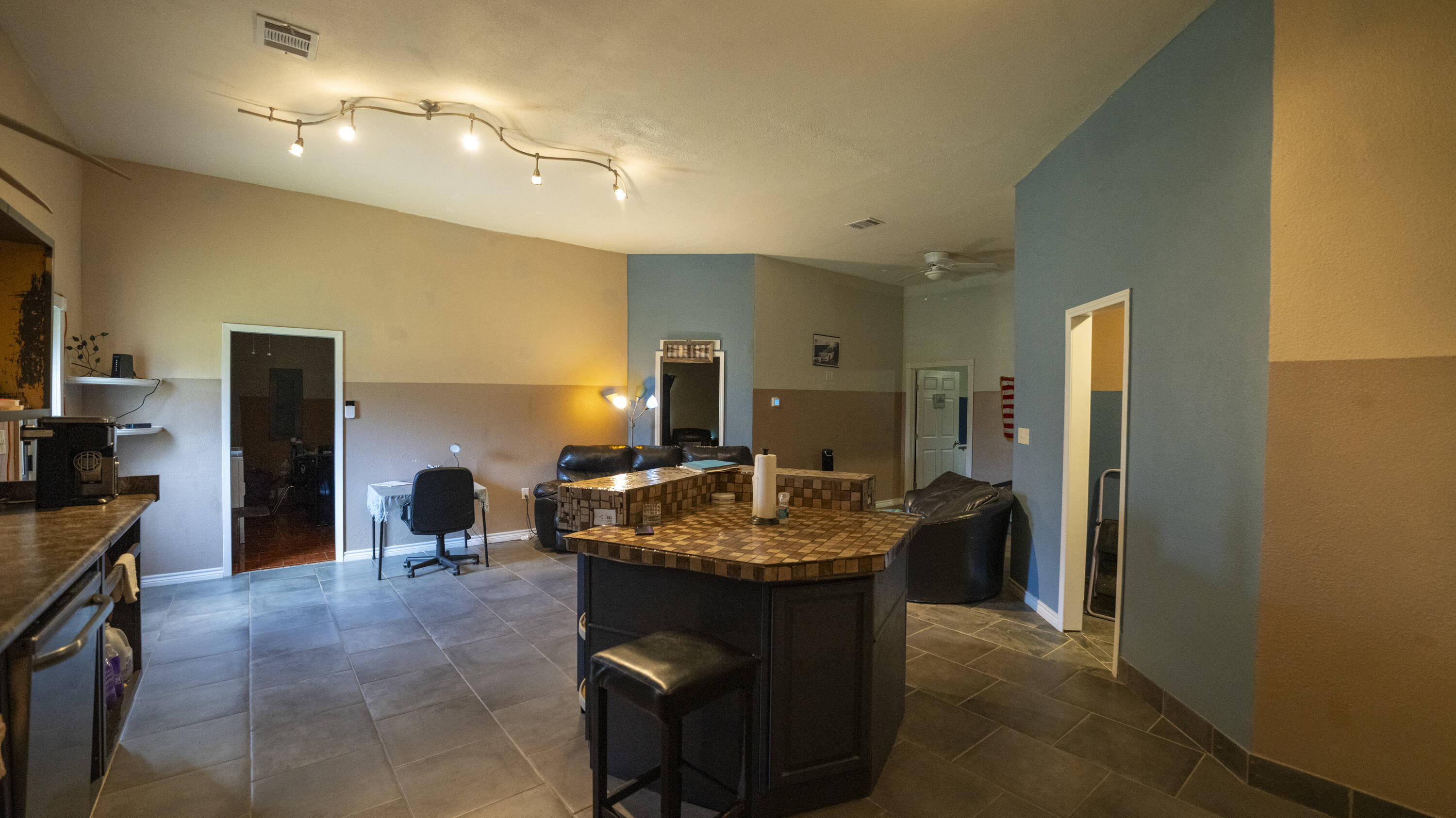 Barndominium on 3 acres with pond and versatile living spaces.