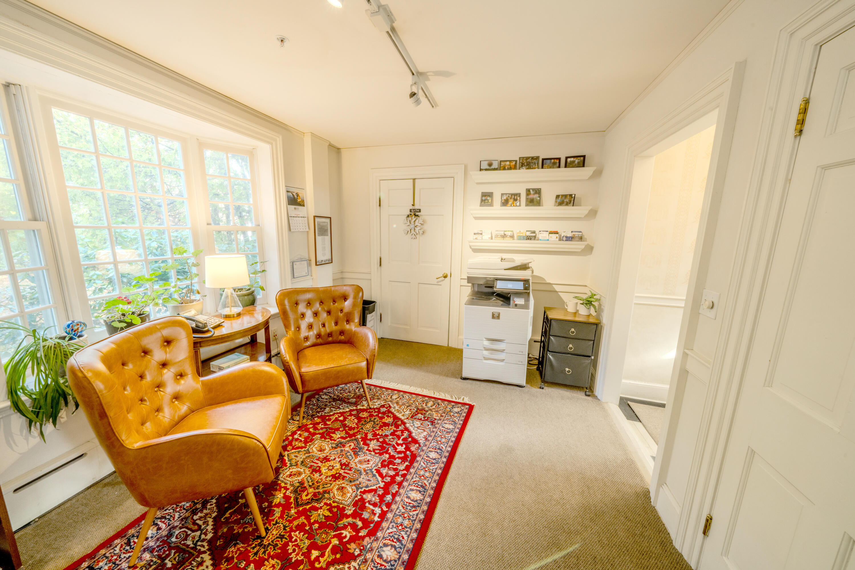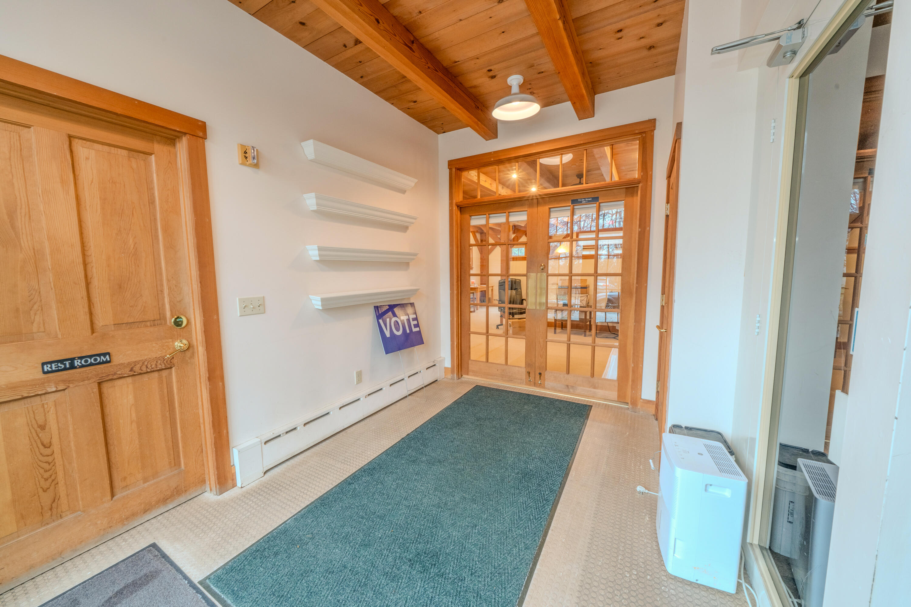 Located at 73 Elm Street, this property features two office buildings situated on a 1.2-acre lot. The grounds are landscaped with stone walls, sidewalks, and plantings. The property includes 29 marked parking spaces and 125 feet of frontage on Route 1 (Elm Street). The front building, renovated in 2000, offers 3,777 square feet of usable floor area. It includes a conference room with a hand-painted mural, stenciling and a hand-painted mural in the center hall, a reception area, a galley kitchen, private offices, 2 1/2 bathrooms, a sprinkler system, and fireplaces. An unfinished basement and an open porch are not included in the usable area. A new furnace was installed in 2023. The rear building, constructed in 2000, provides 2,400 square feet of usable floor area with western fir, post & beam construction. It features an ADA wheelchair elevator, an EV car charger, a full bathroom, a conference area, an open floor plan, a private office, and cathedral ceilings on the second level. The building has a metal roof. A 1,200 square foot basement area with a poured concrete floor, used for storage, is not included in the usable area. The combined usable area of both buildings is approximately 6,177 square feet. Heat pumps for AC in both buildings are working, however they are over 20+ years old and will convey in as in condition.