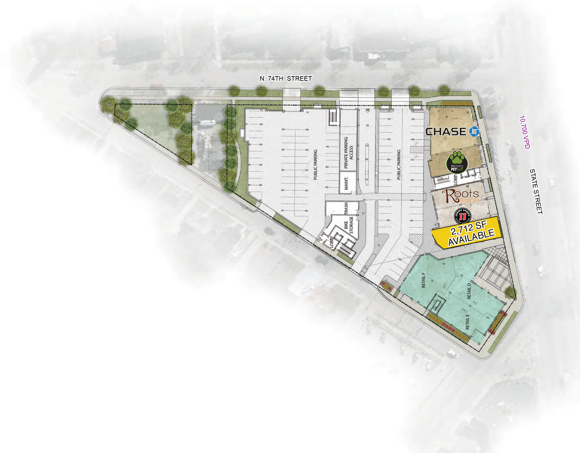 High-traffic retail space with dedicated parking in Wauwatosa's Village.