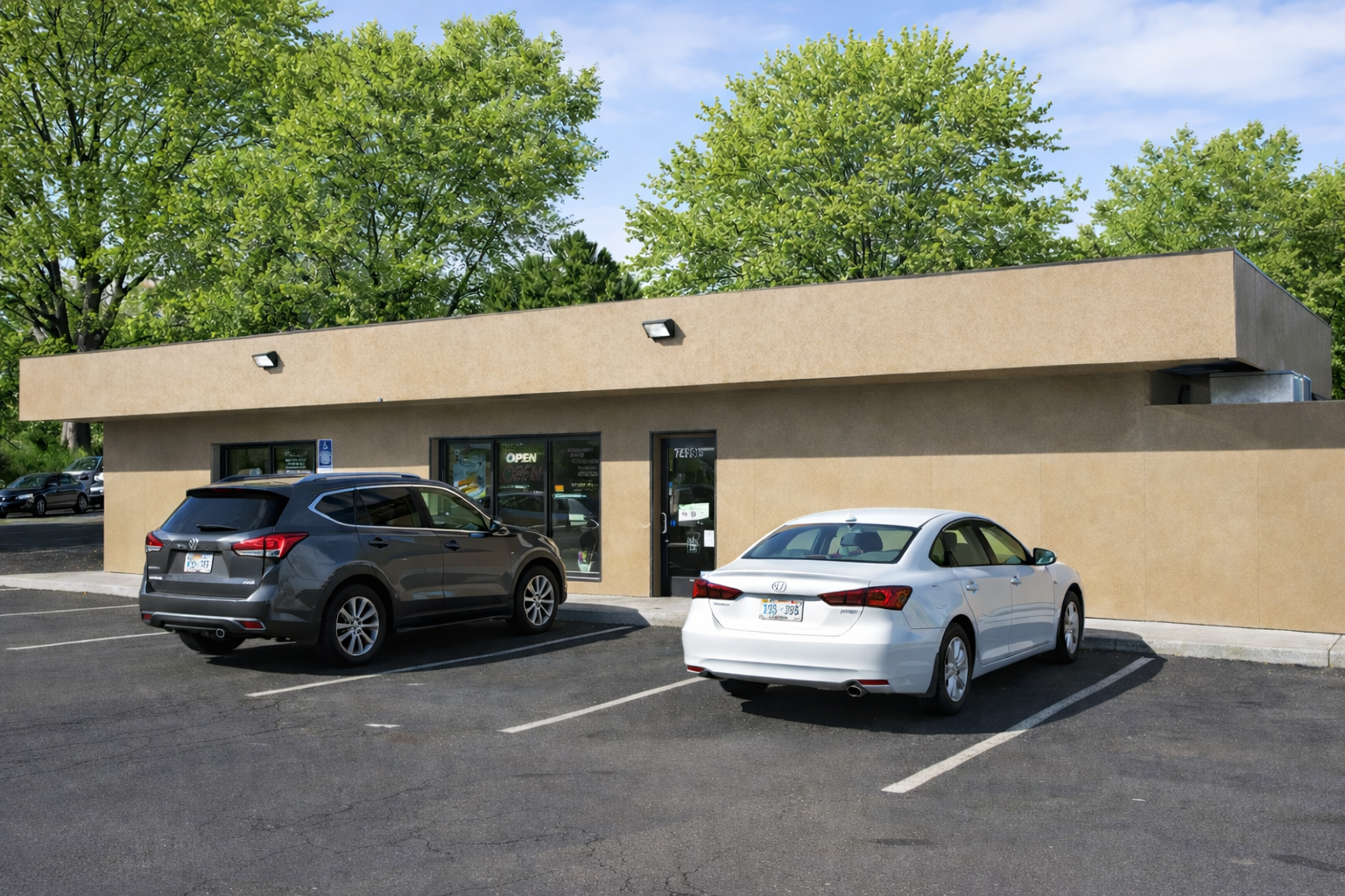 Retail space with rare off-street parking and pylon signage.