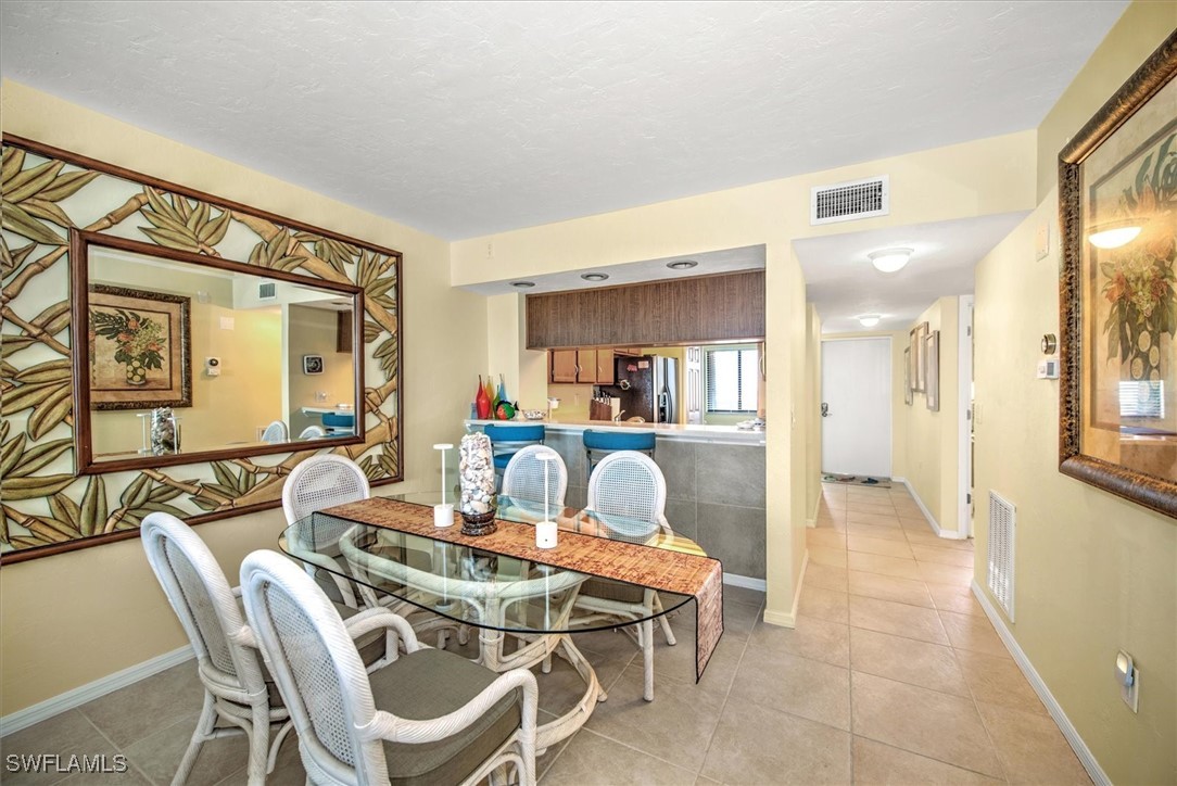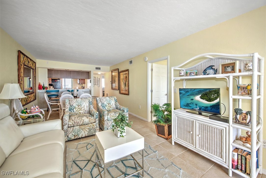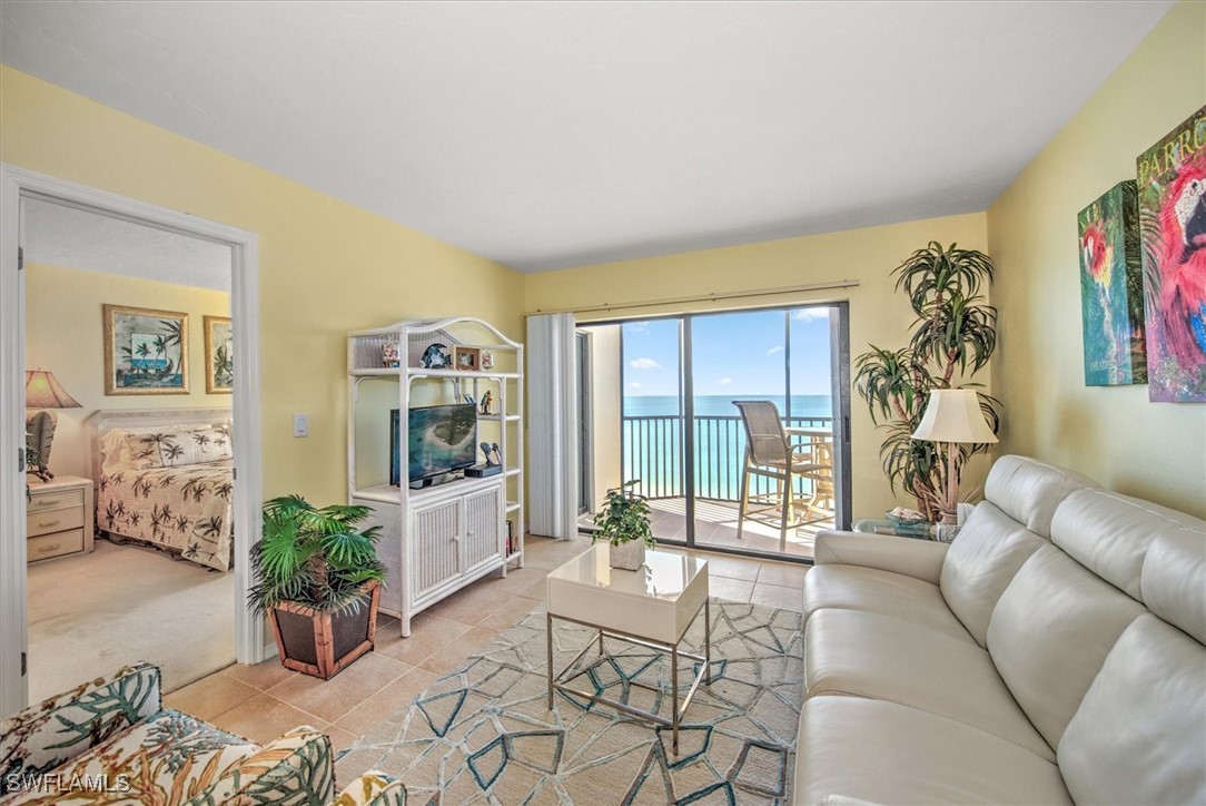 This spacious 2/2 condo at Riviera Club offers direct Gulf views and is being sold turnkey. The property features a split floor plan, tile flooring in the main living areas, and a screened lanai. The kitchen includes wood cabinetry, solid surface counters, and stainless appliances, overlooking the living and dining areas with Gulf views. Riviera Club is one of the few beachfront complexes allowing short term rentals with a 14-day minimum. The property is located close to Santina Plaza shops and restaurants, with quick access to Bonita and Naples. The unit has a size of 1042 square feet.