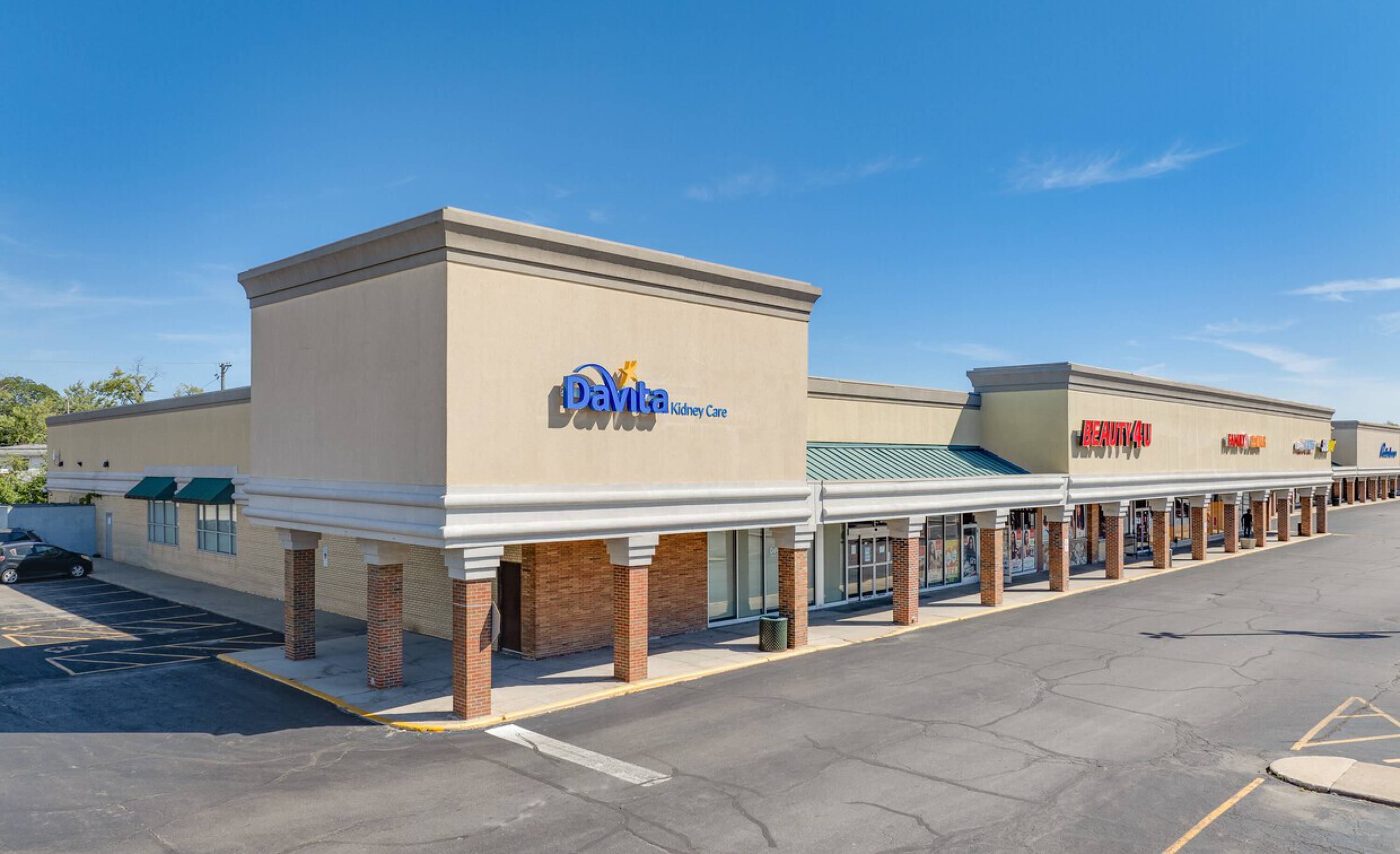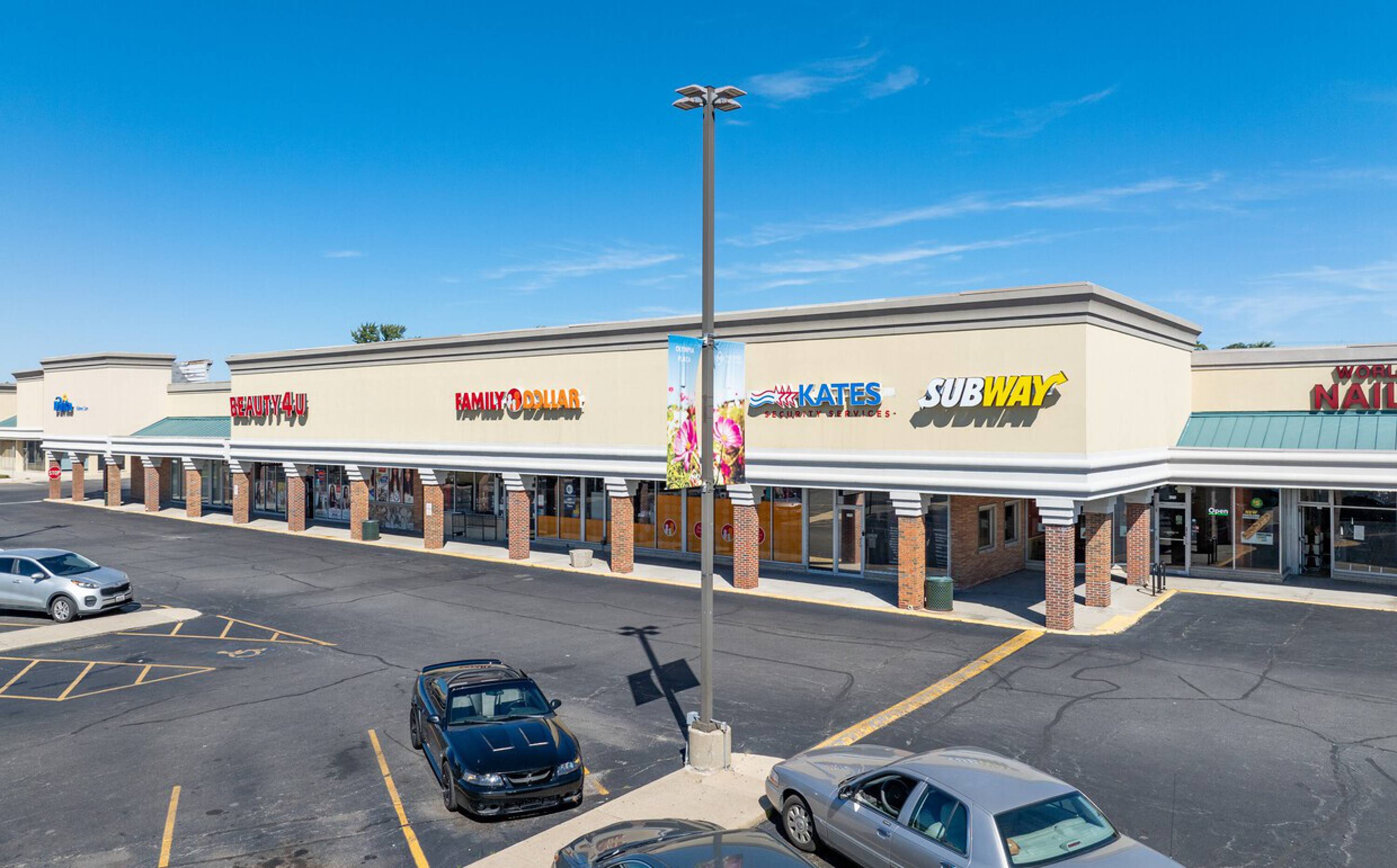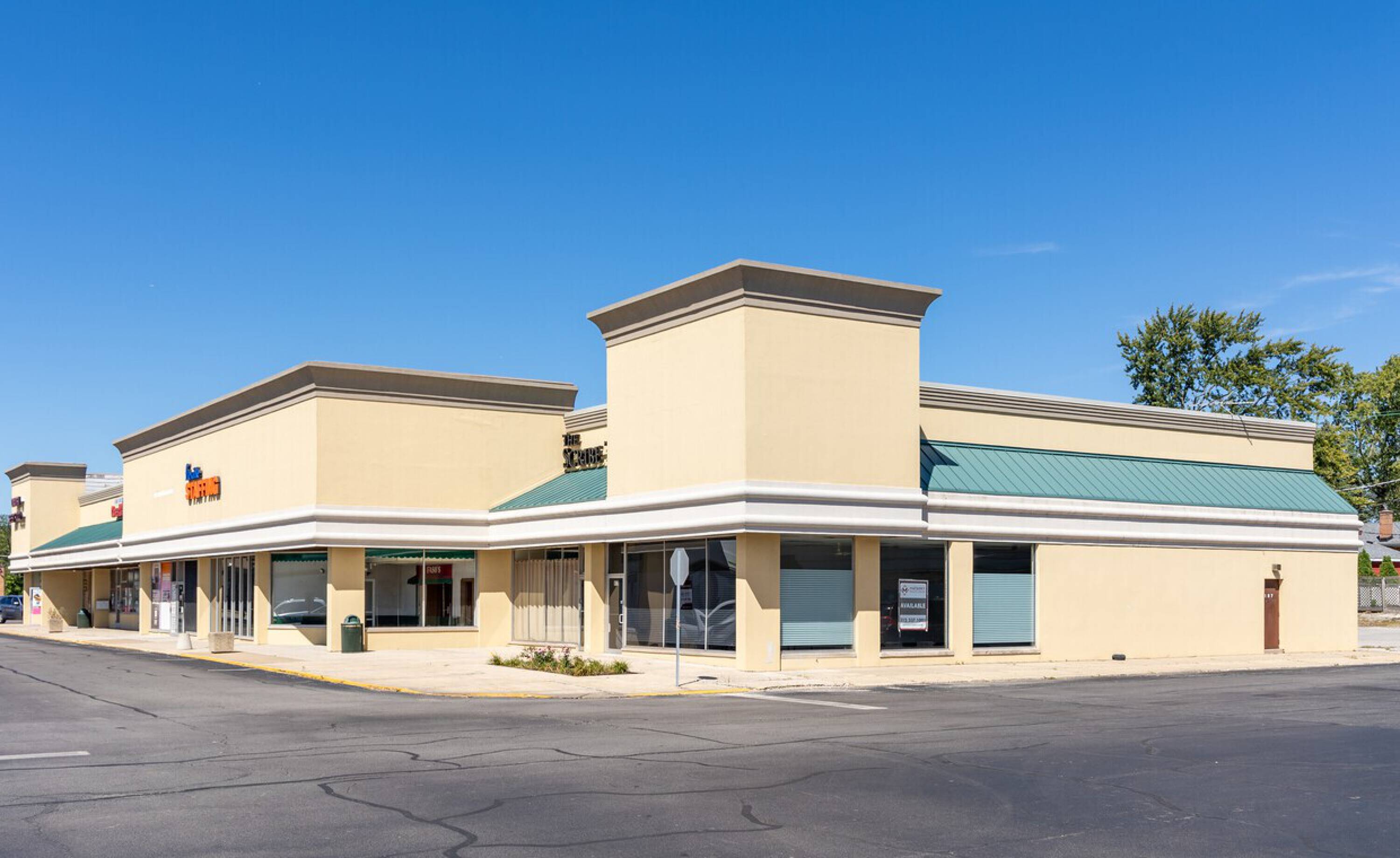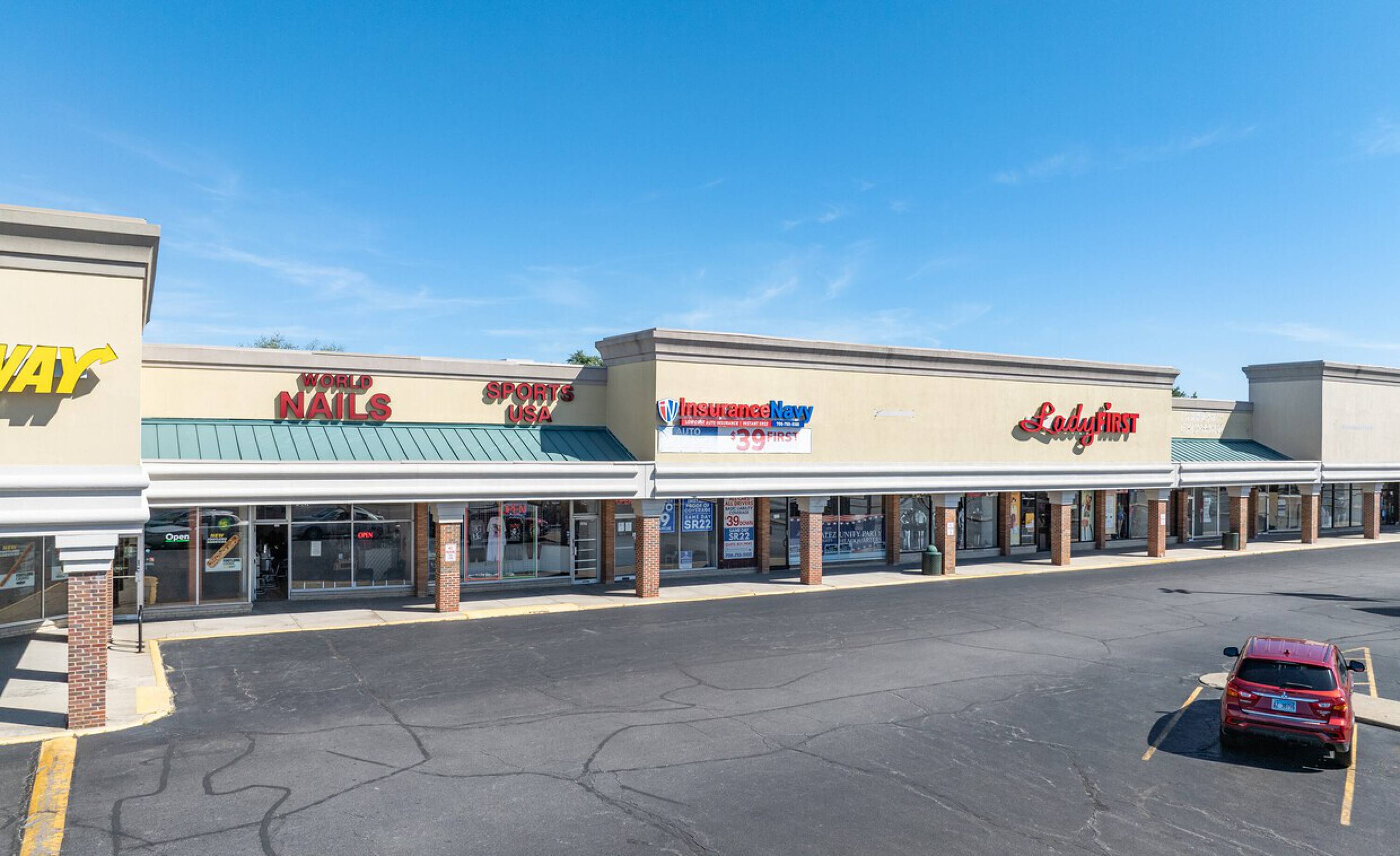 Retail spaces in a high-traffic shopping center with ample parking.