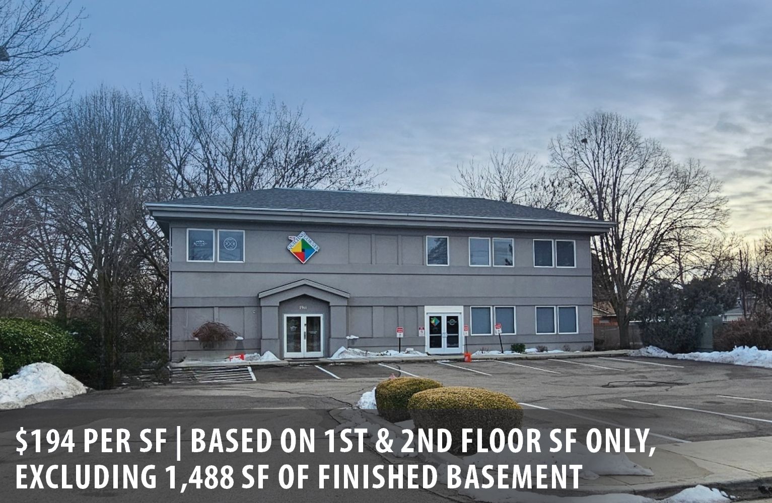 Two-story office building with monument signage and ample parking.