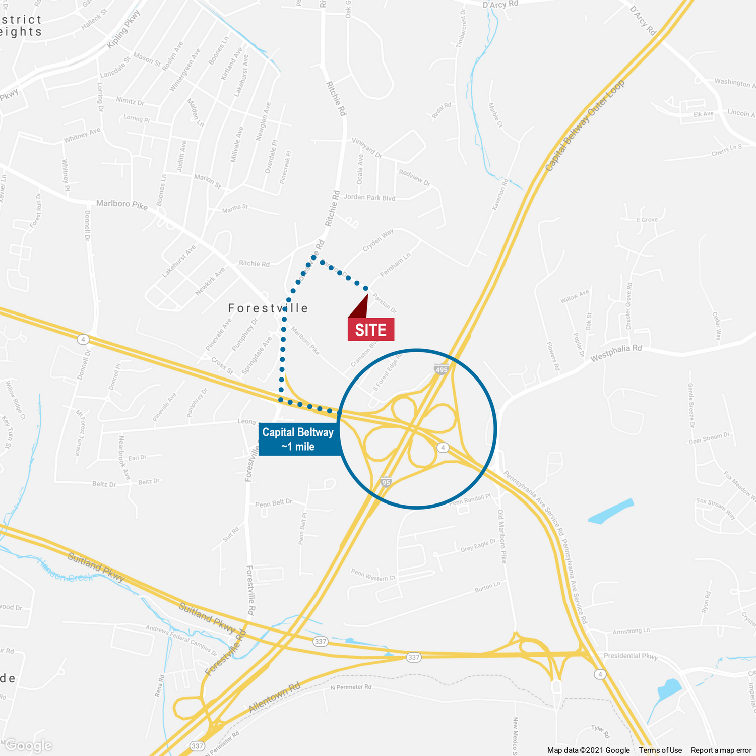 The industrial building at 7925-7929 Parston Drive totals 26,439 square feet. The building has undergone numerous renovations and improvements, including a new roof, a new exterior staircase, new curb and gutter, six new loading doors, an updated loading platform for 53' tractor trailers, a resurfaced interior floor, and new HVAC for the existing office. The property is zoned I-E (Industrial Employment) and is fully sprinklered with a wet system. The building has 18' clear ceiling height and 6 new garage/loading doors. The property is fenced and secure with ample parking. It features 600 amps of 120/208v 3-phase power, with three meters. The building, situated on 1.01 acres, is configured as 95% warehouse and 5% office space. The building has the ability to be demised for multiple tenants. The property is conveniently located near major transportation routes, including the Capital Beltway (I-495), Pennsylvania Avenue (Route 4), and Suitland Parkway, providing immediate access to these routes. The location is suitable for serving Washington DC, Northern Virginia, and Maryland suburbs. Nearby amenities offer various services, including grocery shopping, restaurants, gas and convenience stations, and banks.