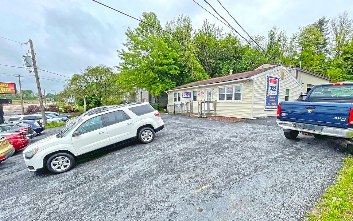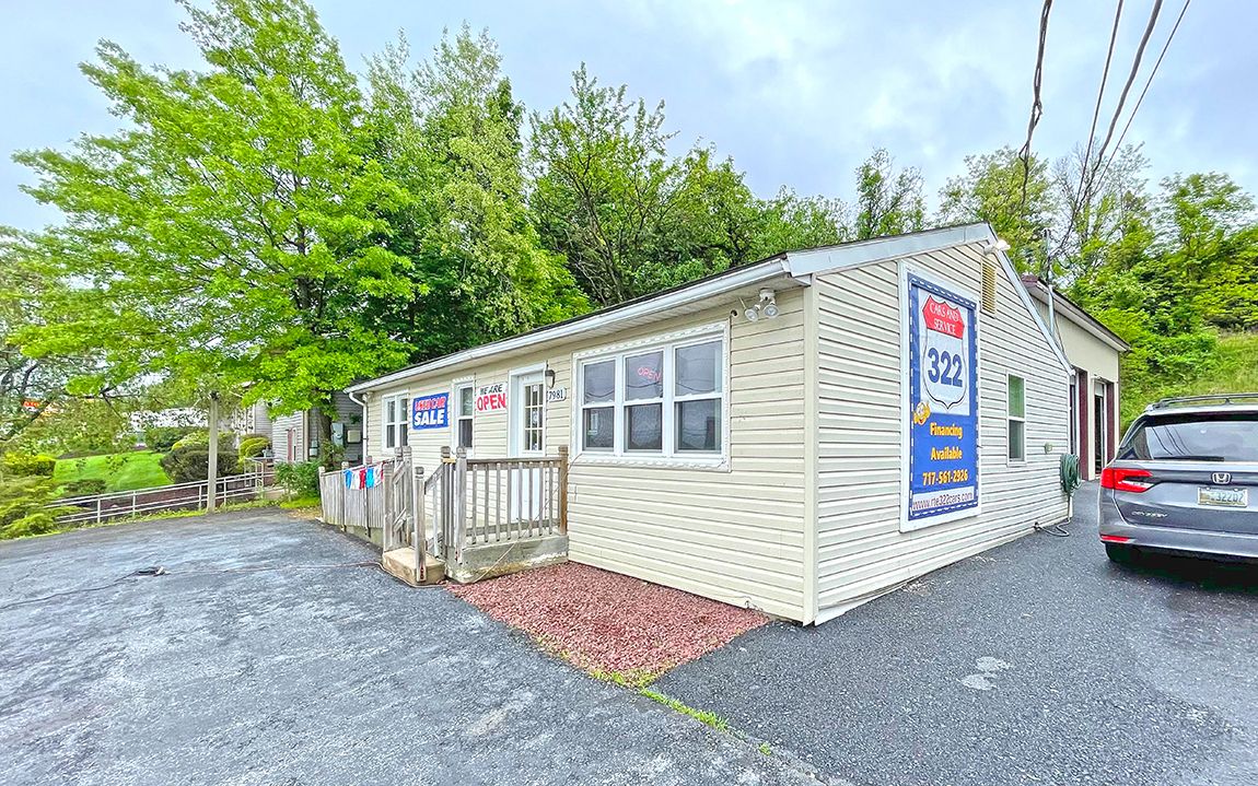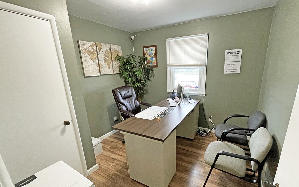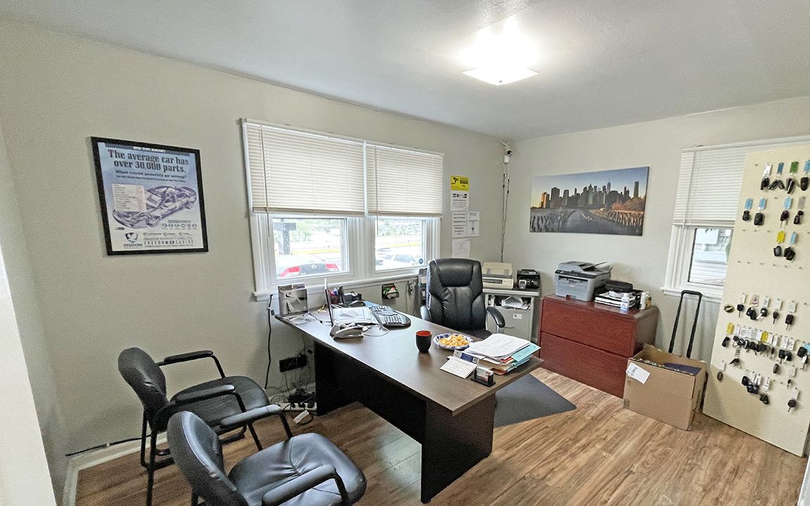 Commercial property featuring an office building and a two-bay garage.