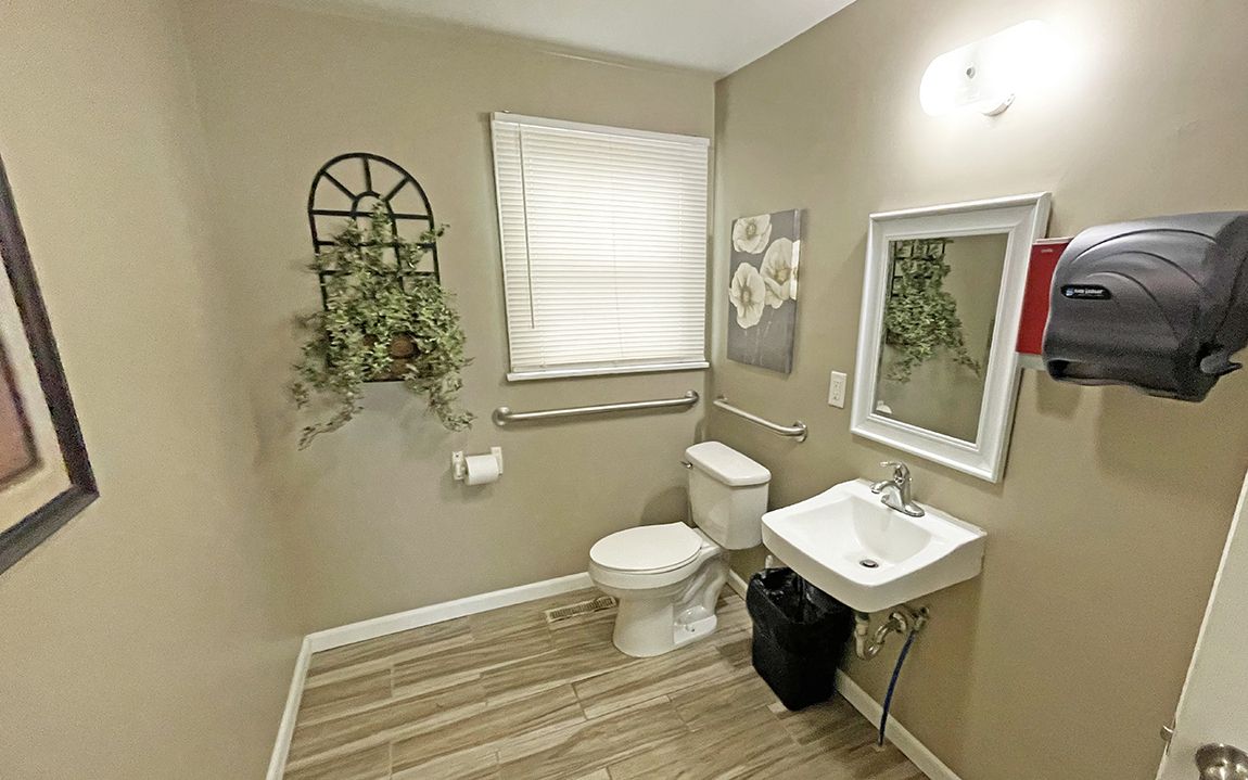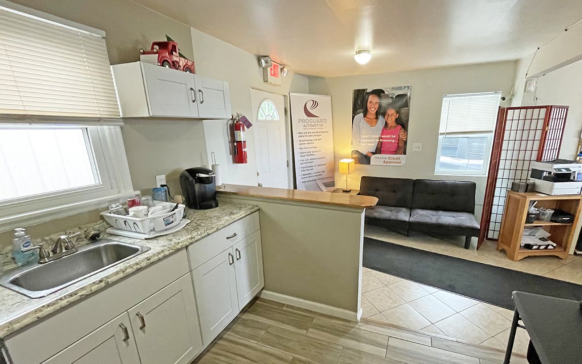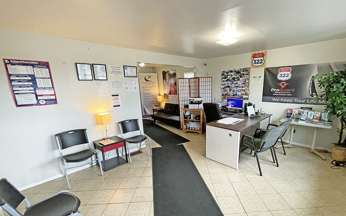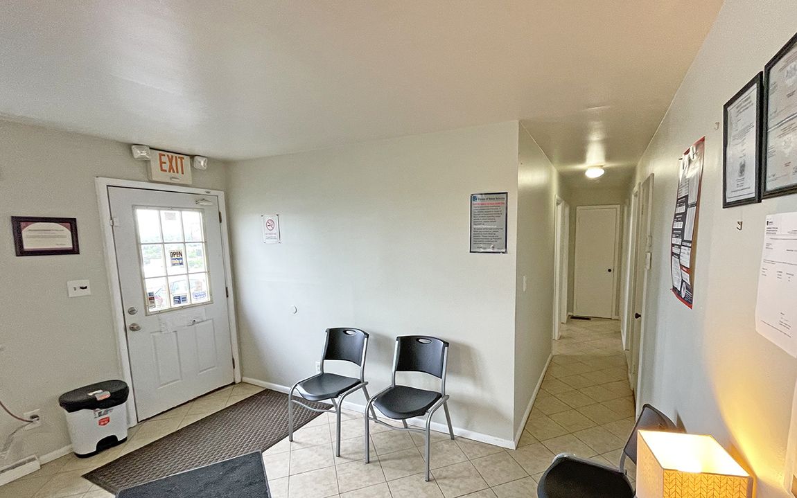 Commercial property featuring an office building and a two-bay garage.