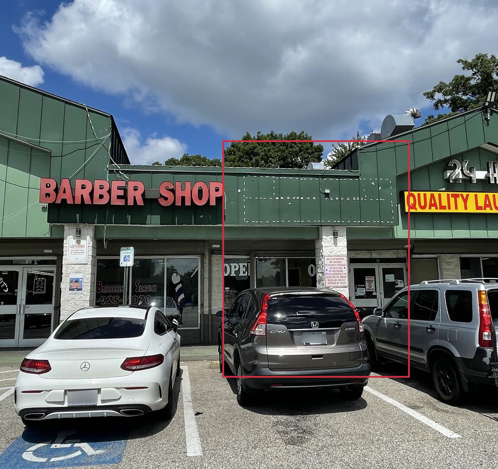 Neighborhood retail center with ample parking and pylon signage.