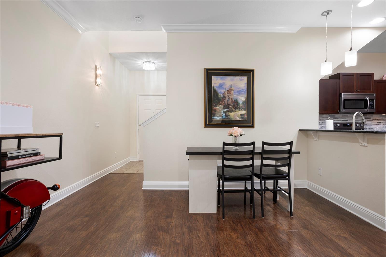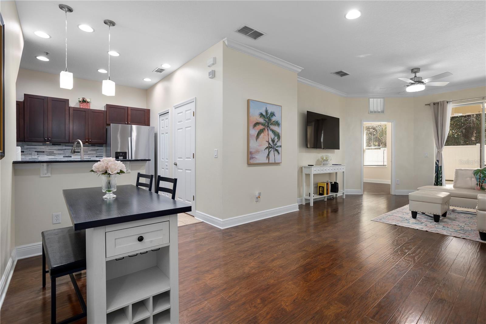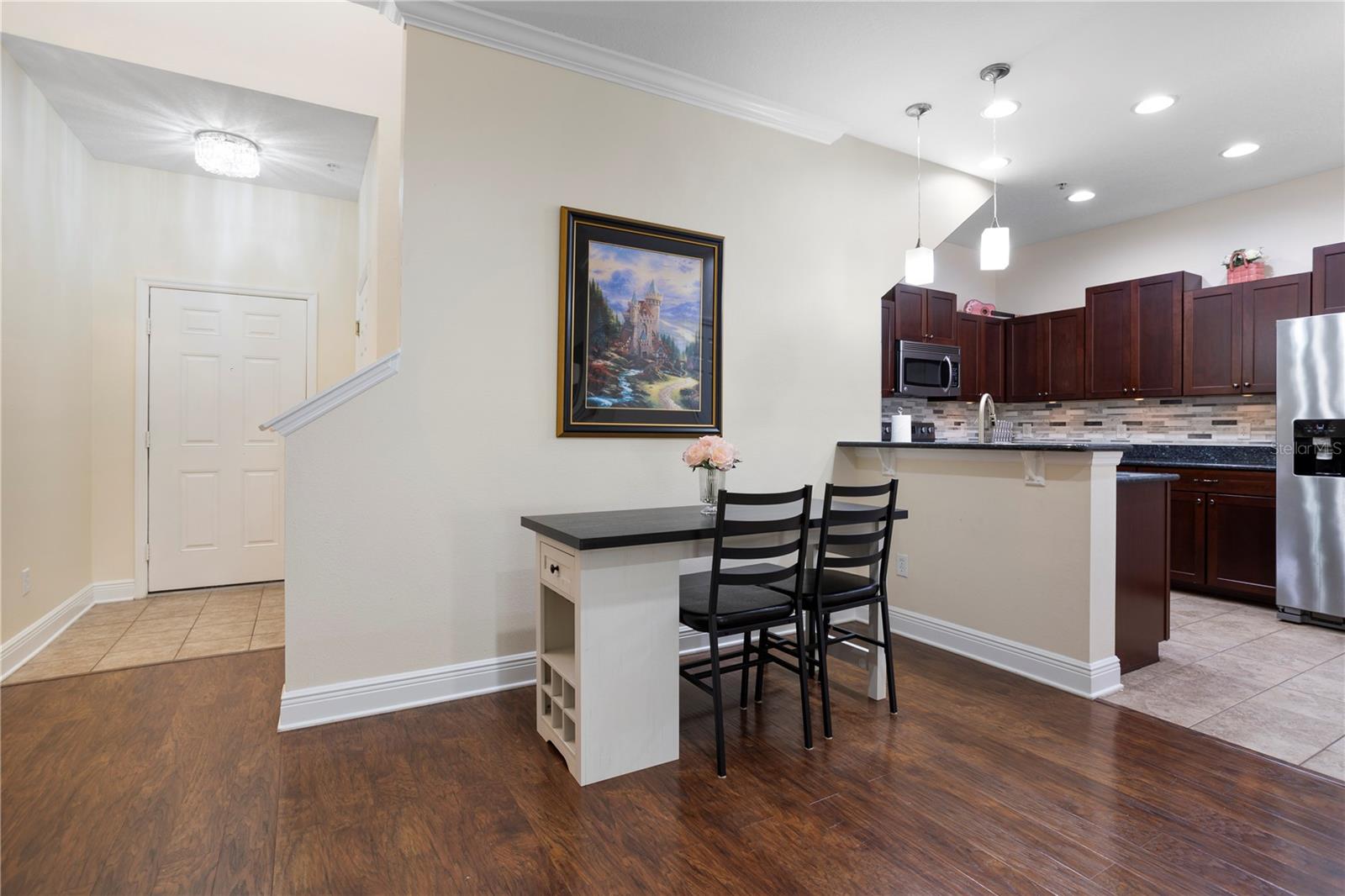 This two-story condo features 3 bedrooms and 2.5 bathrooms. The property is located in a peaceful part of the neighborhood and backs up to serene greenery. The interior includes an oversized loft area upstairs and a versatile bonus room. Light fixtures add a stylish touch throughout the home. The kitchen features stainless steel appliances and granite countertops. A private, fenced-in courtyard with a screened-in patio provides an ideal spot to unwind. The home includes a two-car garage. The gated community offers amenities, including a resort-style pool, playground, and clubhouse. The property is located near Walt Disney World and Horizon West, offering convenient access to shopping and dining. The property size is 1826 square feet.