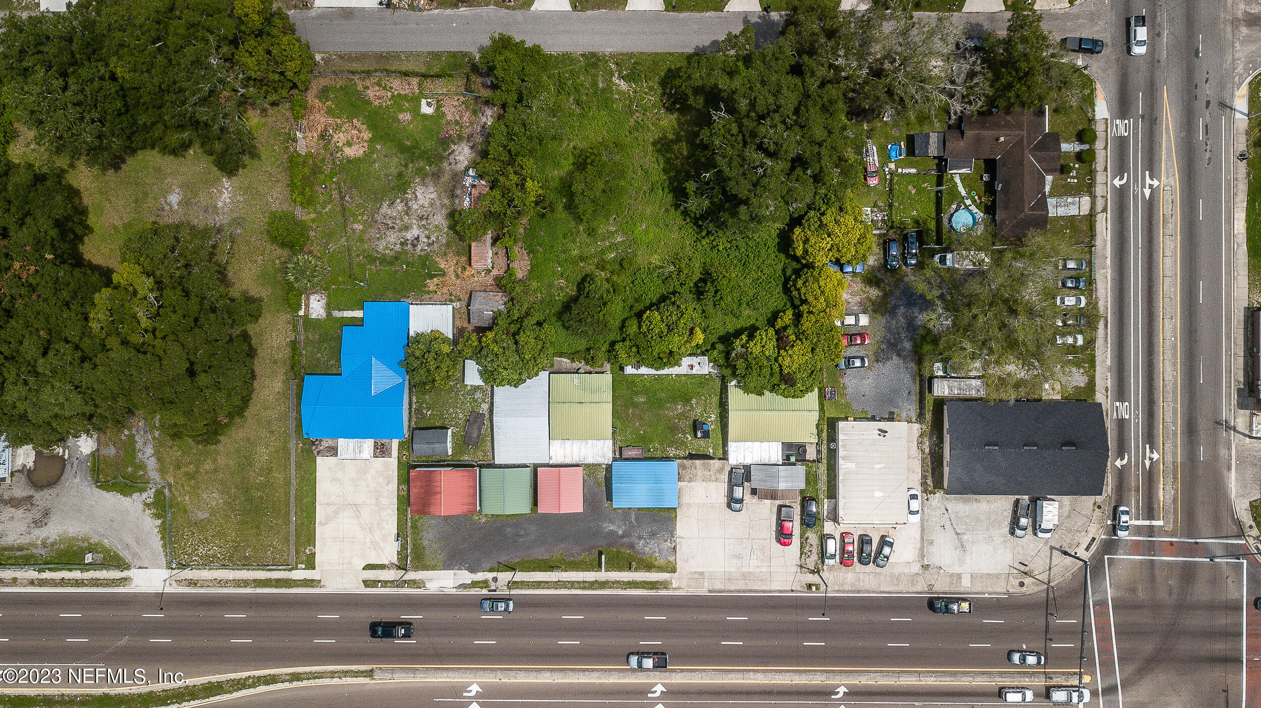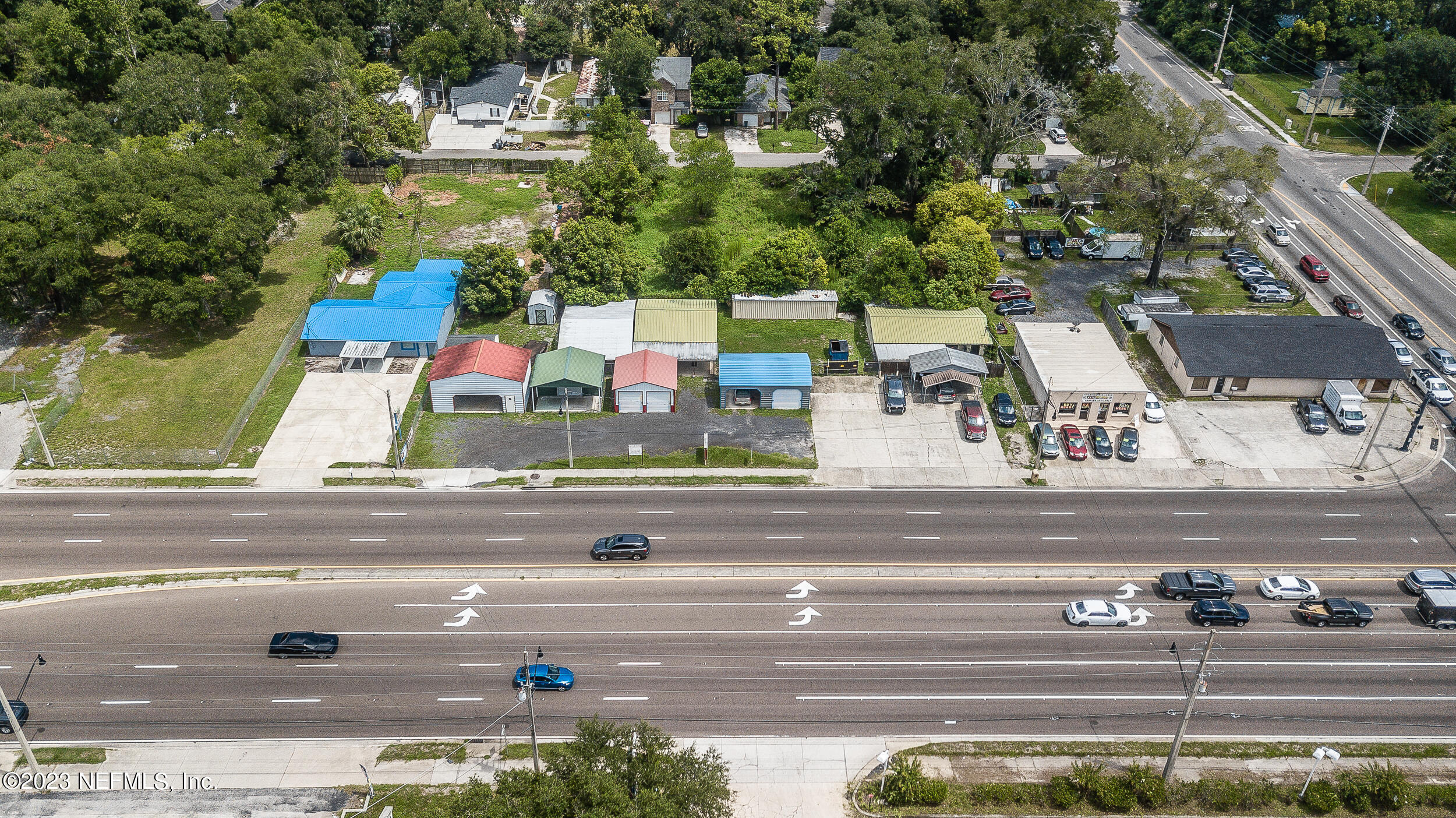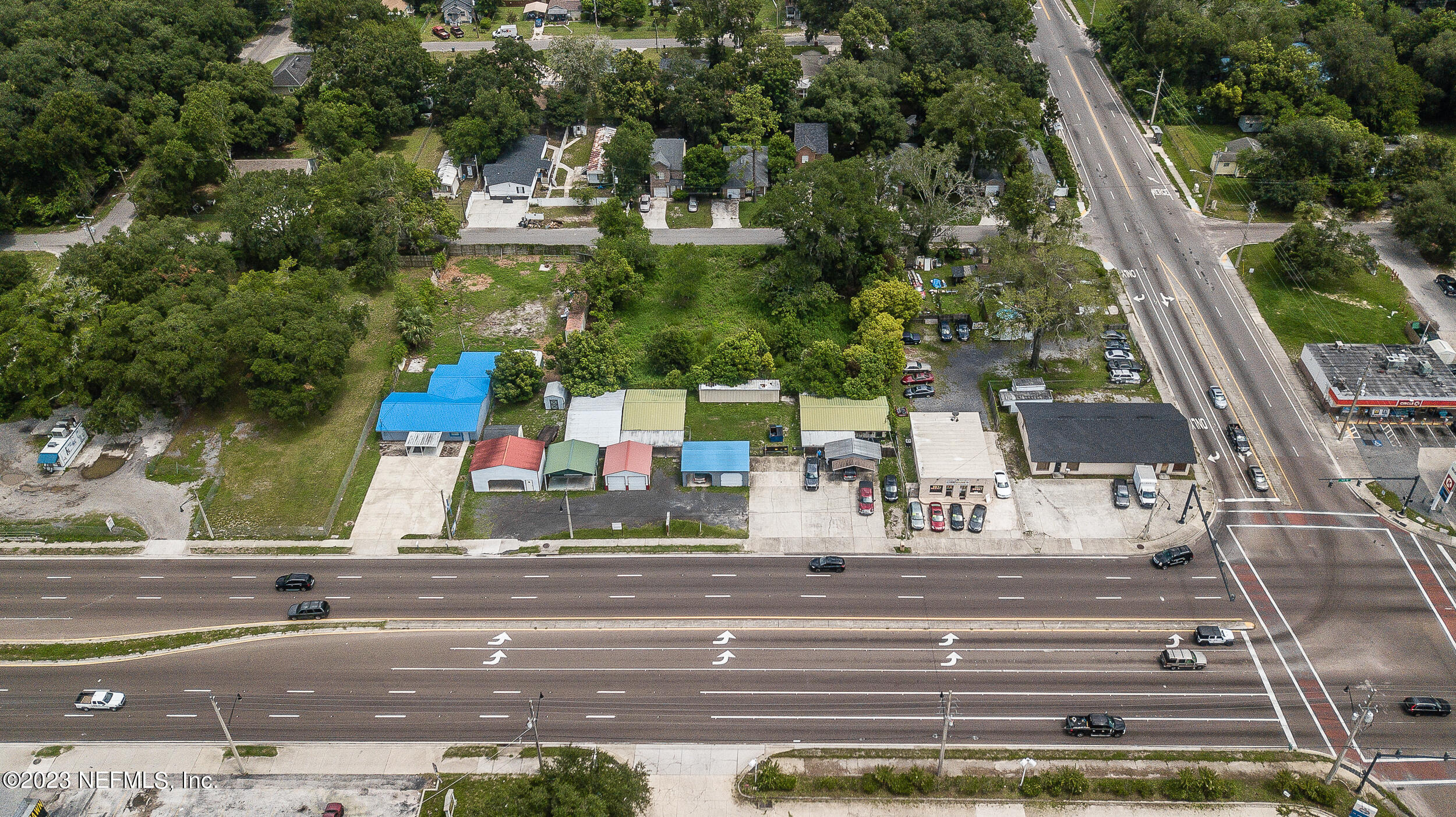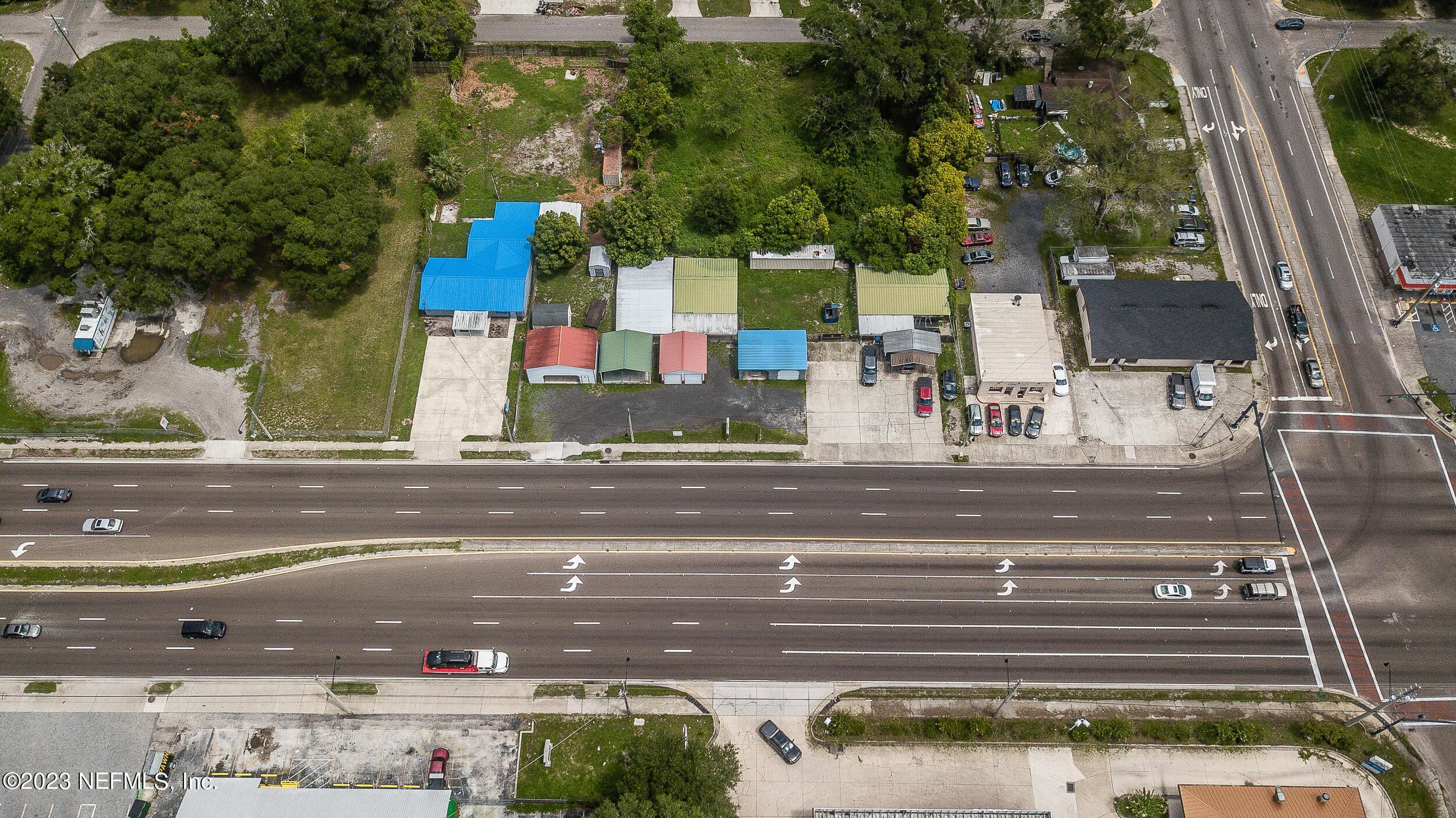 Commercial property with two buildings and high traffic frontage.