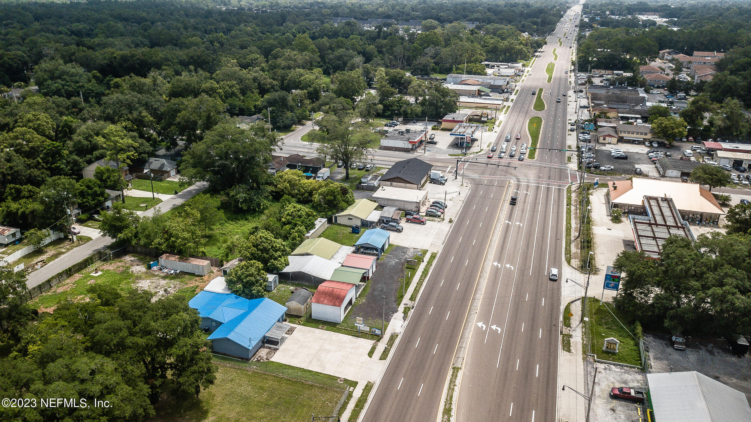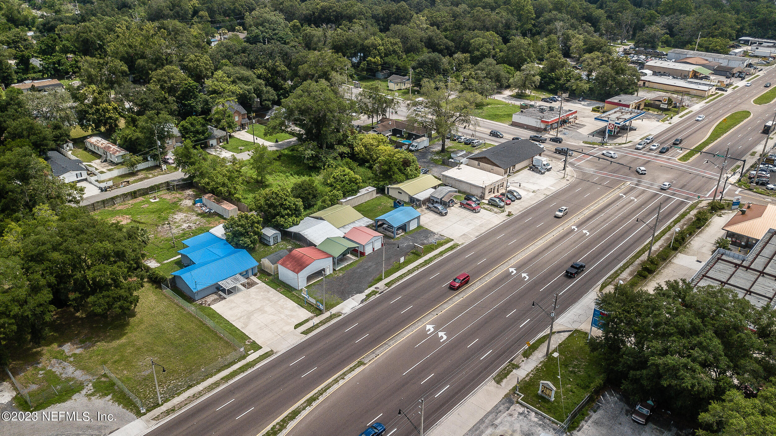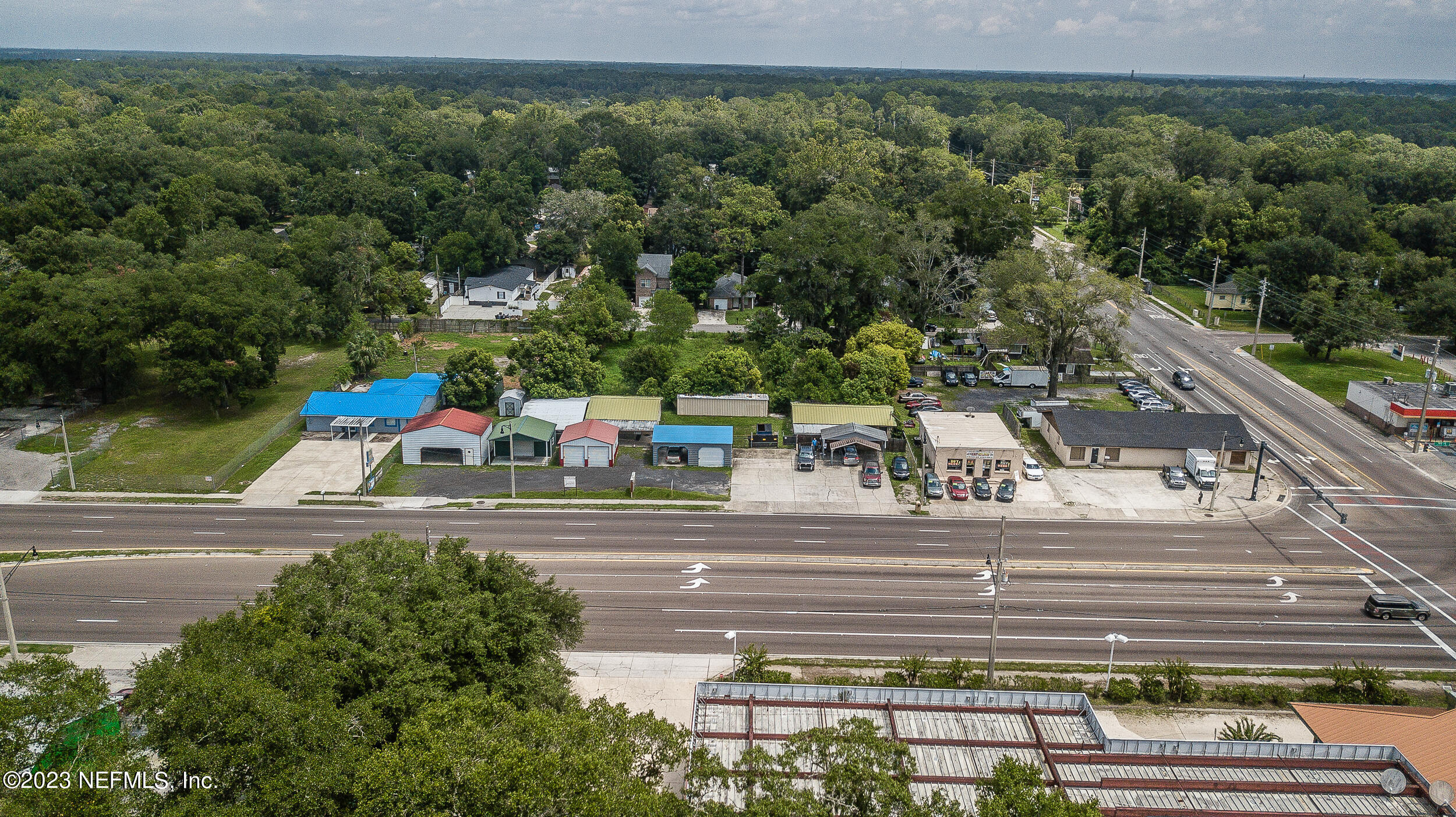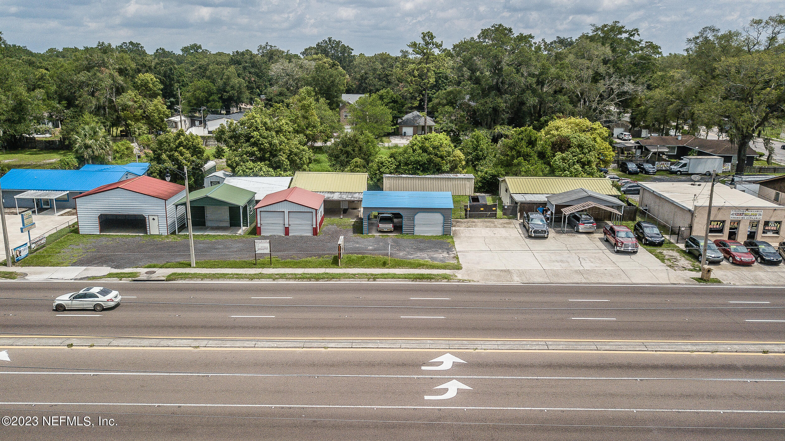 Commercial property with two buildings and high traffic frontage.