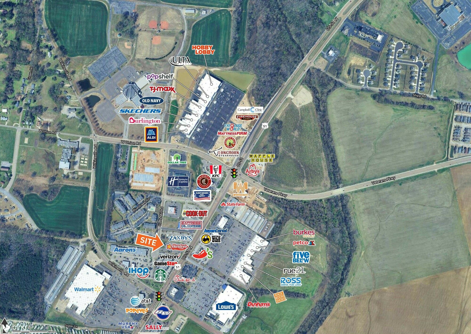A 3,029 square-foot freestanding restaurant building is available for sublease. The property is situated on 1.23 acres and includes a drive-thru and ample parking. It has direct access to Highway 51 and Creek Mill Court. The location is on the west side of Highway 51, just north of Wilkinsville Road in Millington, Tennessee. Area retailers include Walmart, Lowe's, Dunham's Sports, Hobby Lobby, TJ Maxx, Burlington, Ross, Petco, Ulta, Five Below, Old Navy, Starbucks, Chick-fil-A, Zaxby's, and Longhorn Steakhouse. The traffic count on Highway 51 is 23,150 AADT.