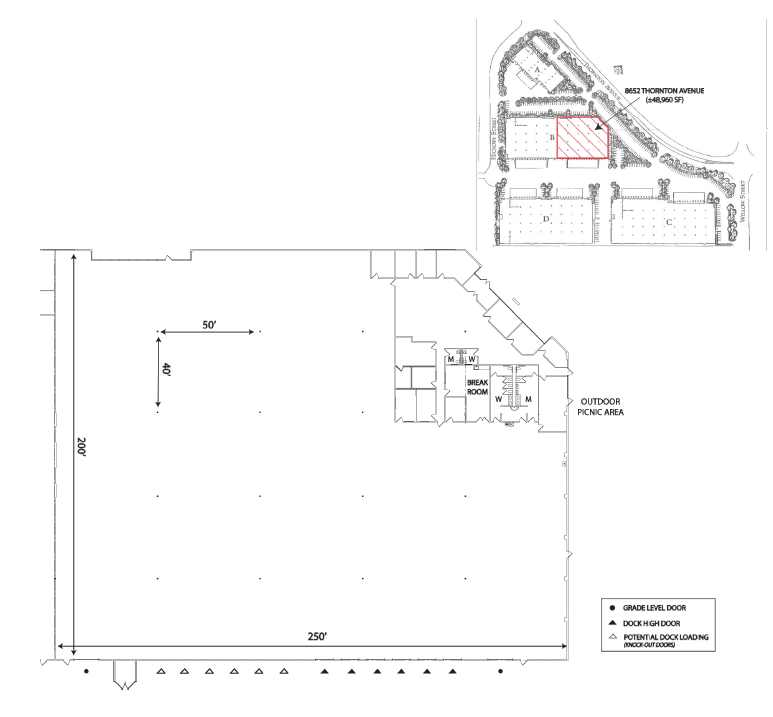 This industrial space for lease, located near Fremont Station, offers 48,960 rentable square feet, including approximately 5,300 square feet of office space. The warehouse features an approximate 24-foot clear height and a .60 gpm/3,000 SF sprinkler system. Power is supplied by 800 amps of 277/480v. The property includes six dock-high doors with the potential for twelve, along with two grade-level doors. The typical column spacing is approximately 40 x 50 feet. Additional features include abundant parking, power drops in the warehouse, an outdoor picnic area, and skylights in the warehouse. This corner unit offers excellent visibility and image.