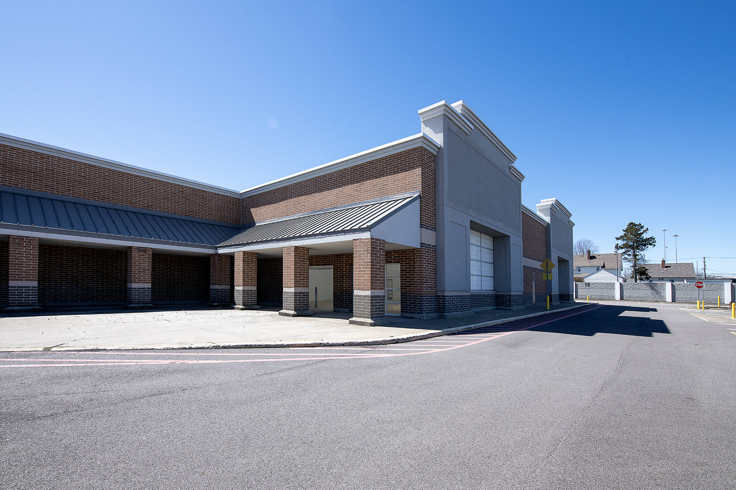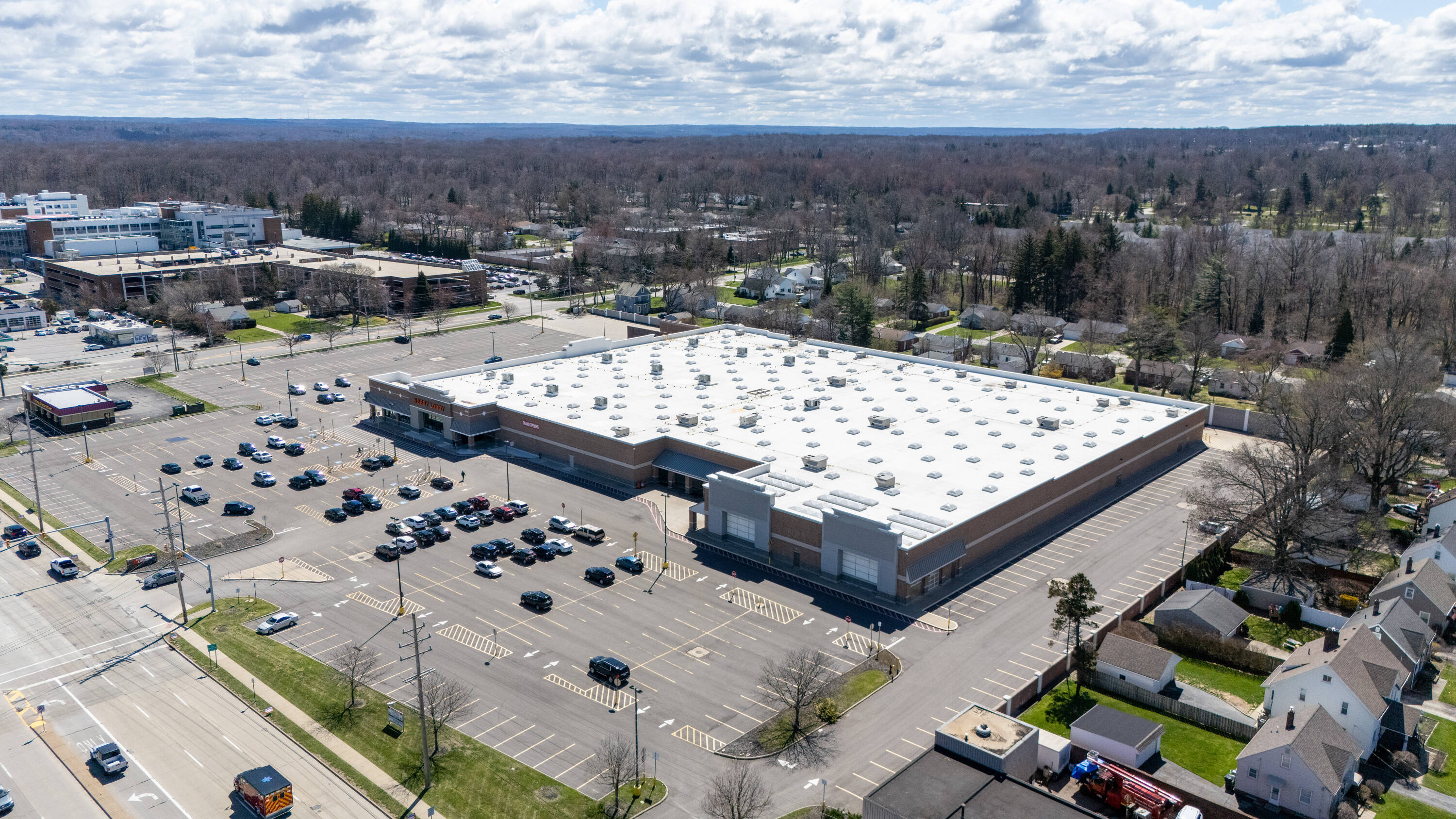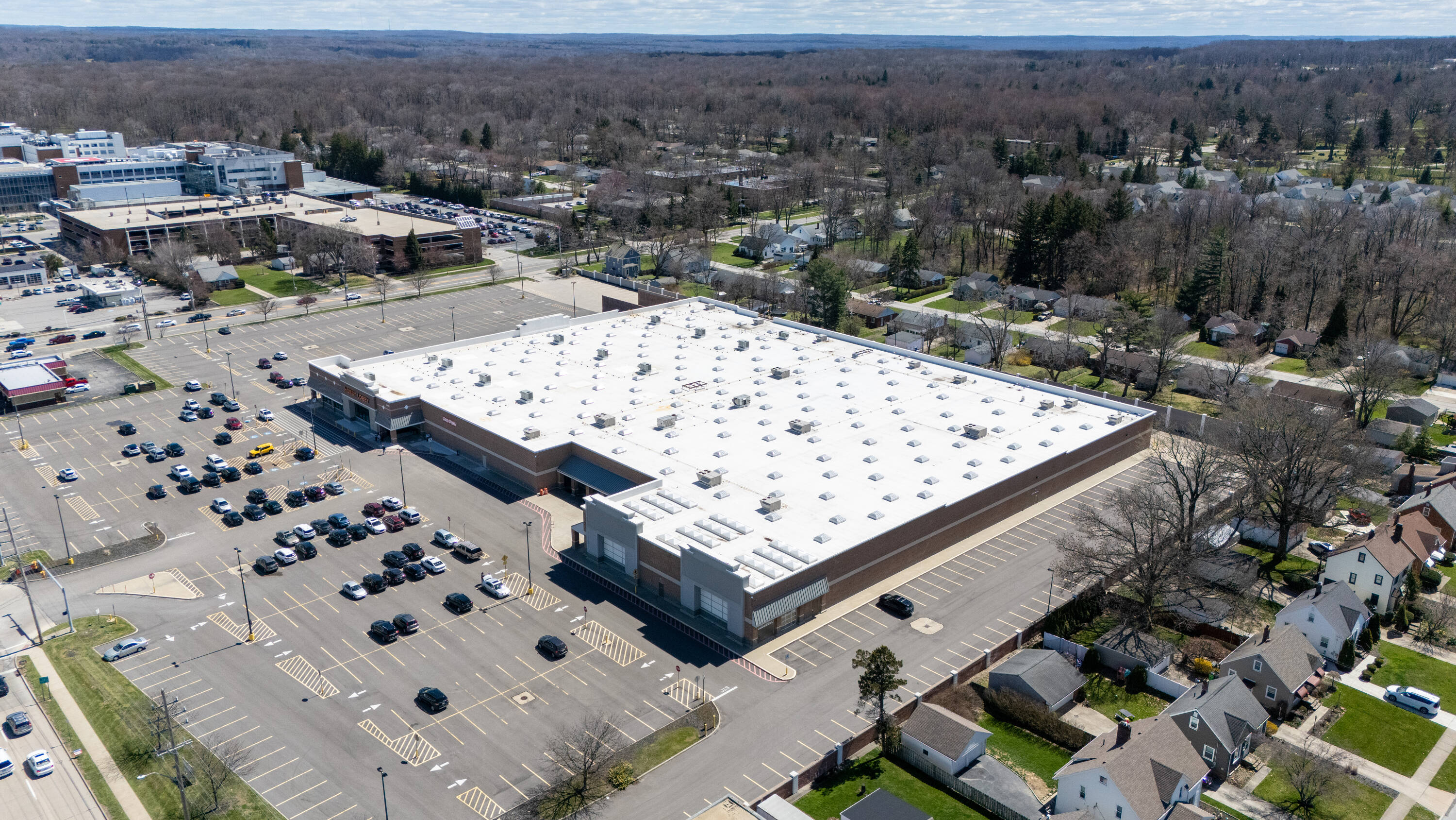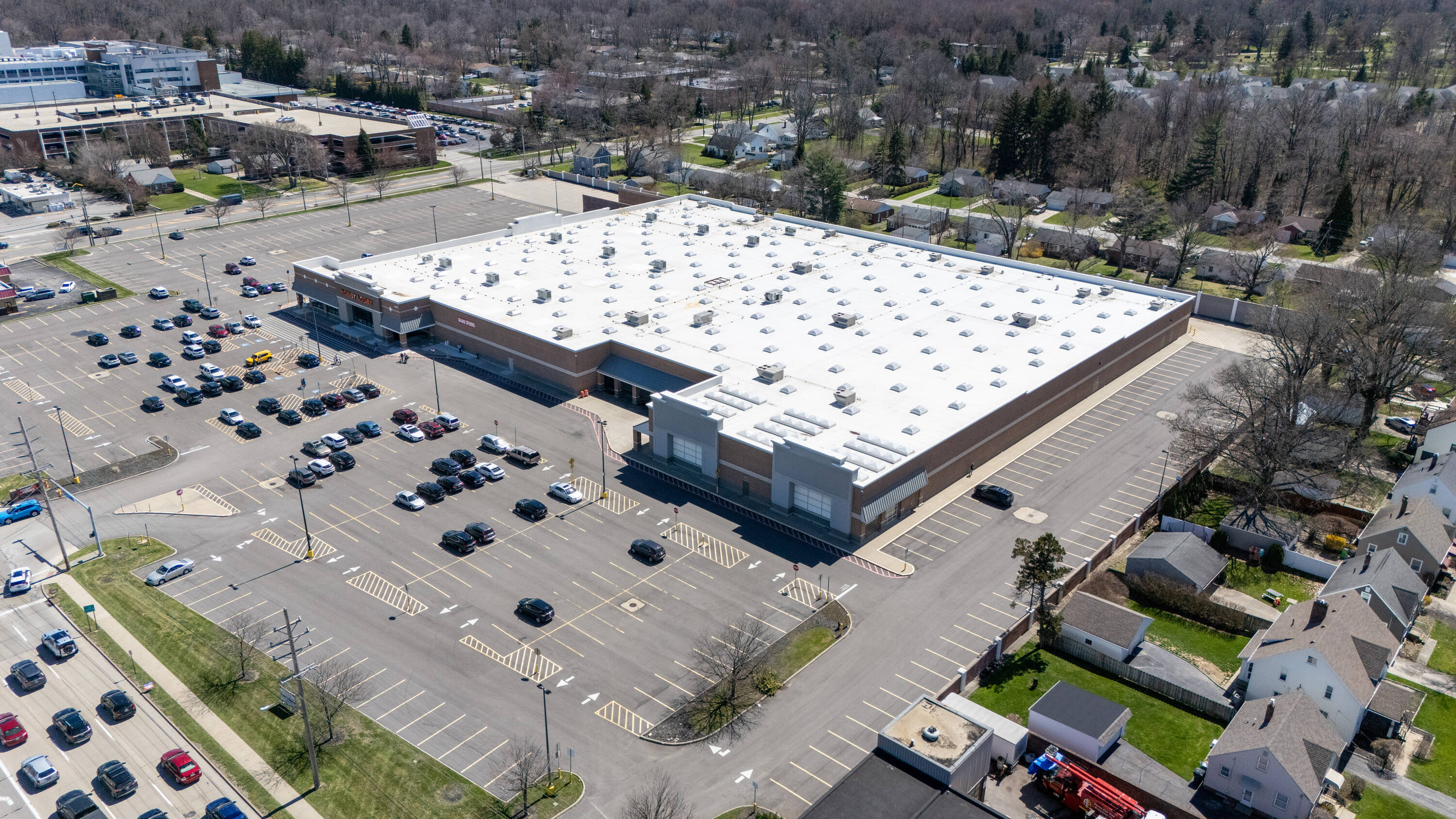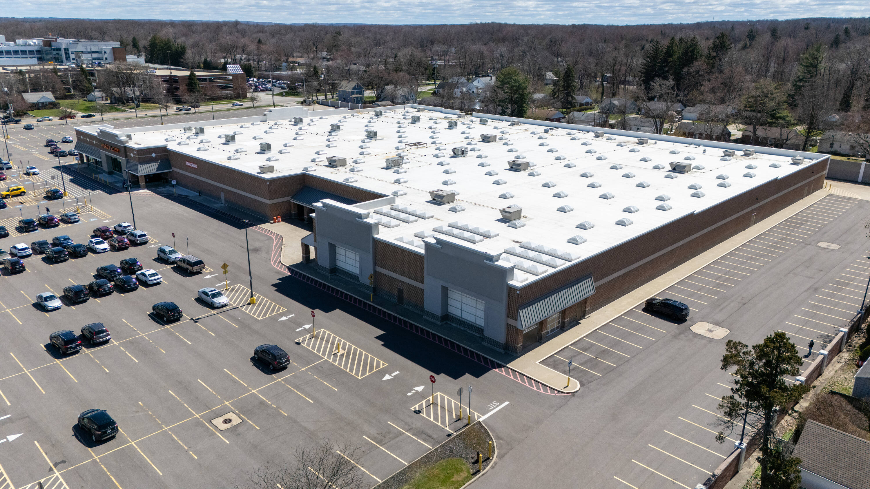 Retail space with new parking lot and roof near hospital.