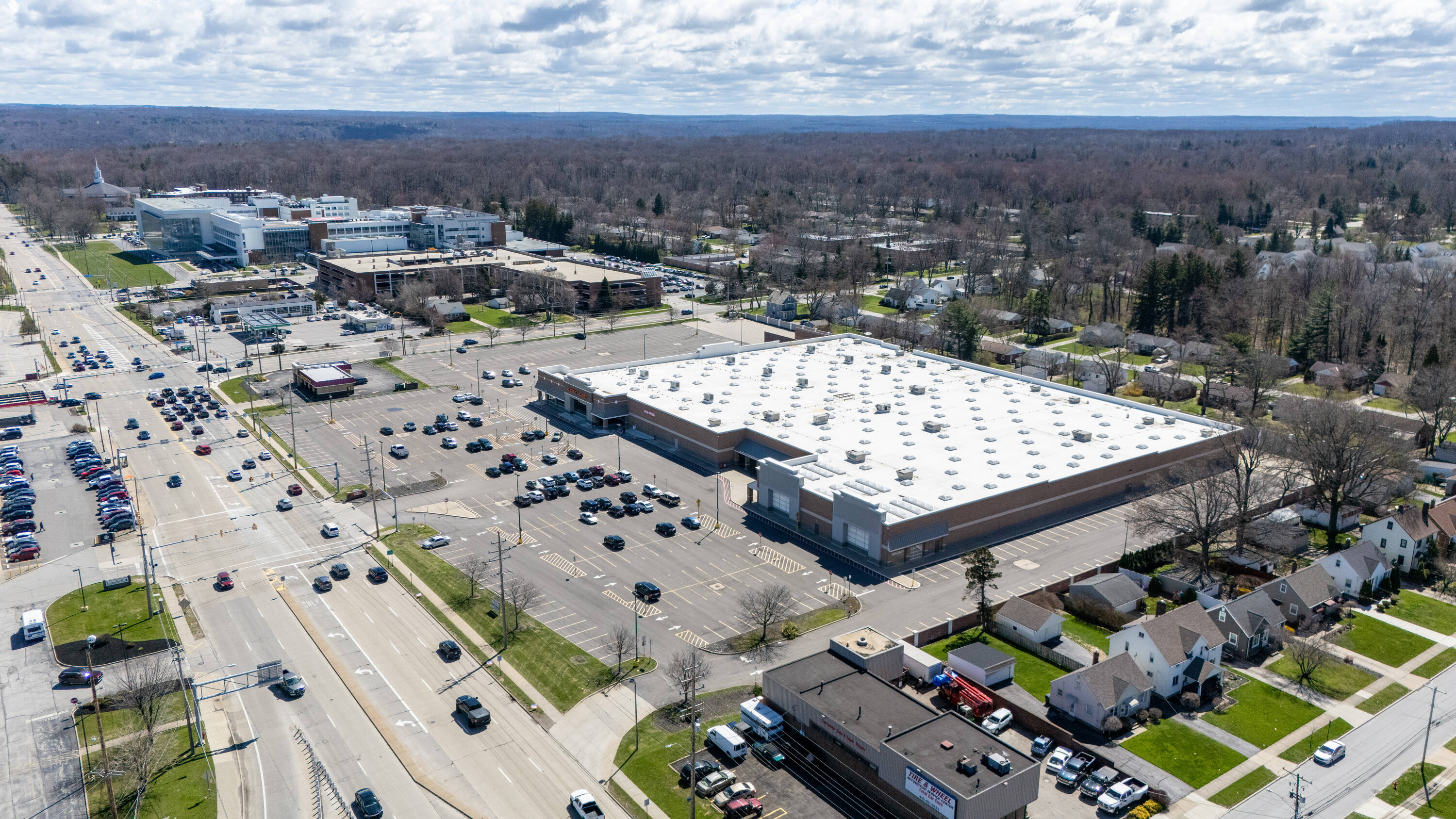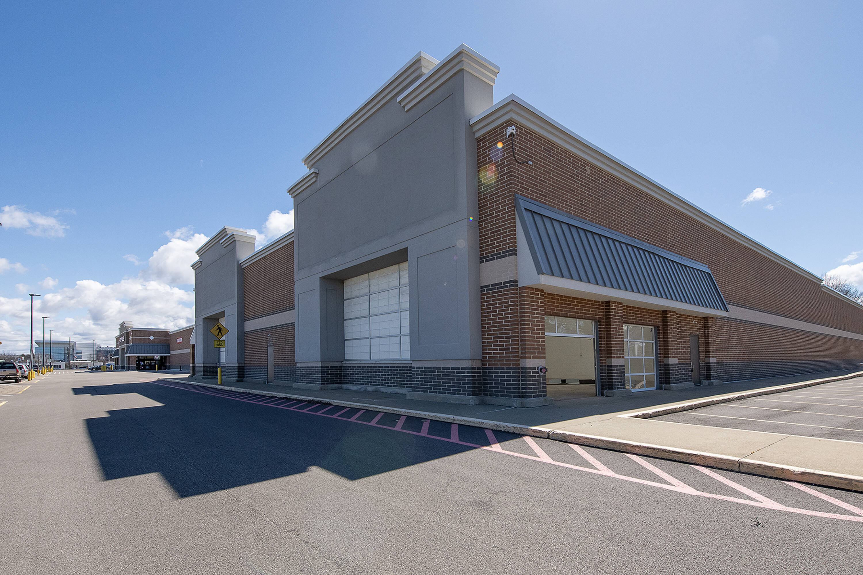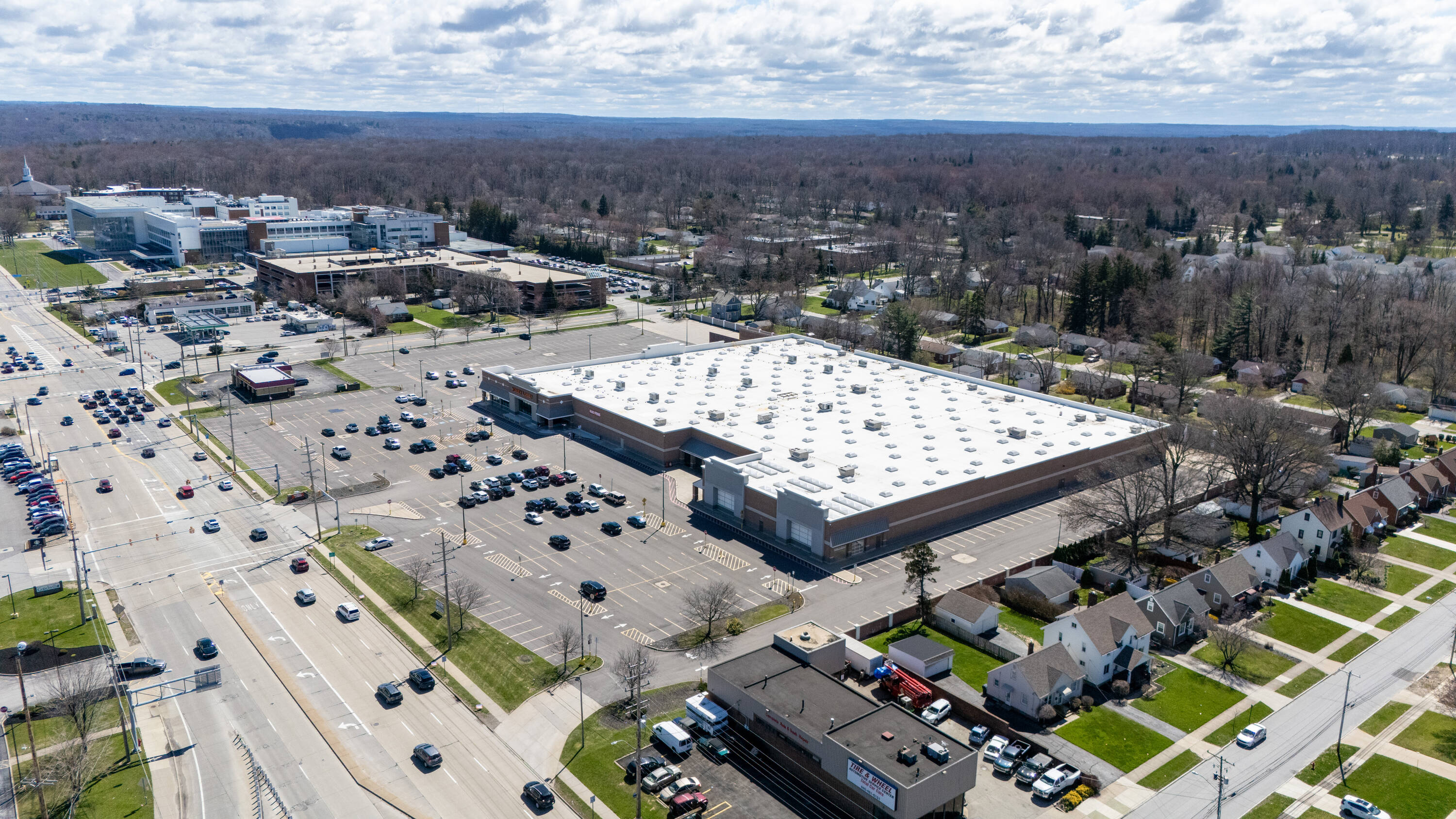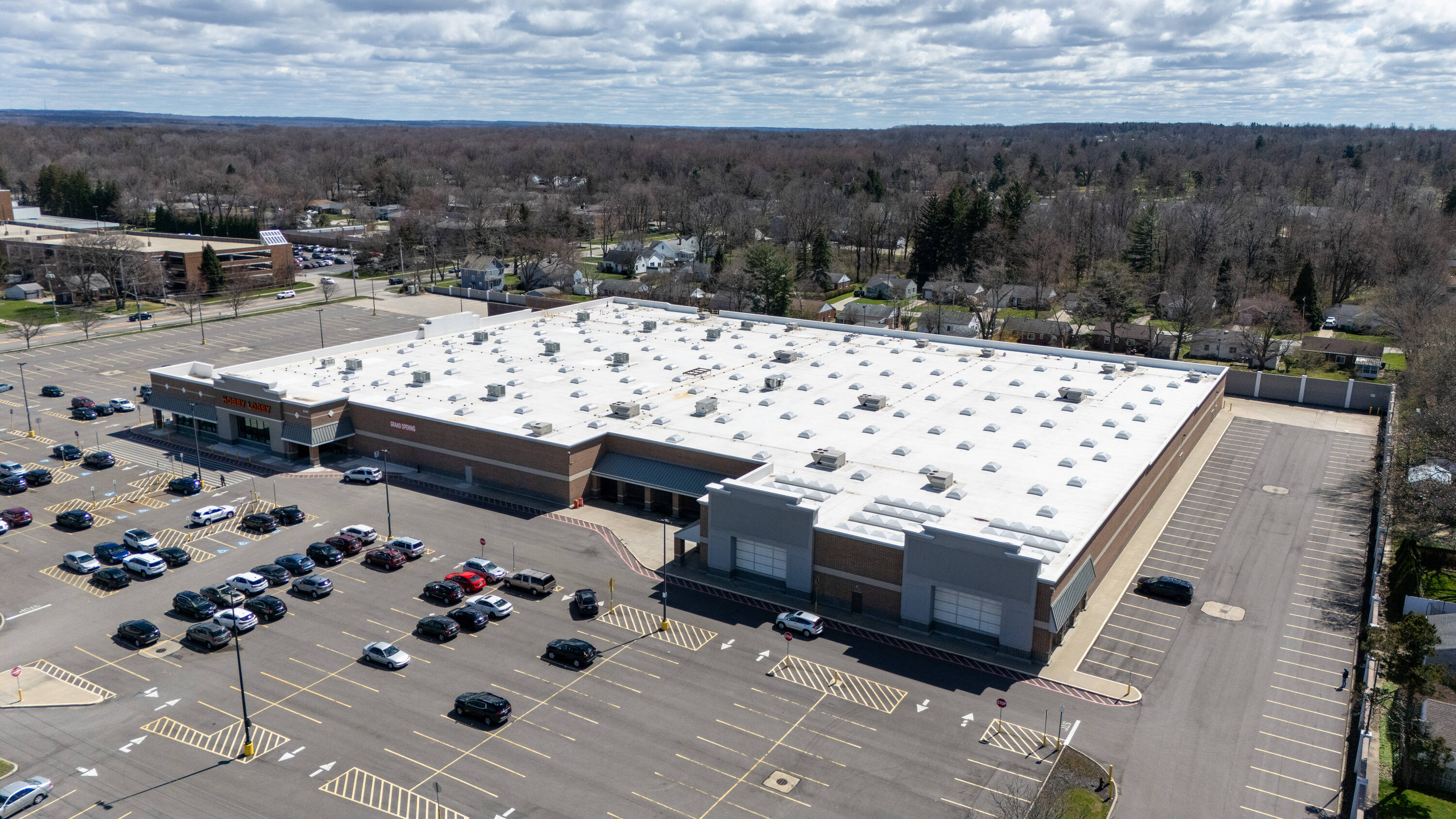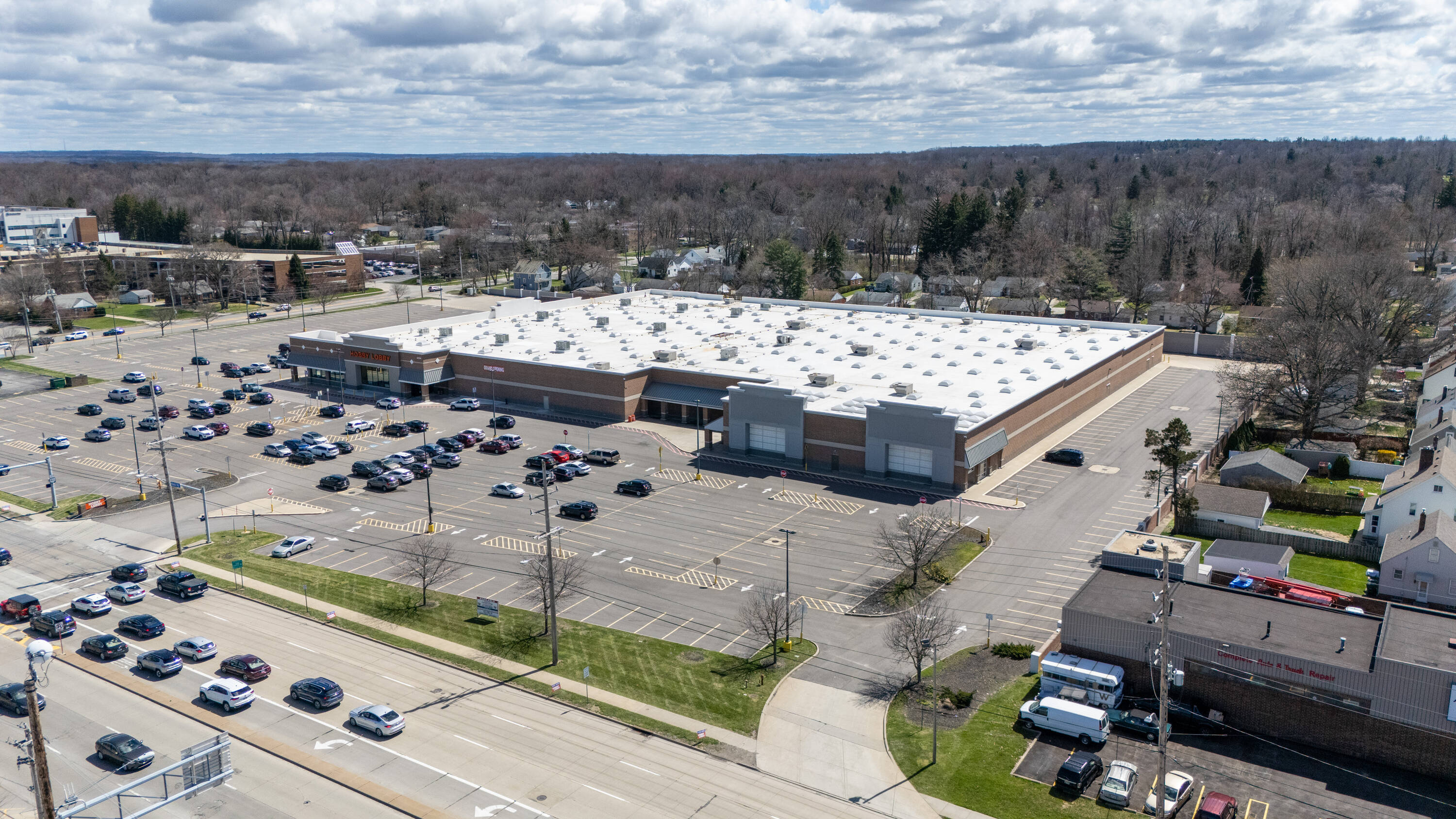 Retail space with new parking lot and roof near hospital.