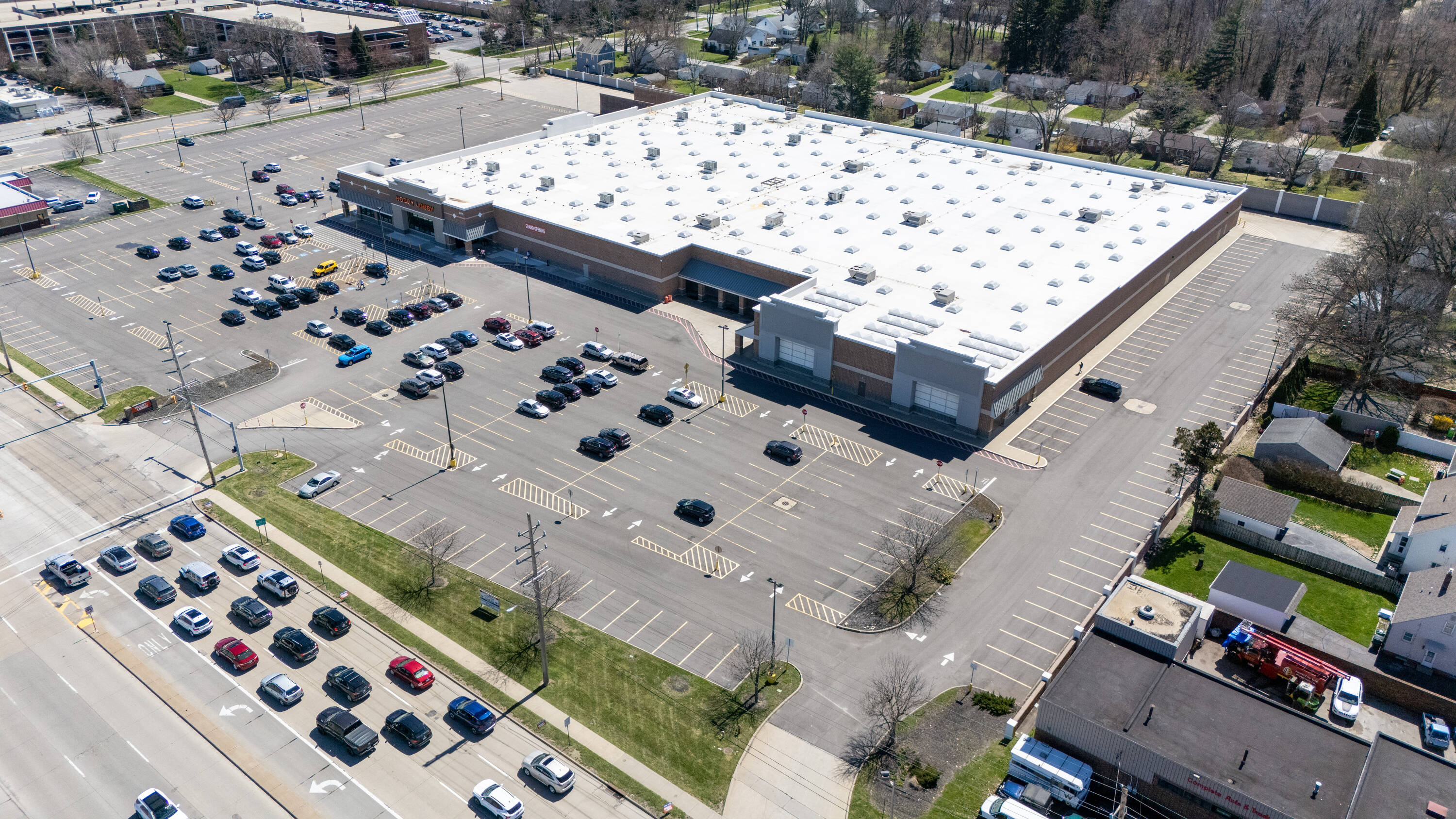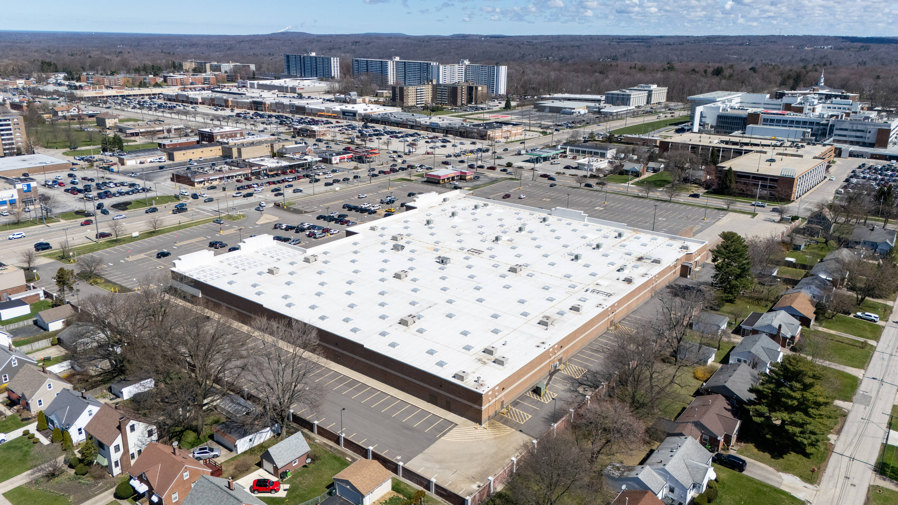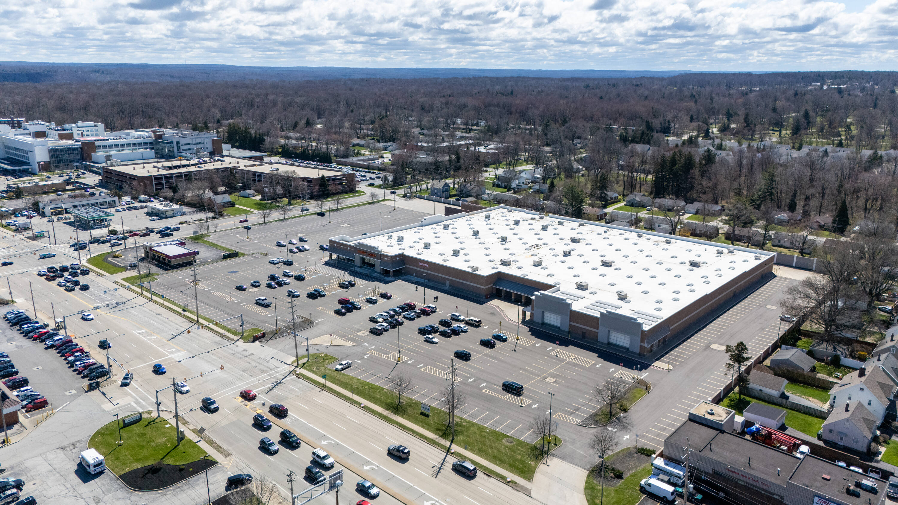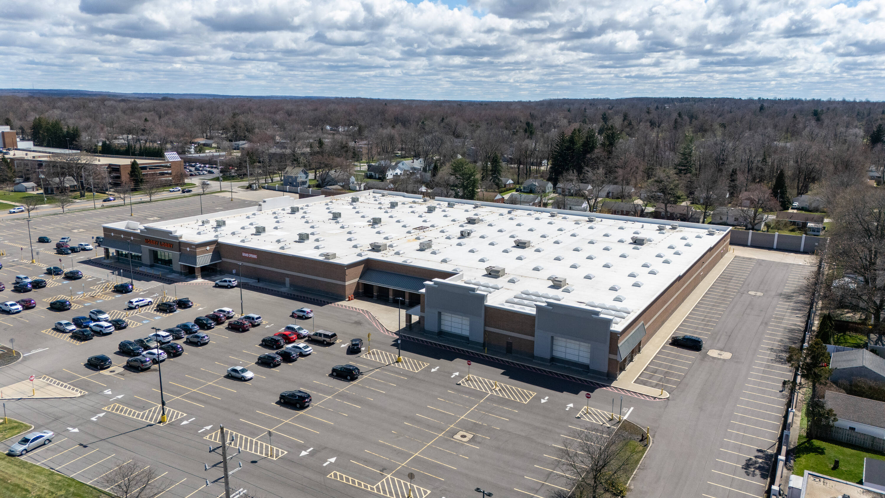 Retail space with new parking lot and roof near hospital.