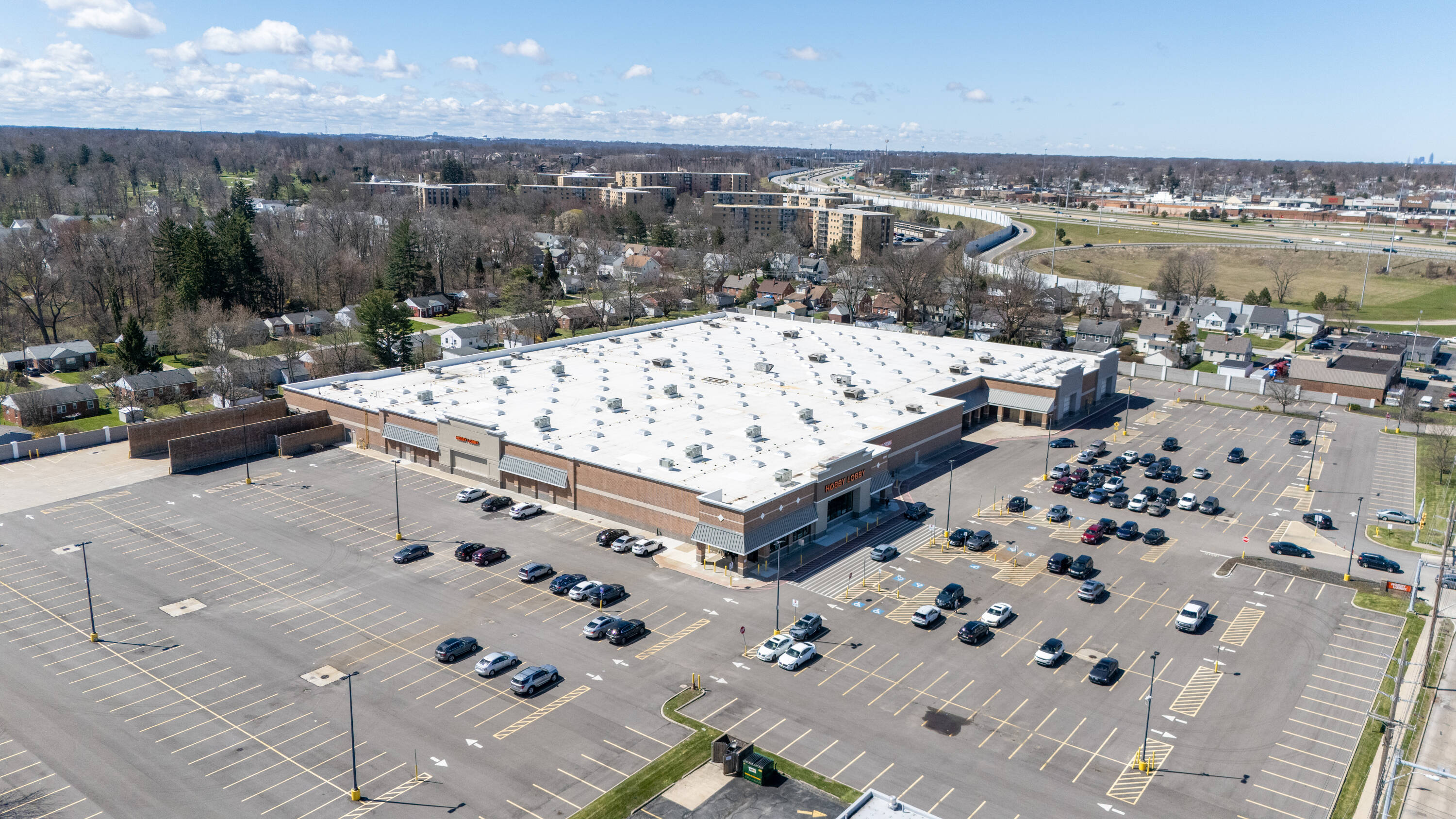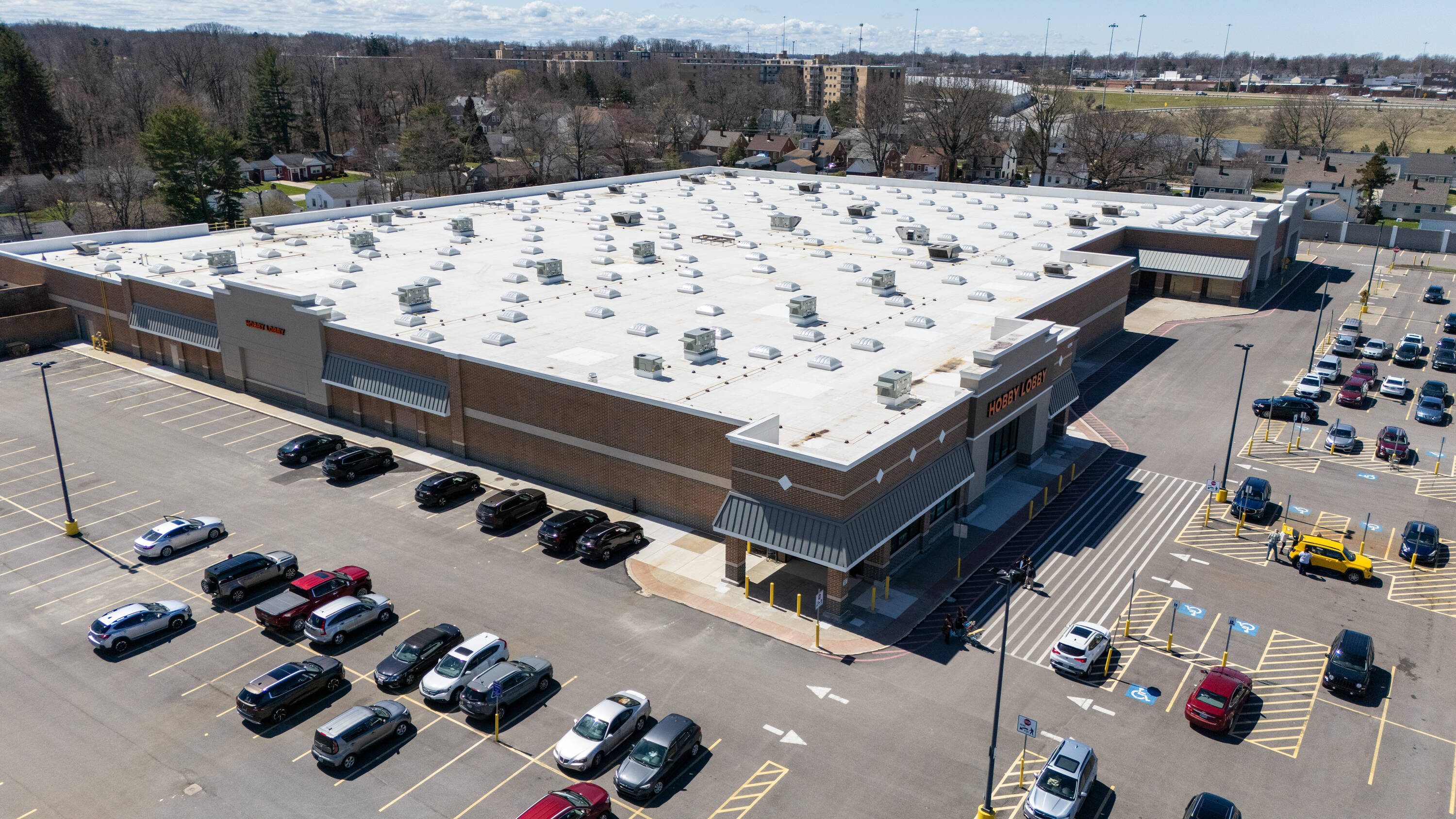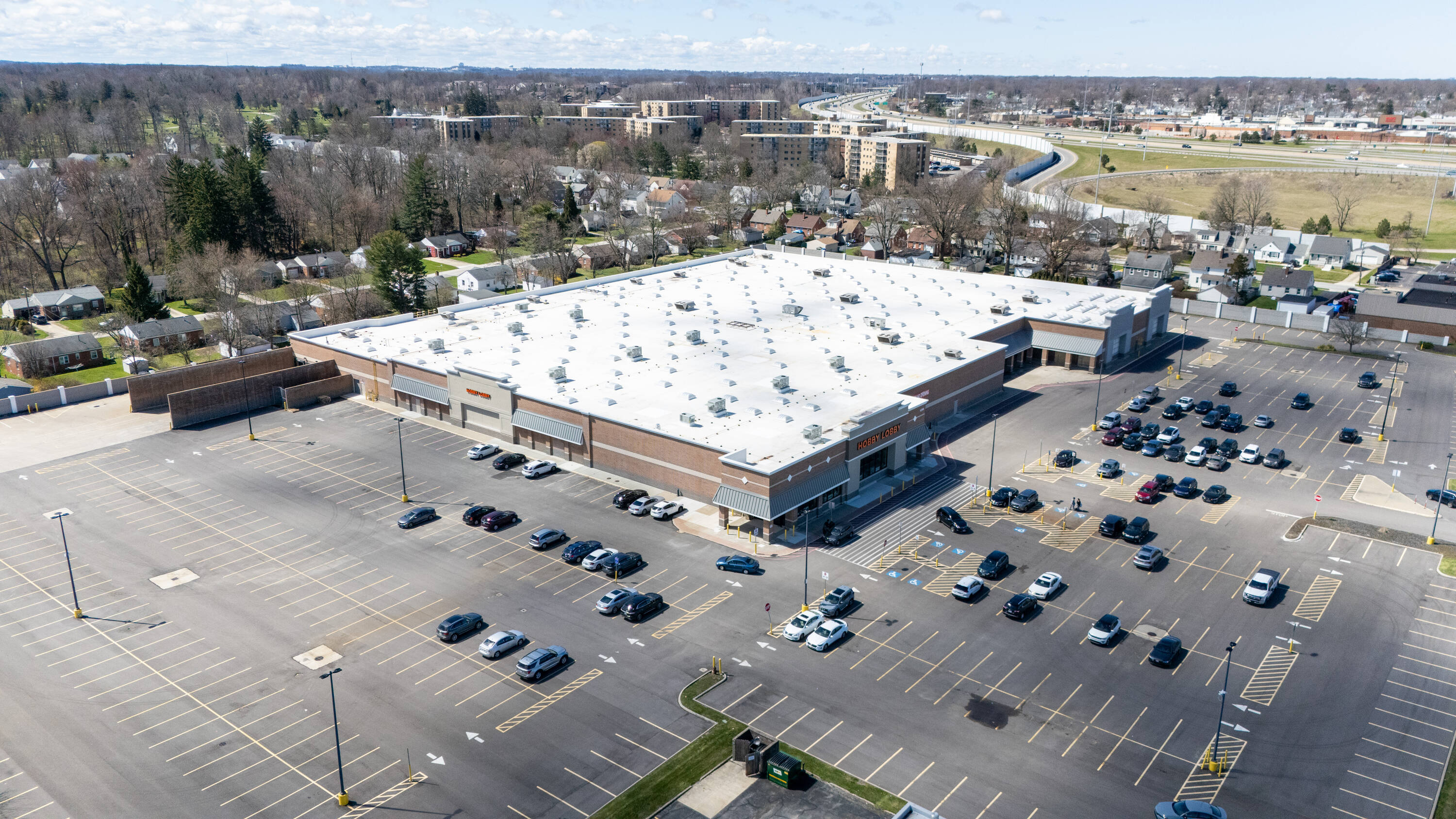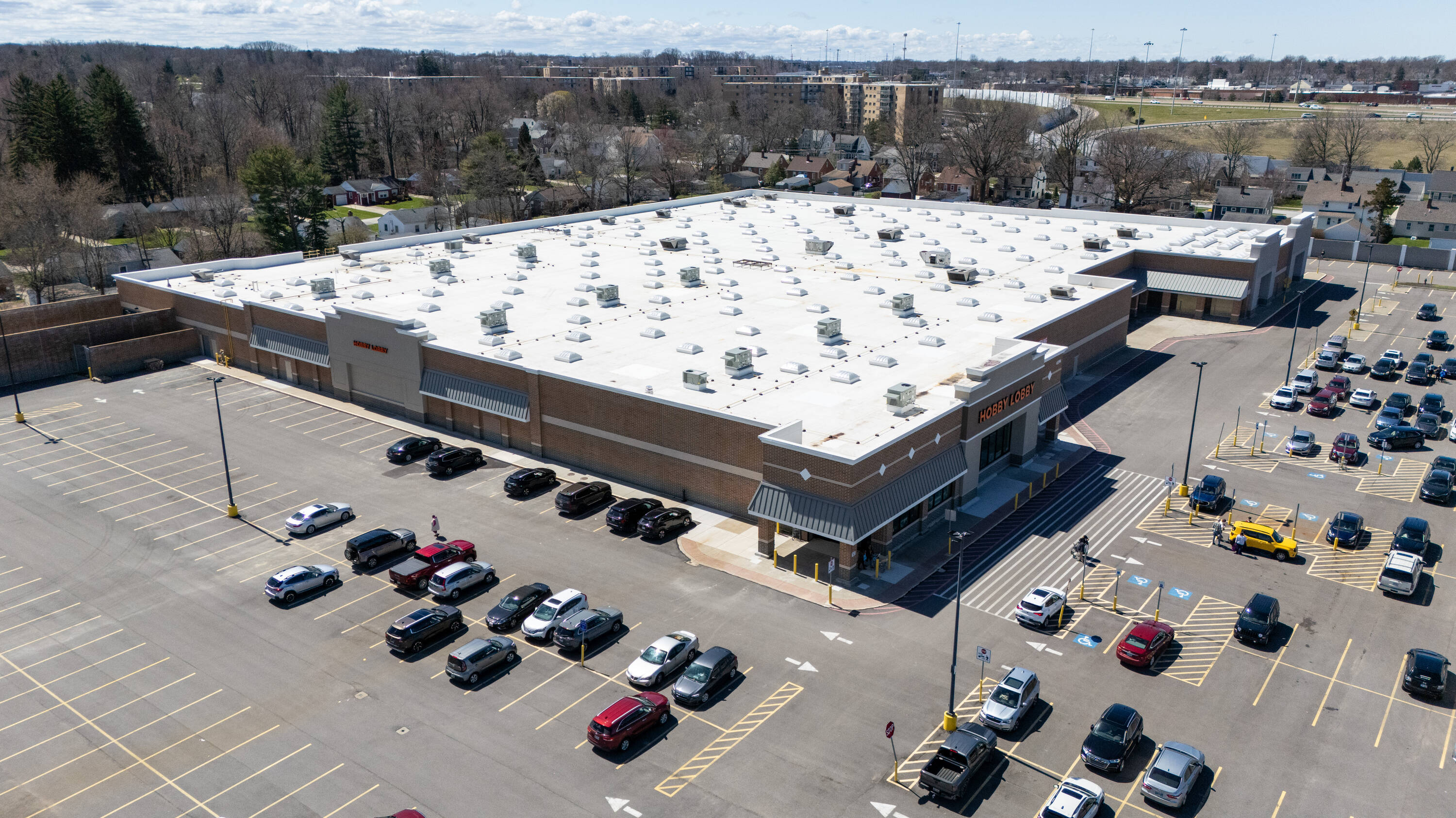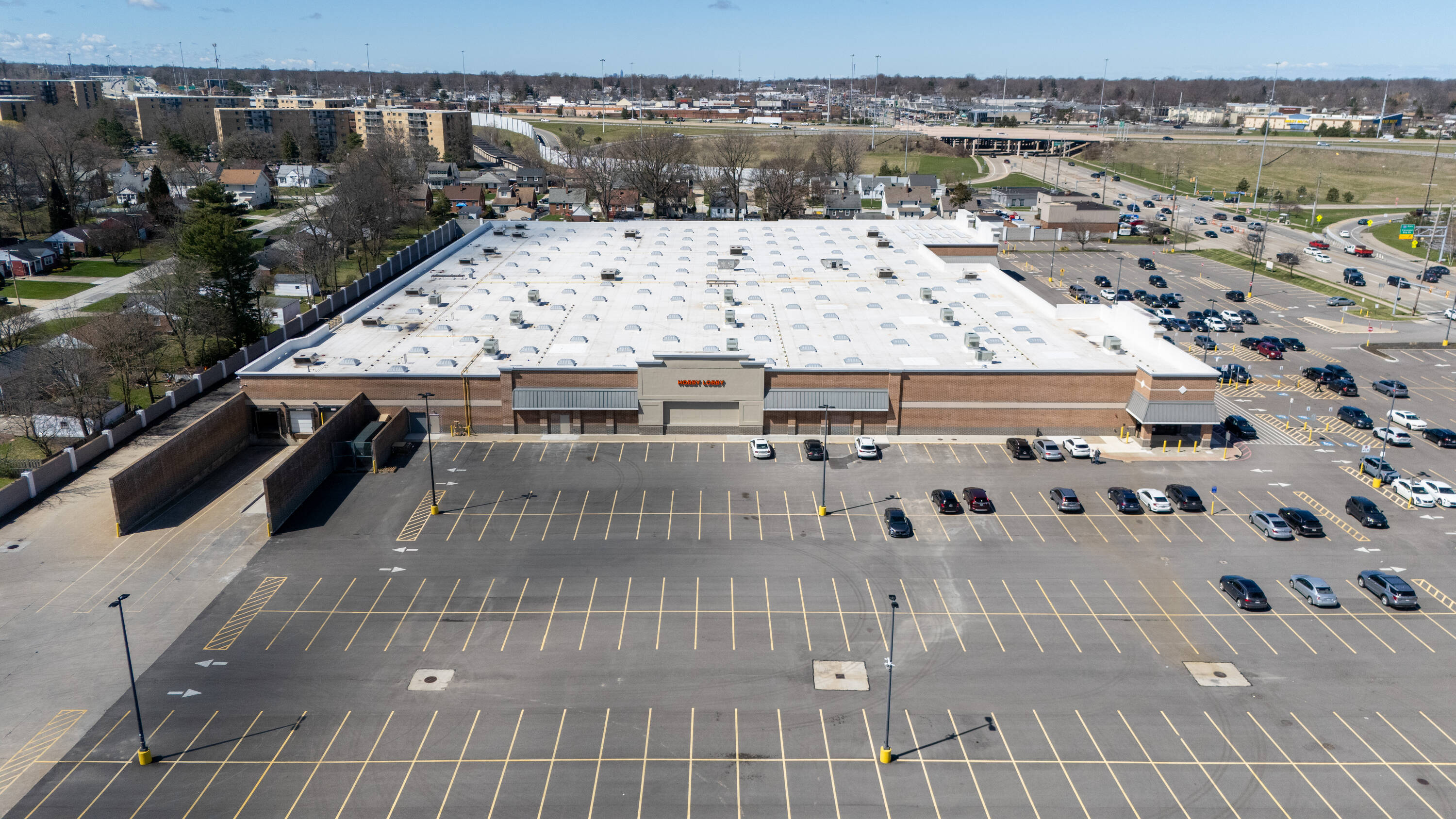 Retail space with new parking lot and roof near hospital.