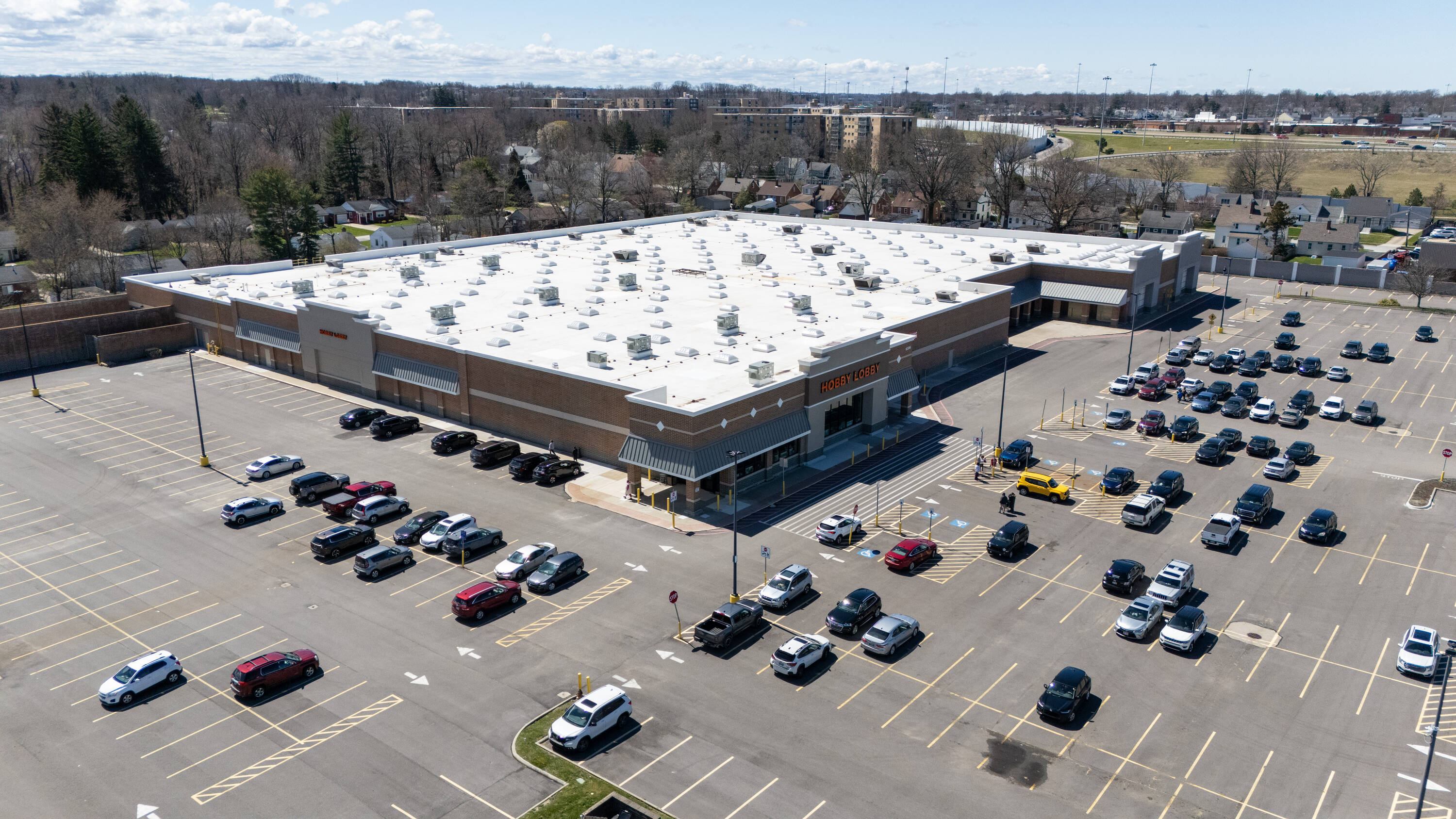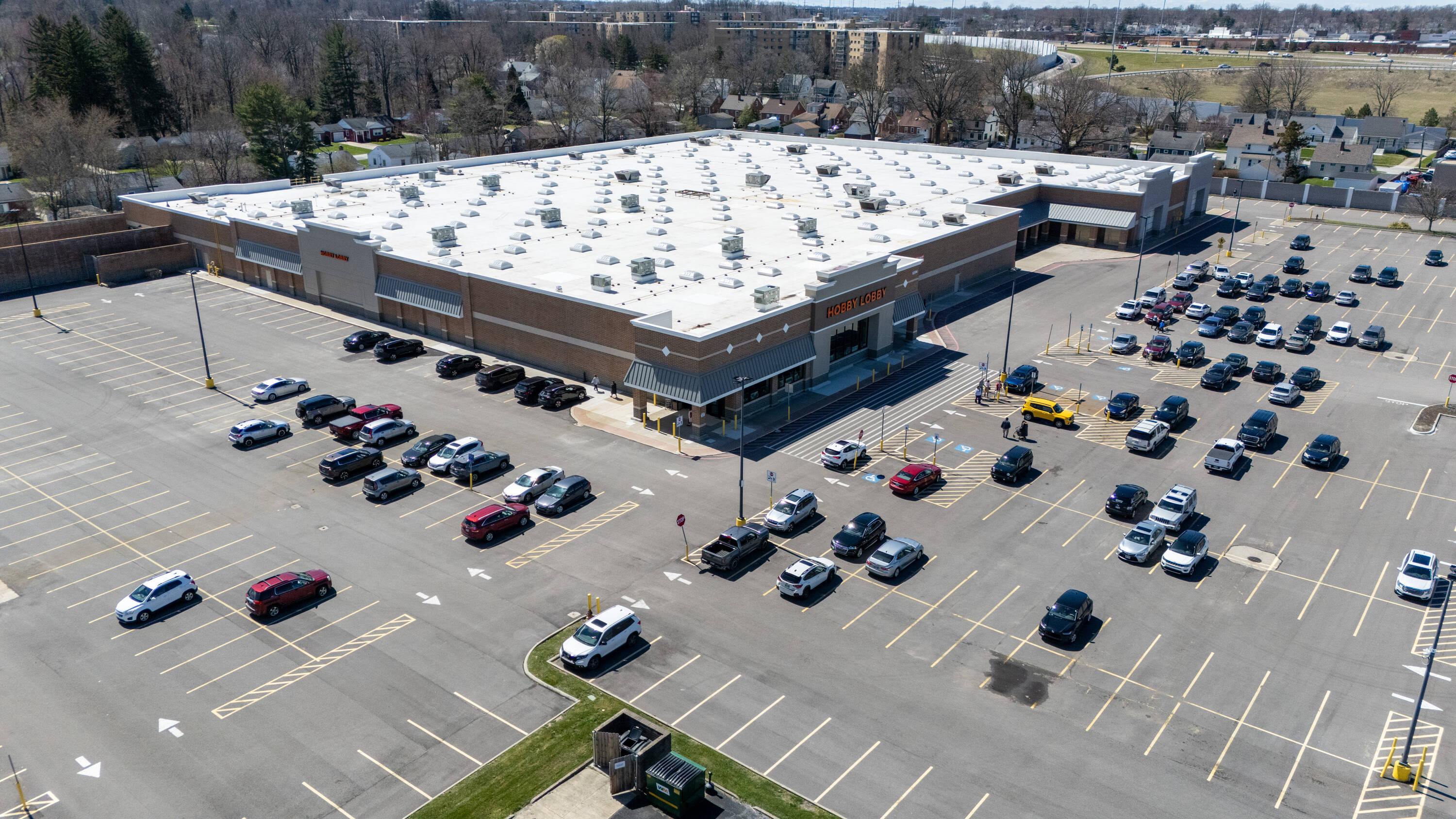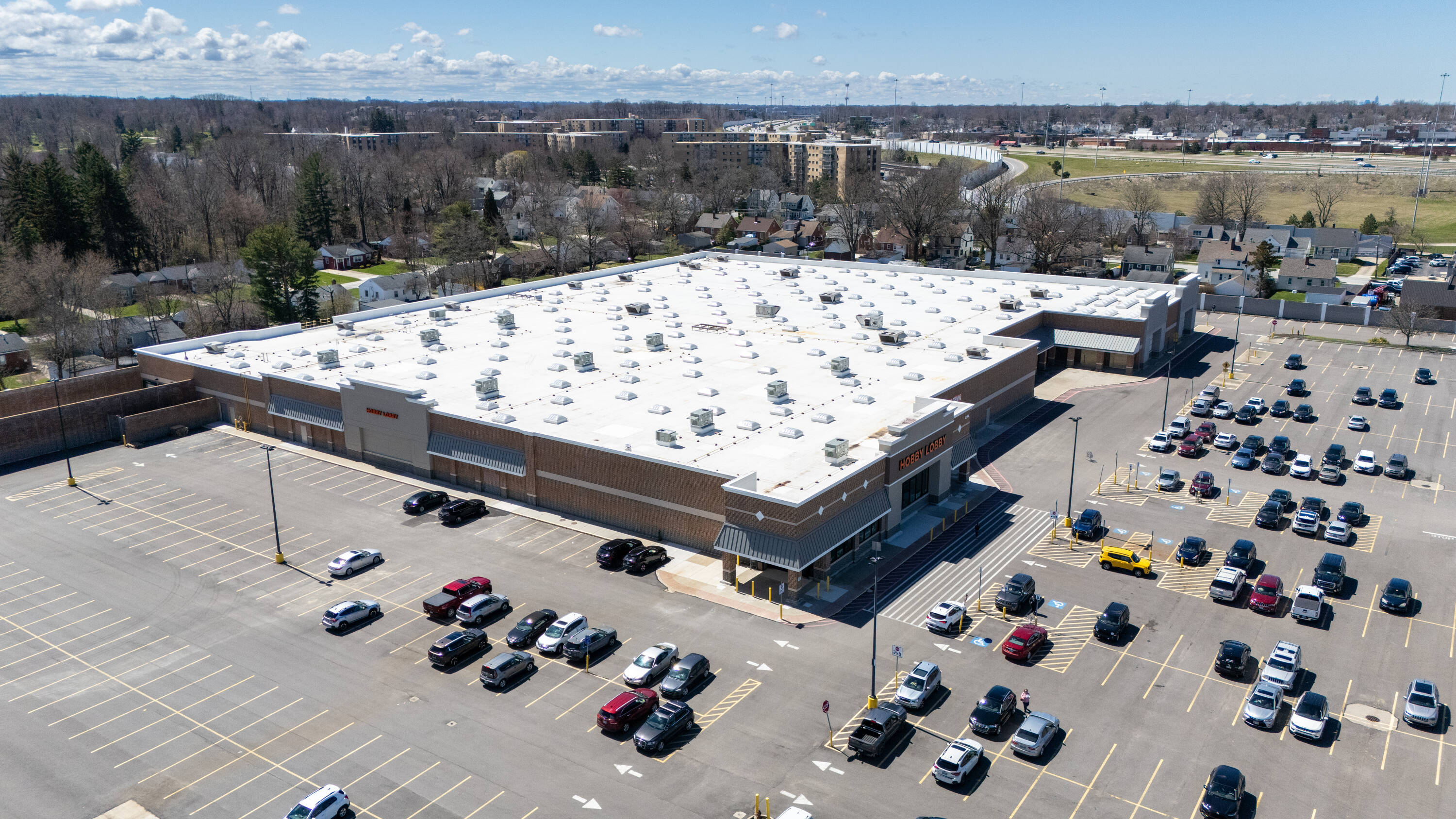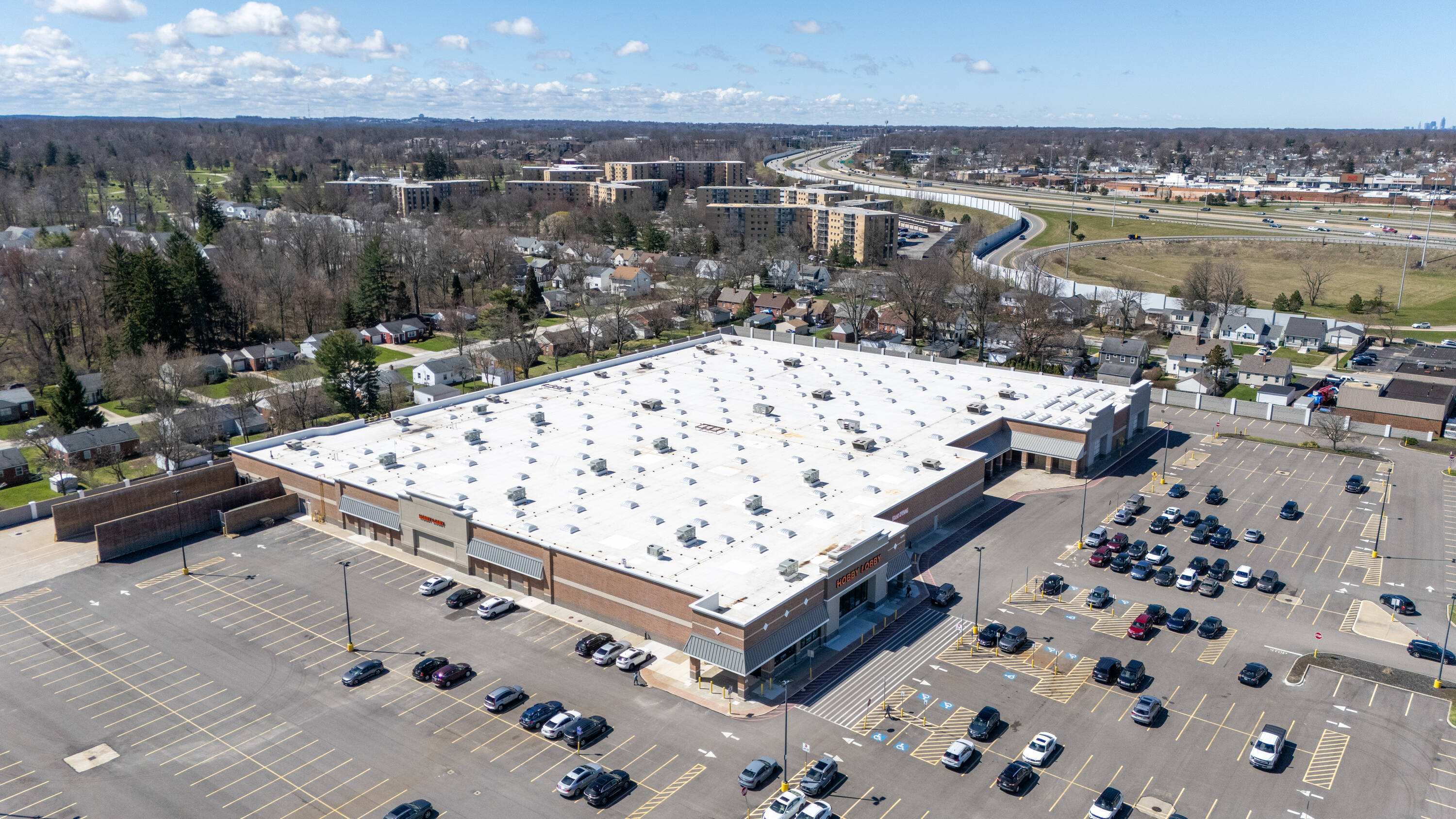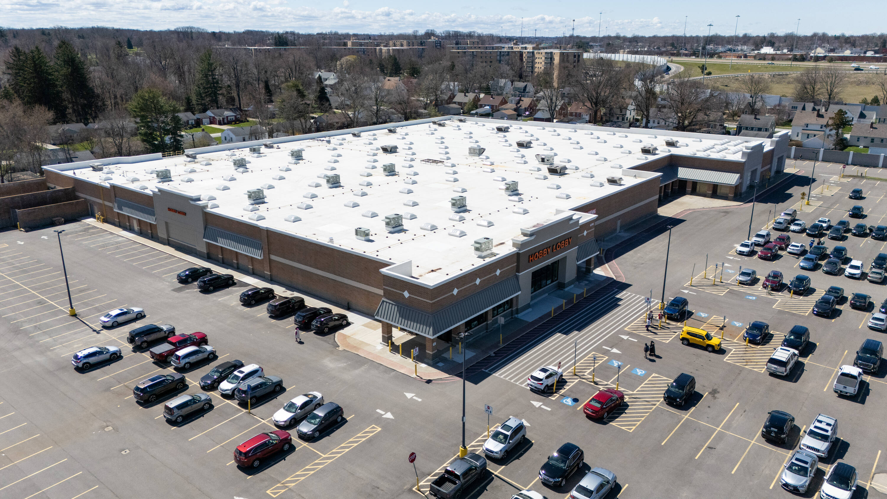 Retail space with new parking lot and roof near hospital.