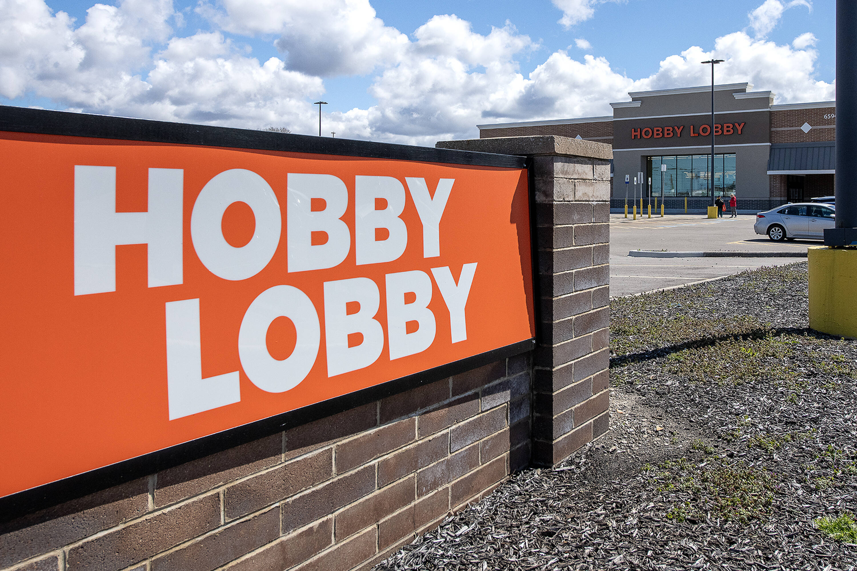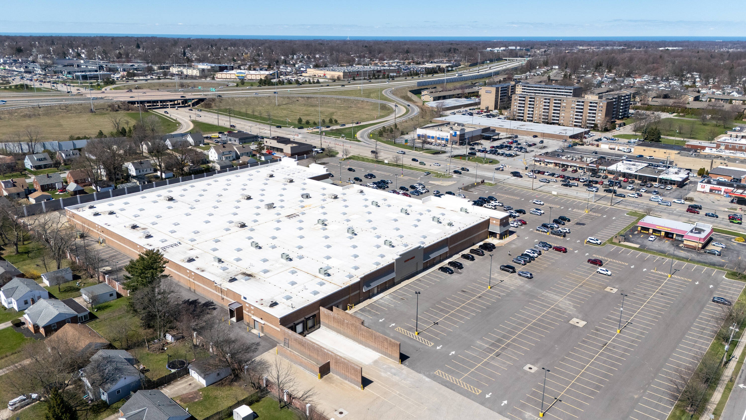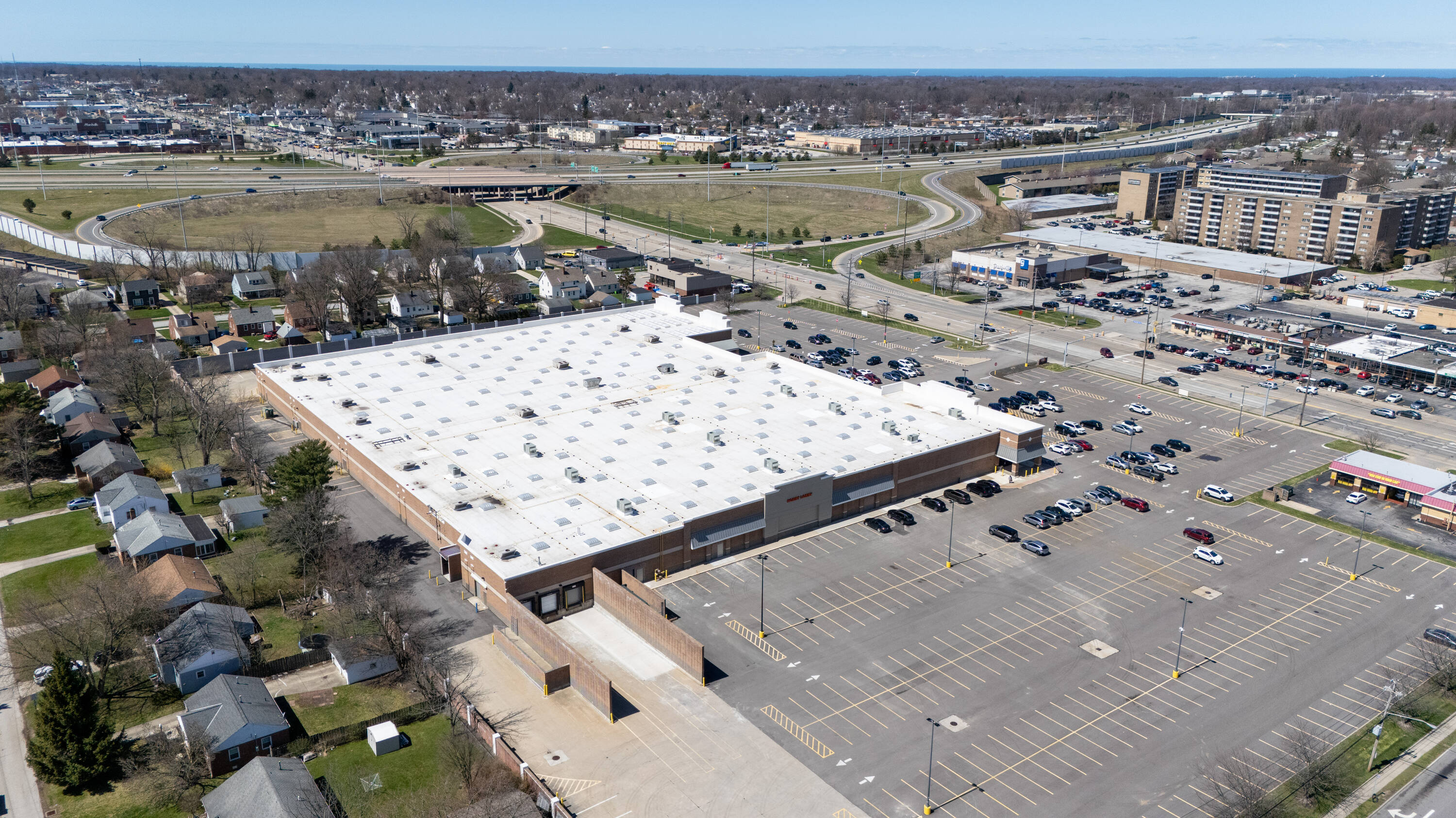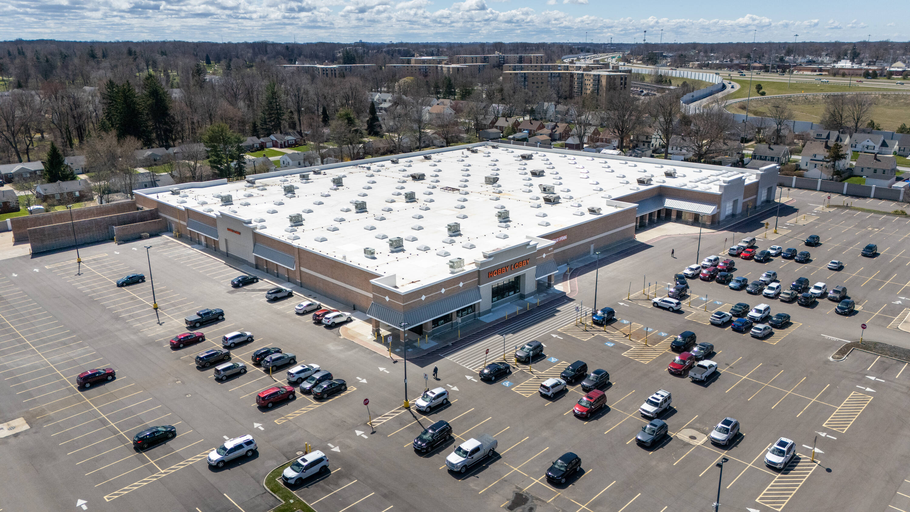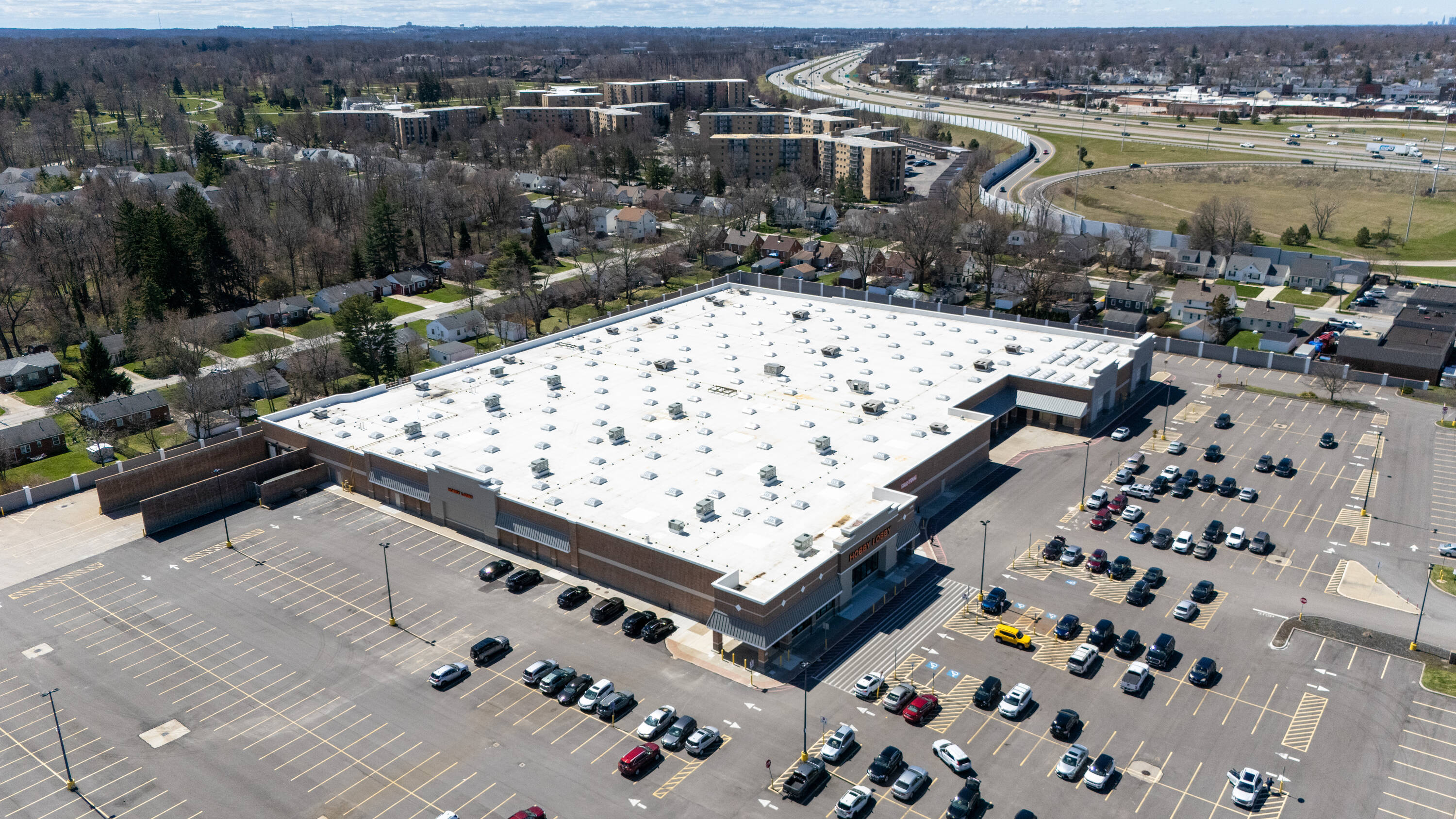 Retail space with new parking lot and roof near hospital.