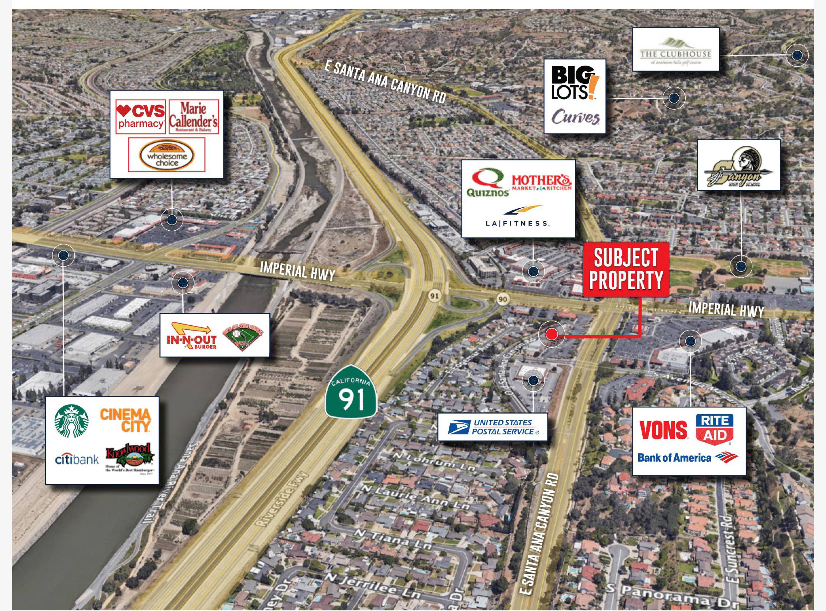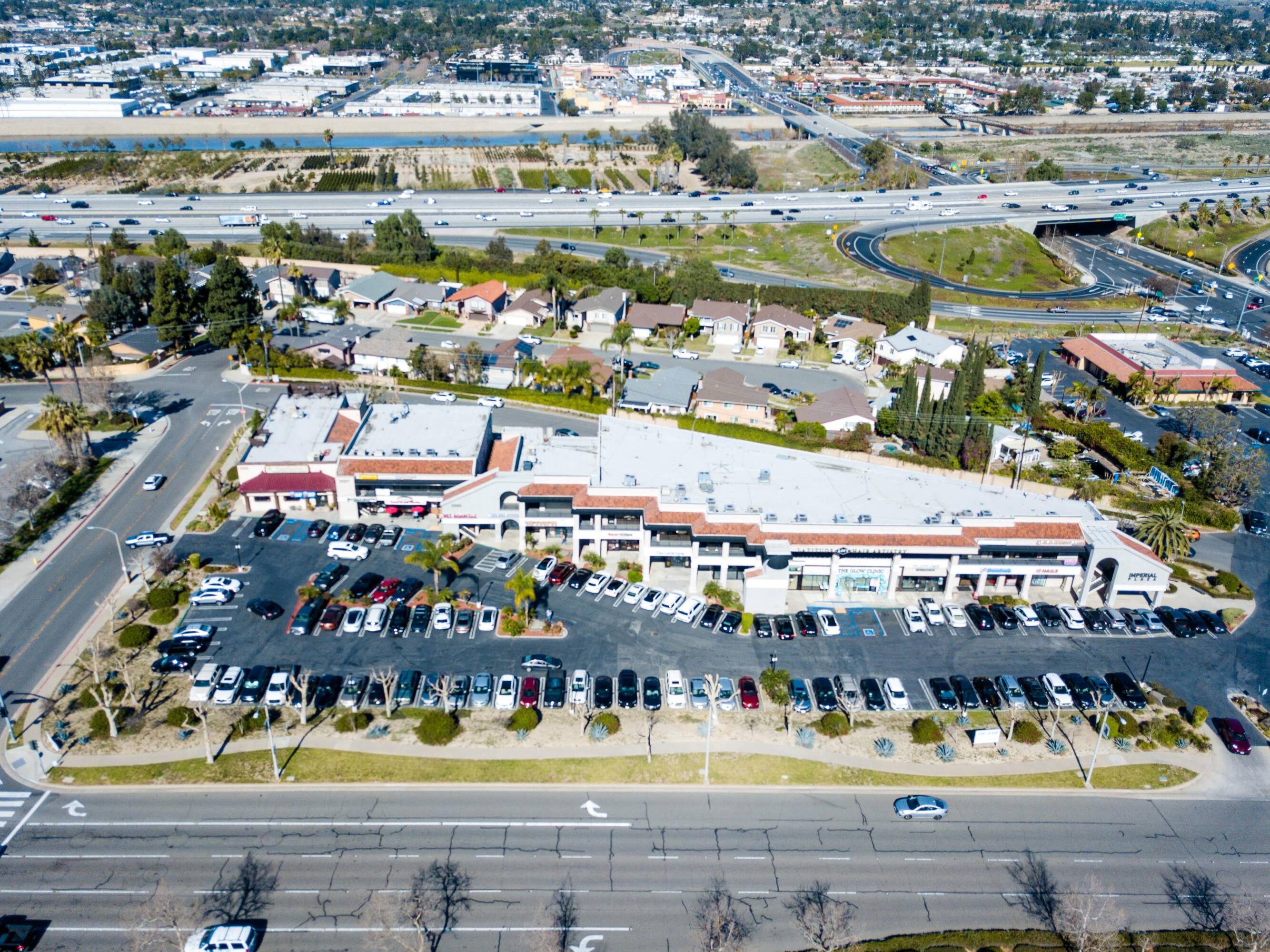 Retail shopping center near 91 Freeway and residential neighborhood.