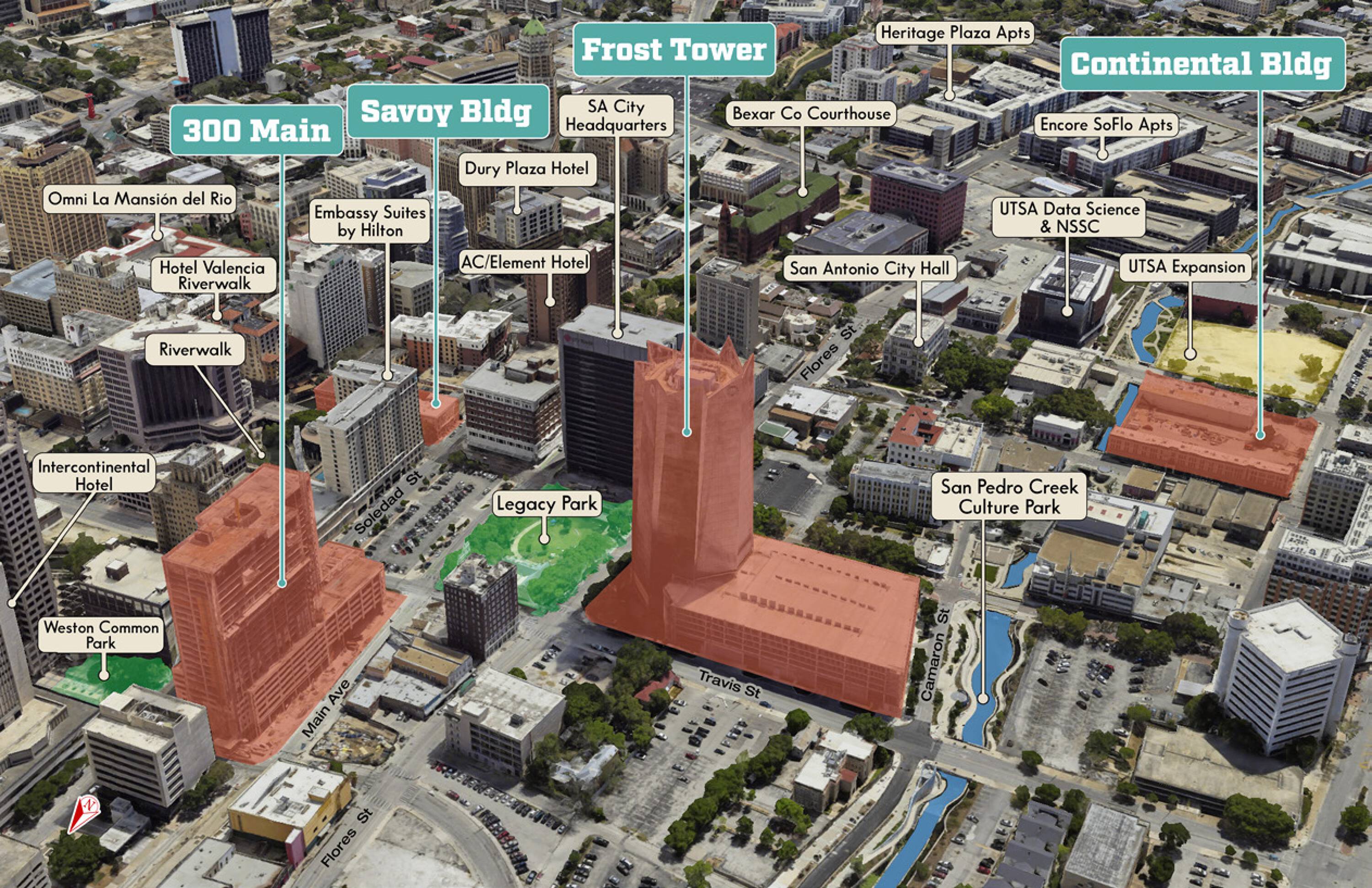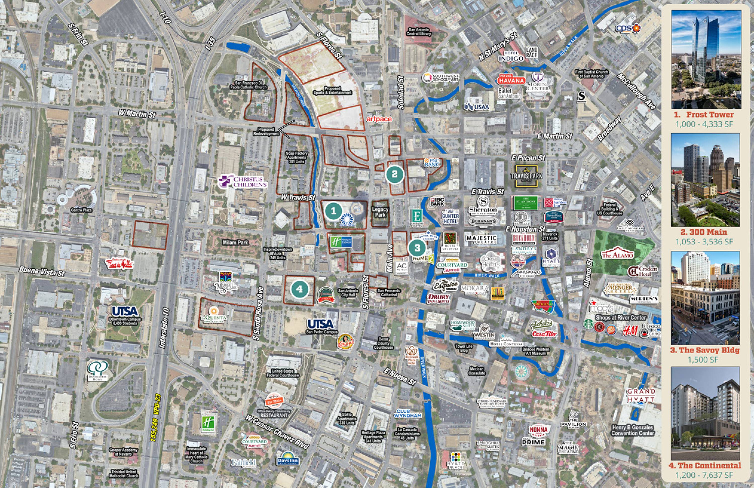 This property features: Prime downtown San Antonio location, at the epicenter of the city's live‑work‑play evolution.; Diverse retail opportunities across four distinct properties.; Iconic Frost Tower offers Class A++ office and retail spaces.