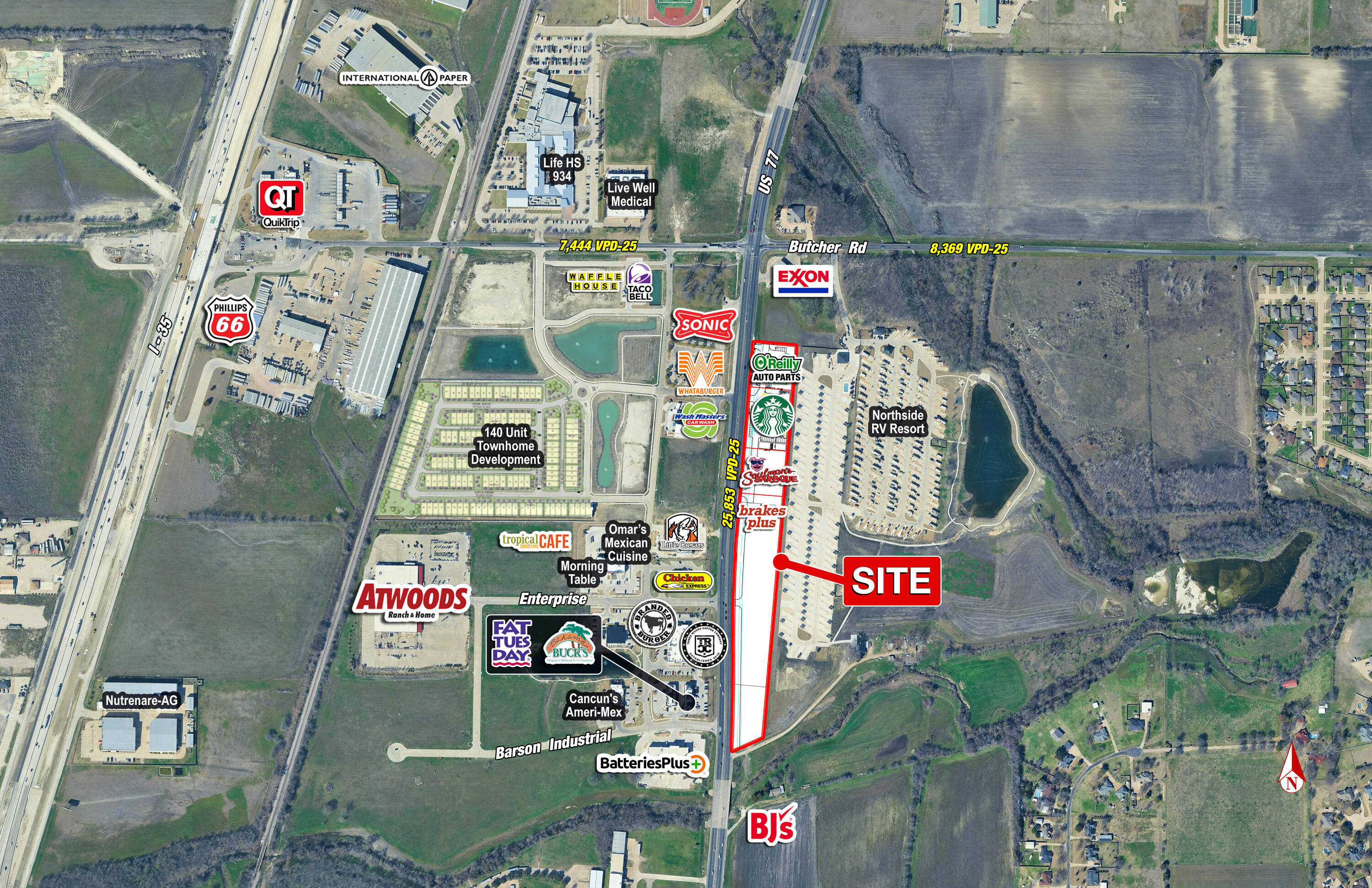Pad sites are available for sale or lease, situated at the southeast quadrant of Highway 77 and Butcher Road. The location benefits from high traffic counts and strategic positioning, providing convenient access to both I-35E and US Highway 287. A new retail strip is under construction, with an expected delivery in the third quarter of 2026. This multi-tenant opportunity offers exceptional visibility and accessibility from Highway 77. The location is positioned to benefit from the rapidly growing population, as well as ongoing retail and restaurant development along the main corridor of Waxahachie.