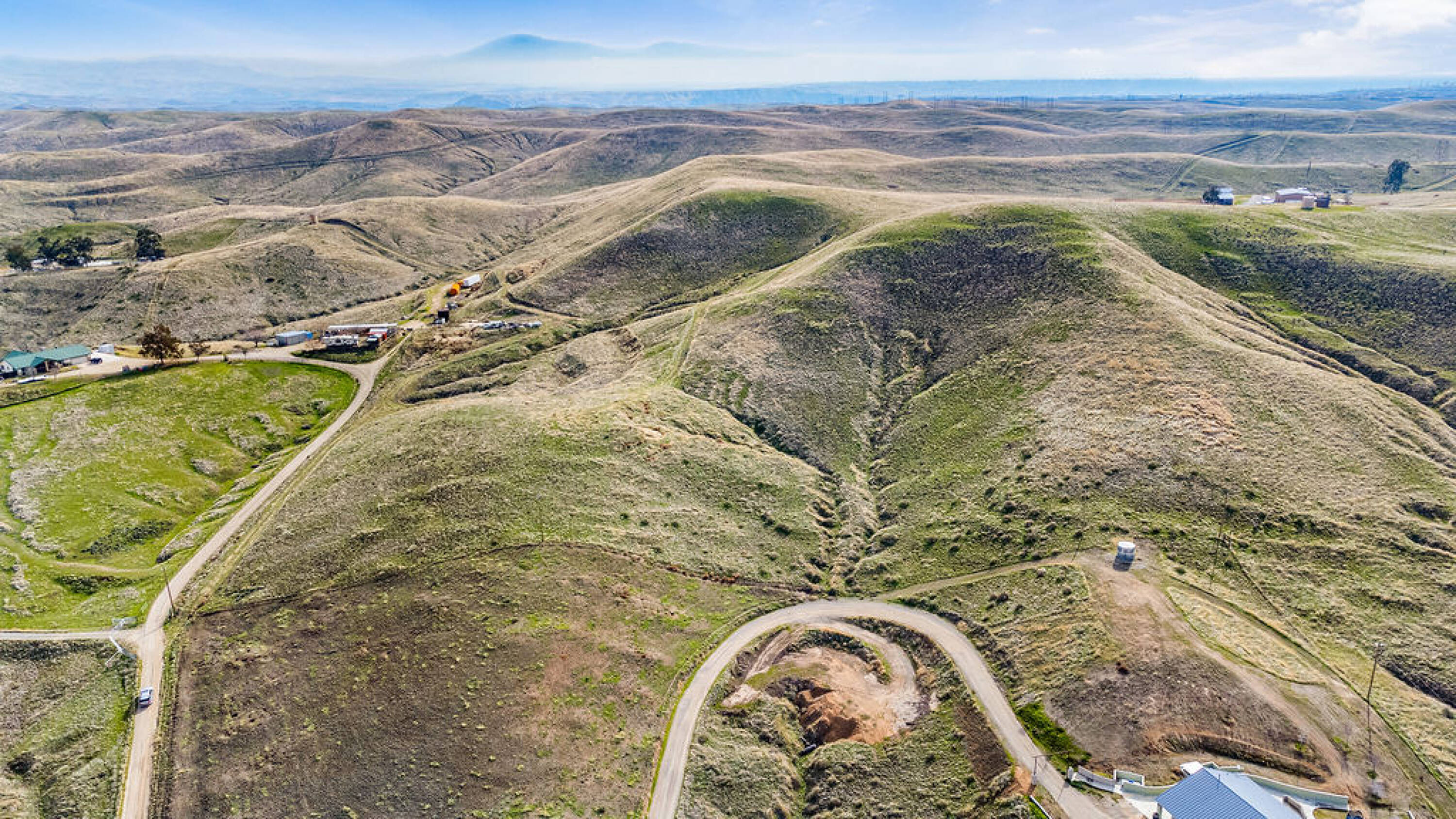Land featuring multiple building sites, roads, and fencing.