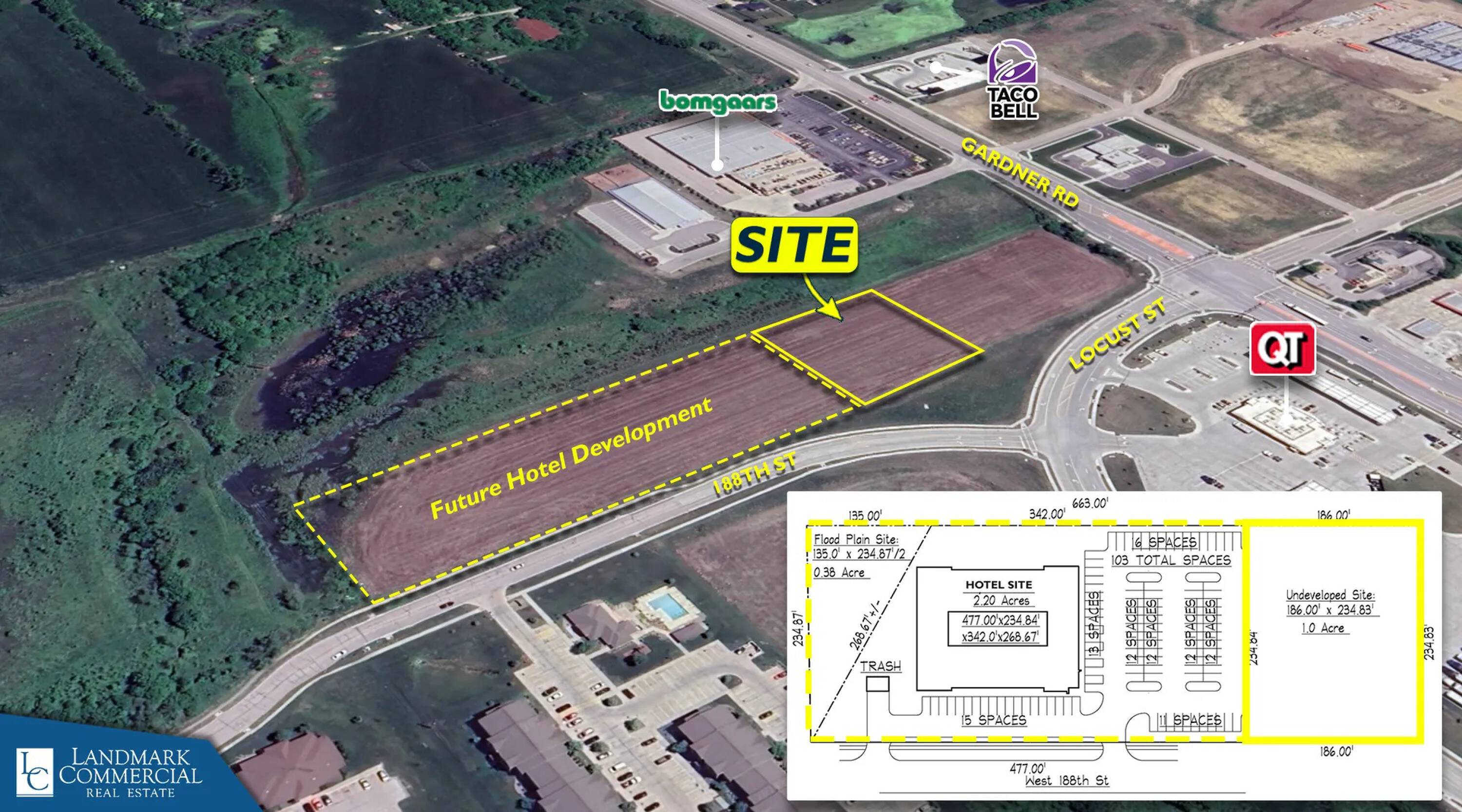 Available commercial land, ranging from 0.5 to 1.1 acres, is offered for sale, build-to-suit, or ground lease. The zoning is commercial. The location provides access near Kellogg Interstate 35 and is one mile from Gardner Municipal Airport. Traffic counts show 10,487 vehicles per day in Gardner and 39,500 vehicles per day on Interstate 35. Gardner is experiencing significant growth, with a 60% growth rate since 2000, making it one of the top growing cities in Kansas. Development plans include a future hotel/extended stay (Stay Apt Suites) and factories for Panasonic and EV Battery, which will employ 4,000 people. Off-site shared detention will be provided. A curb cut is located off 188th St., and an access road will be built across from Quik Trip.