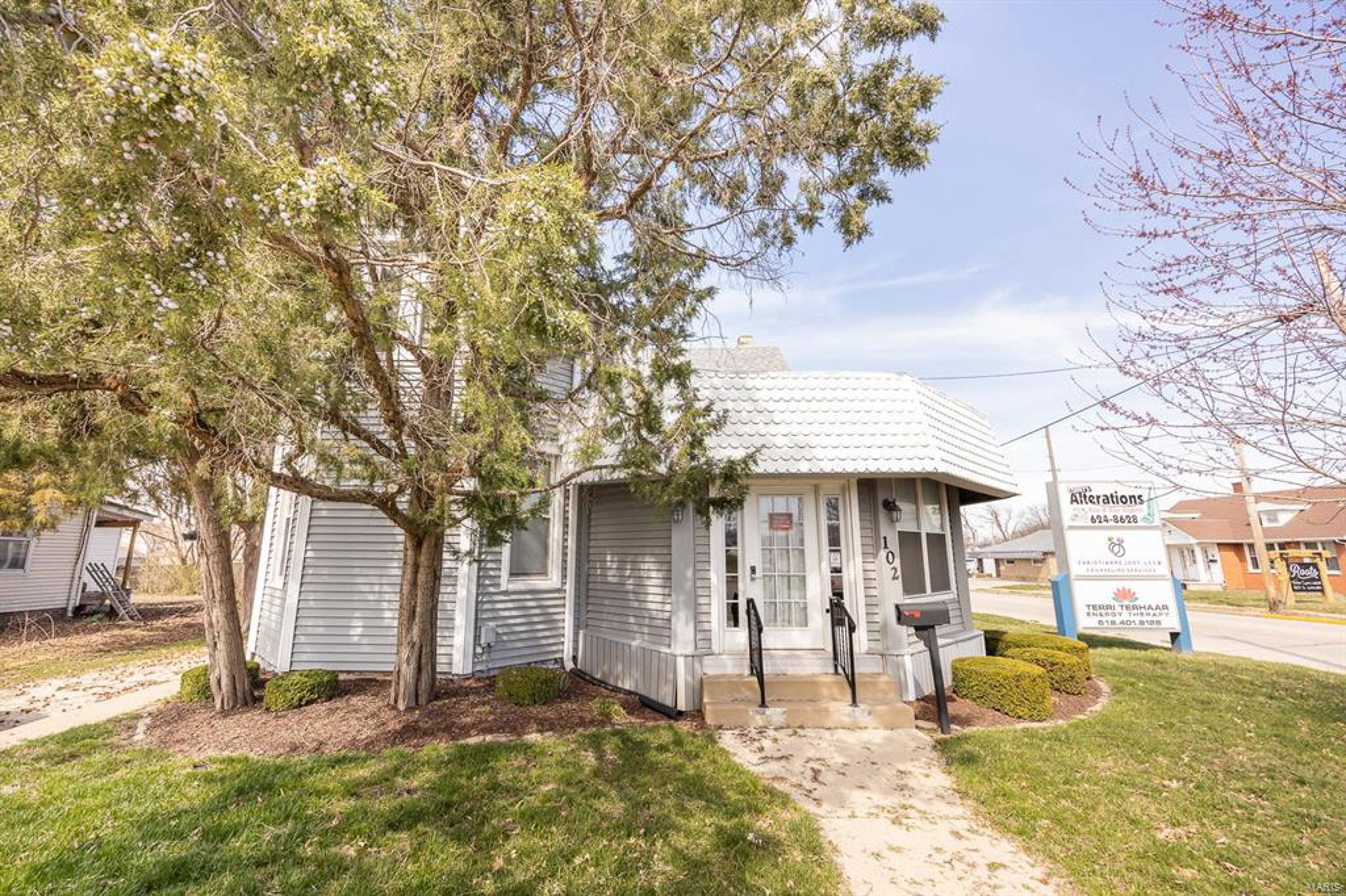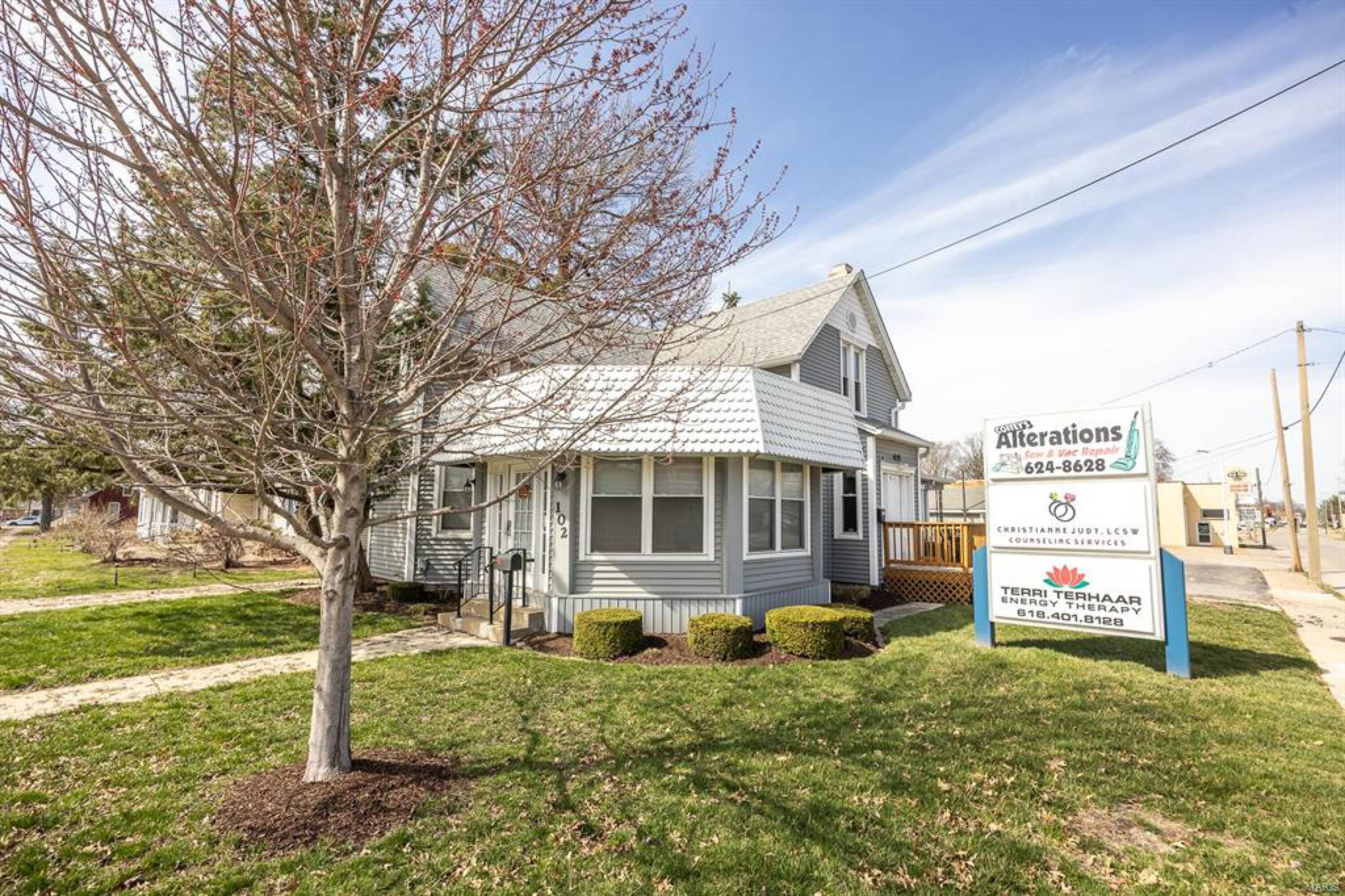Located on a prime corner lot on South Lincoln in O'Fallon, Illinois, this mixed-use property offers high-traffic exposure. It comprises two buildings presenting multiple income-generating opportunities. The main building, addressed as 633-635 S Lincoln Ave, features two ground-floor commercial spaces. One space is occupied by a seamstress business, generating $700 per month. The other, larger space is leased to a mental health professional for $1,000 per month, plus $200 for utilities, with a graduated increase of $100 per month for each of the next two years. The second floor of the main building, accessible via a separate entrance at 102 W. 7th, was formerly a residential apartment and offers additional value-add potential if renovated and brought up to code. Across the paved parking lot, the second building, addressed as 625 S Lincoln Ave, houses a hair salon generating $585 per month. The property size is 3036 square feet.