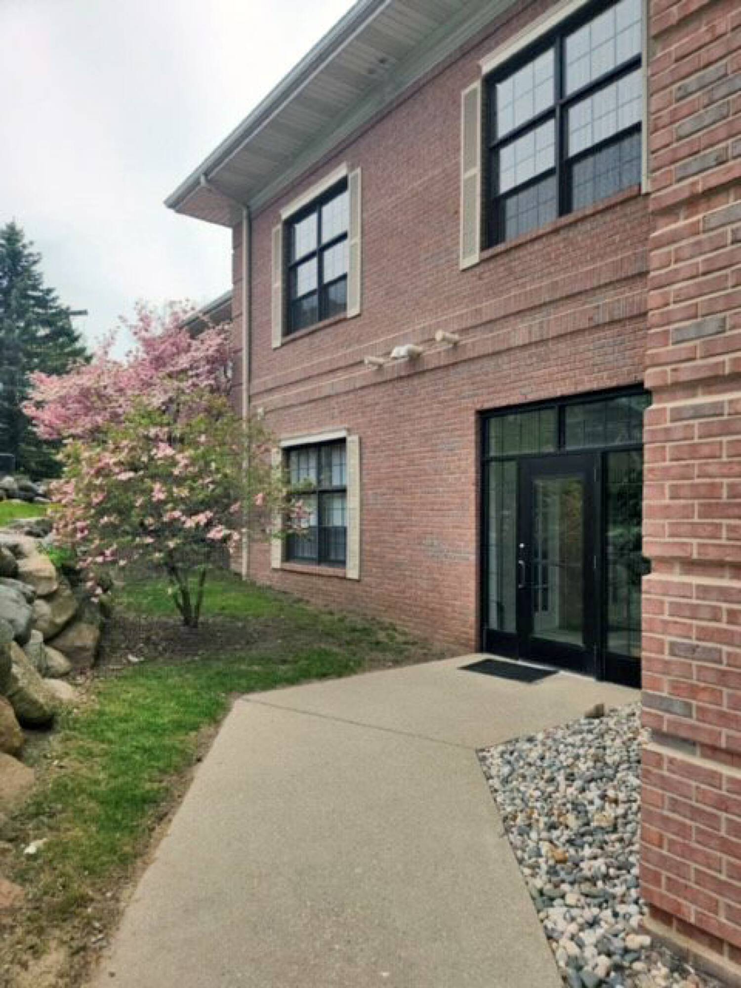 This office suite features a dedicated side entrance and ample parking. The modern building is well maintained. Inside the suite, there is a kitchenette and a fireplace.