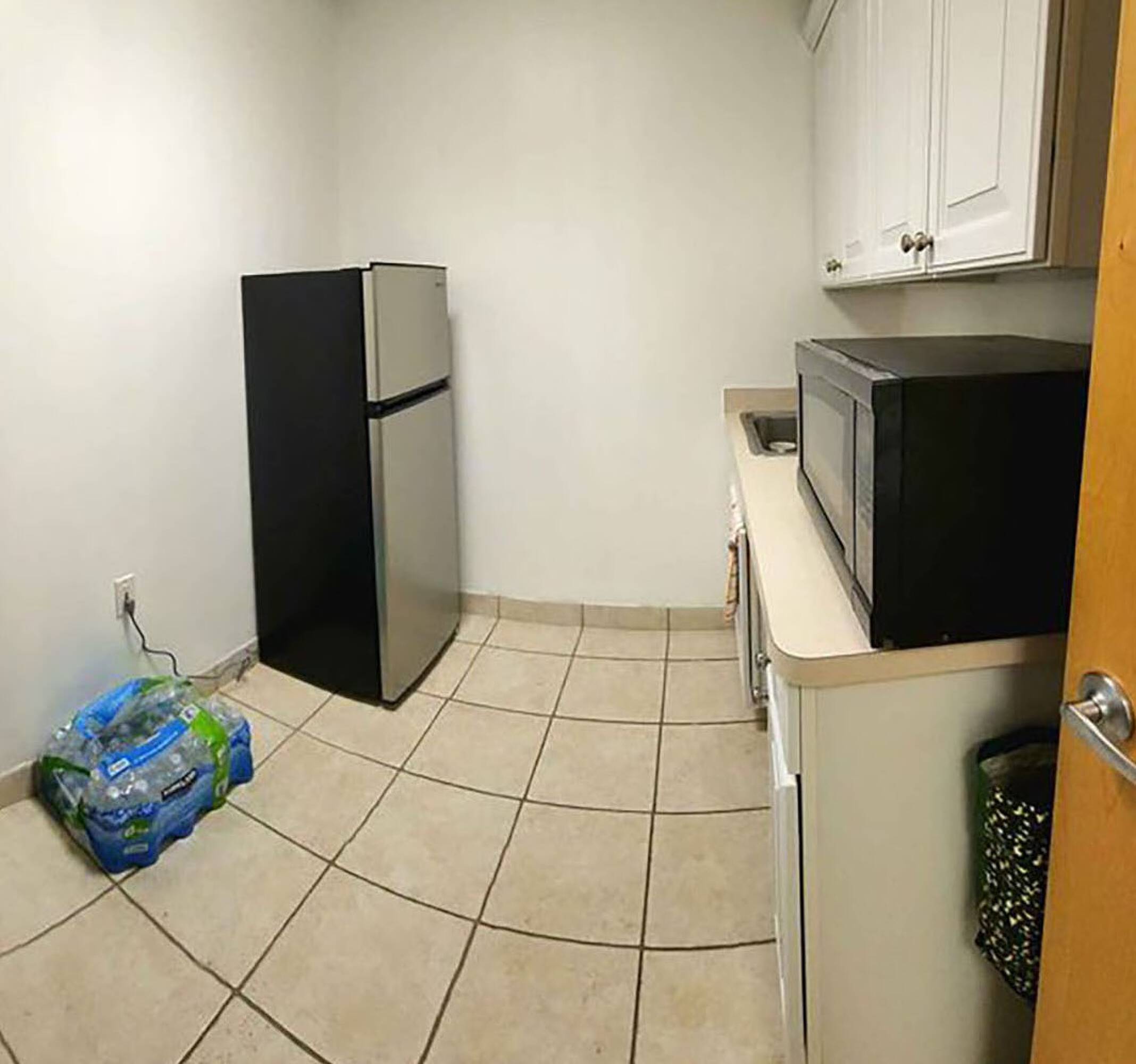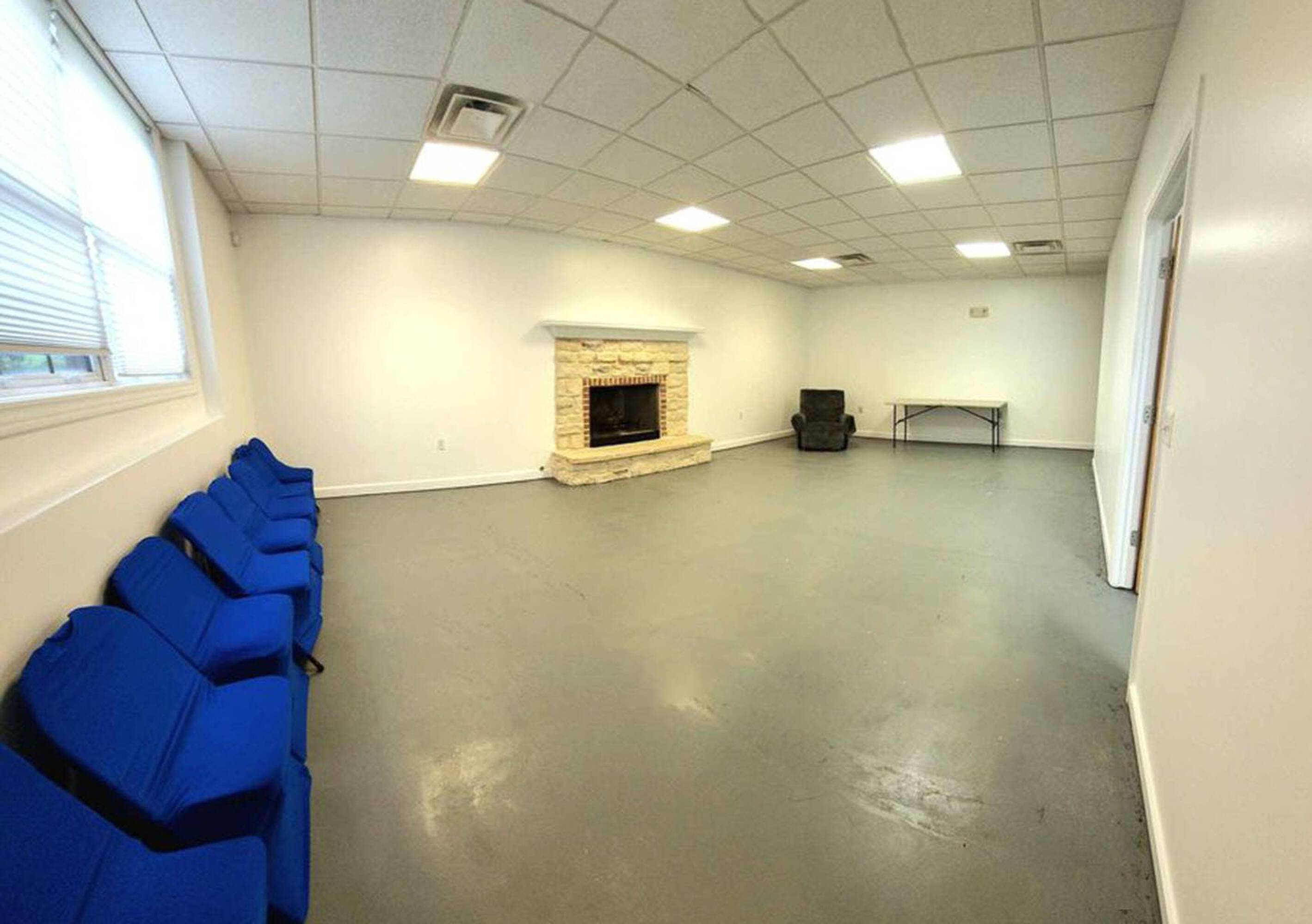 Modern office suite featuring a kitchenette, fireplace, and ample parking.