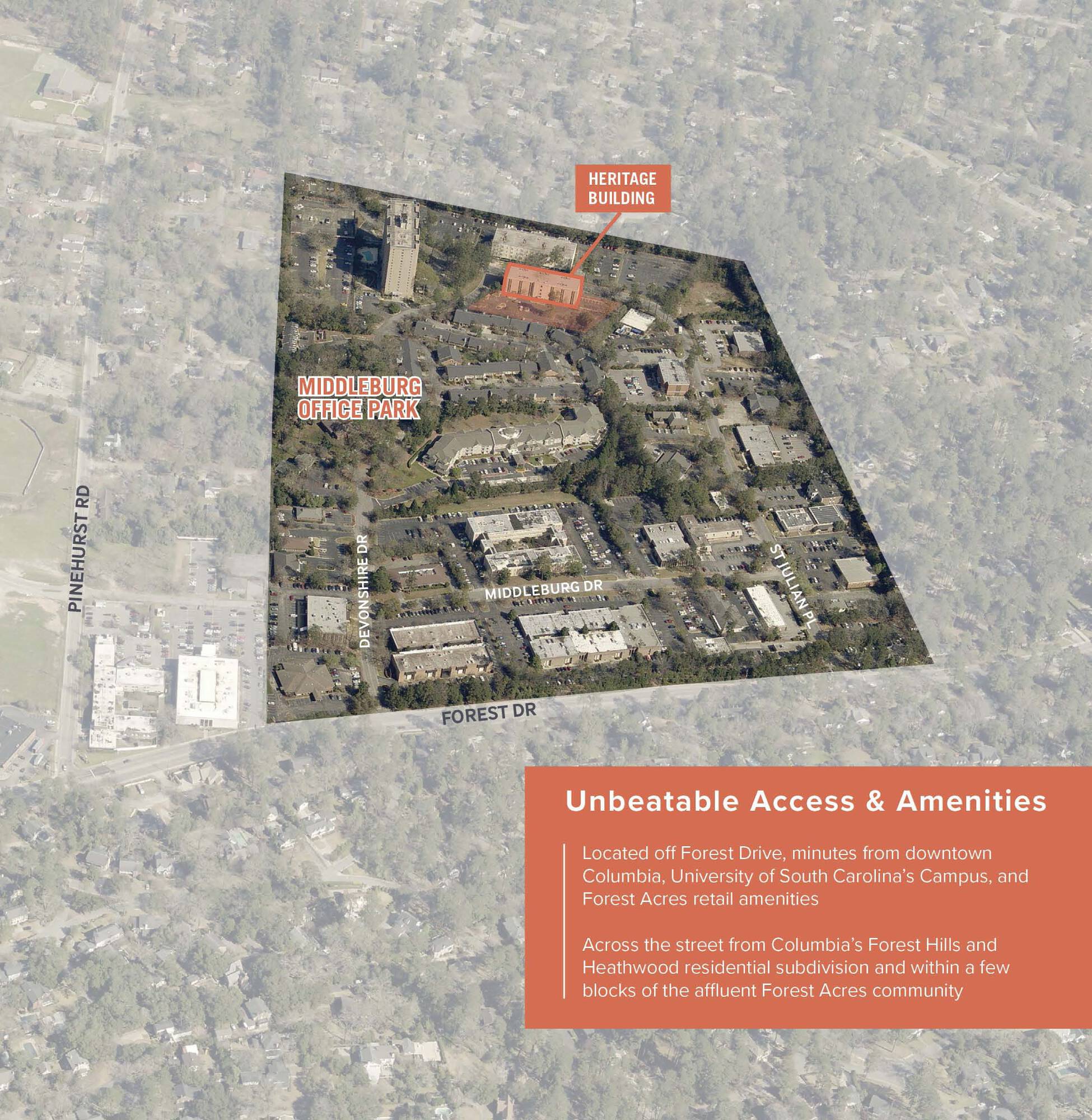 Located in Middleburg Office Park, 1777 St. Julian Place offers 10,000 square feet of newly renovated medical office space. Situated on 1.86 acres within the approximately 65-acre Middleburg Business Park, the property is surrounded by medical buildings, general office buildings, and residential properties. The building is undergoing renovations by a private medical practice that will occupy floors one, three, and four. The second floor is available for lease and will be delivered in shell condition, with a market upfit allowance commensurate with the lease term. The property is zoned C-1 in the city of Columbia and is located between downtown Columbia and Forest Acres.