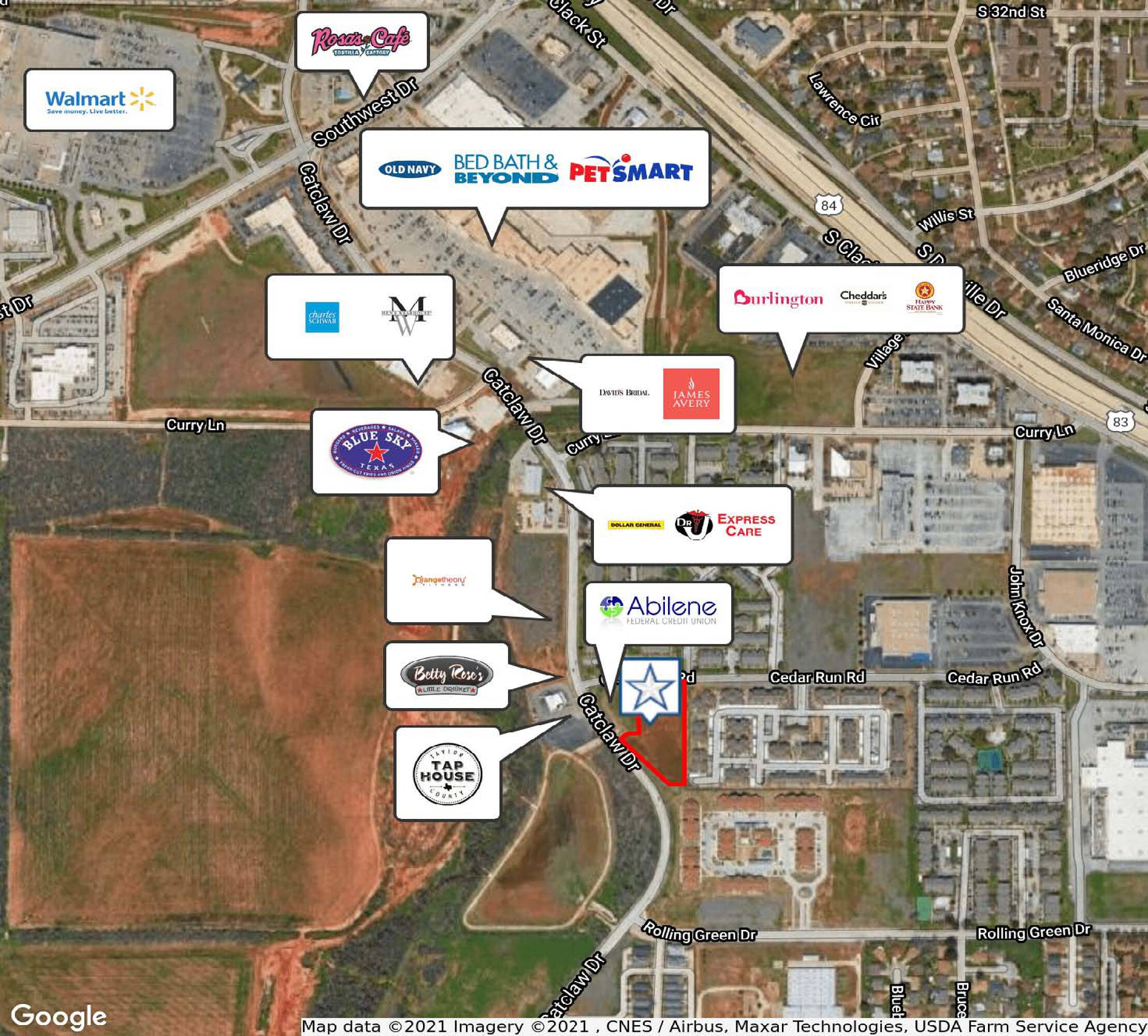 This commercial land wraps around Texas Tech Federal Credit Union. It offers access and visibility on both Catclaw Drive and Cedar Run Road. The property is located near the Shops of Abilene Shopping Center along Catclaw Drive. Specifically, it is situated west of Academy along Cedar Run Road, at the intersection of Catclaw Drive and Cedar Run Road.